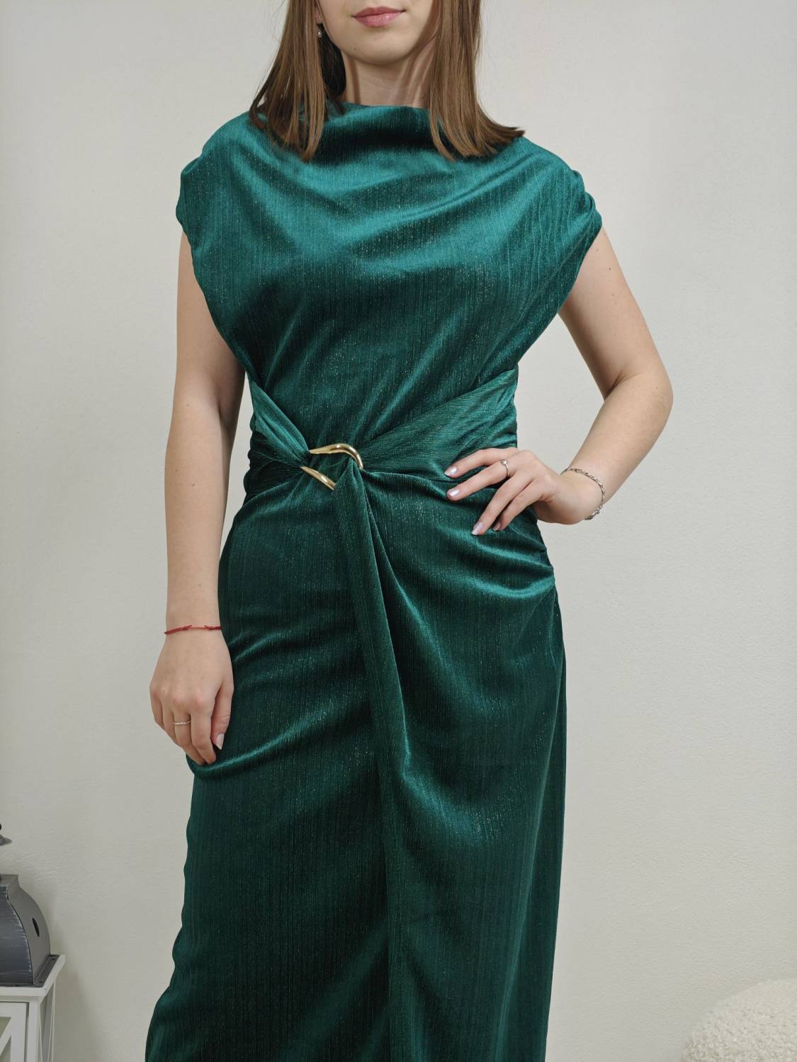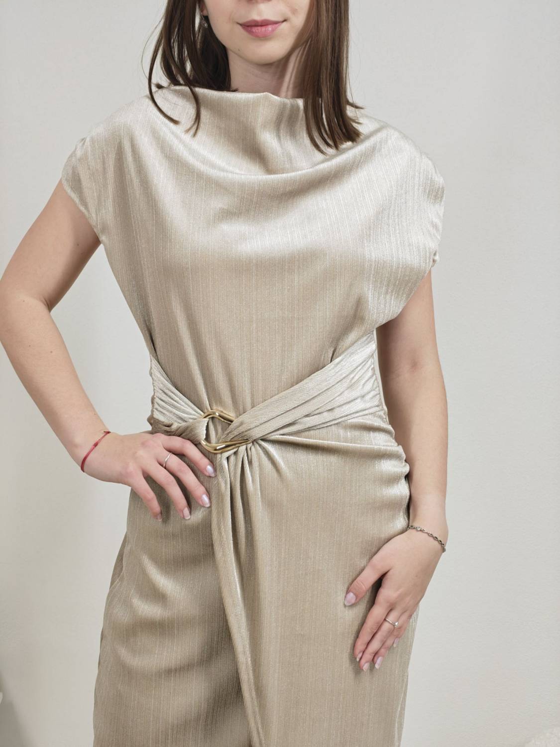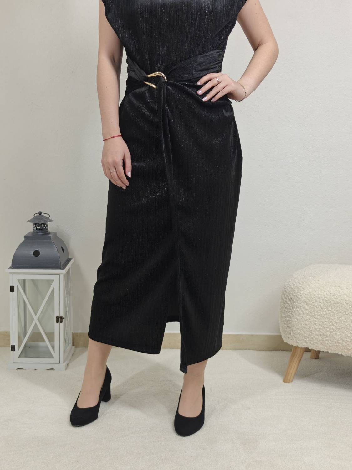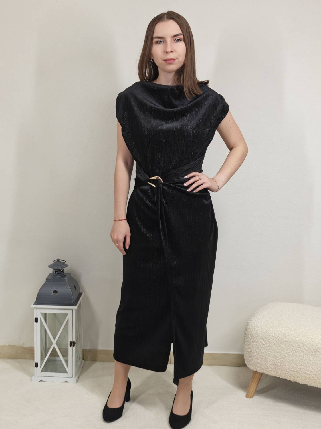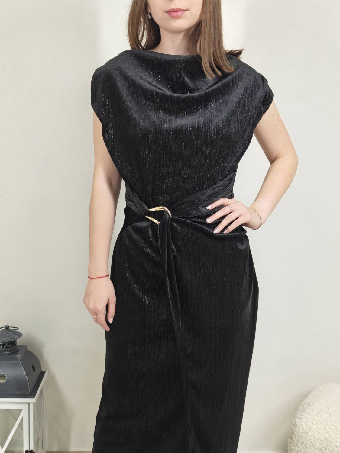 Jednofarebné velúrové šaty bez rukávov s lurexovou nitkou, majú ozdobnú sponu zlatej farby.
