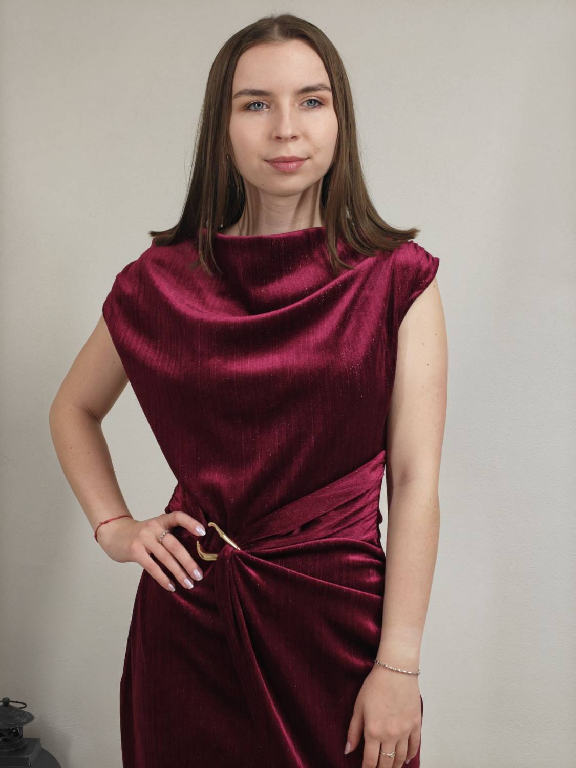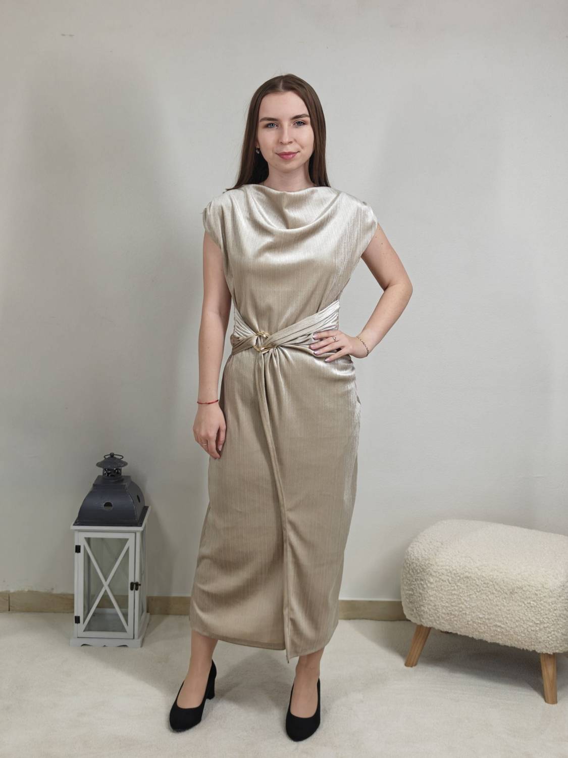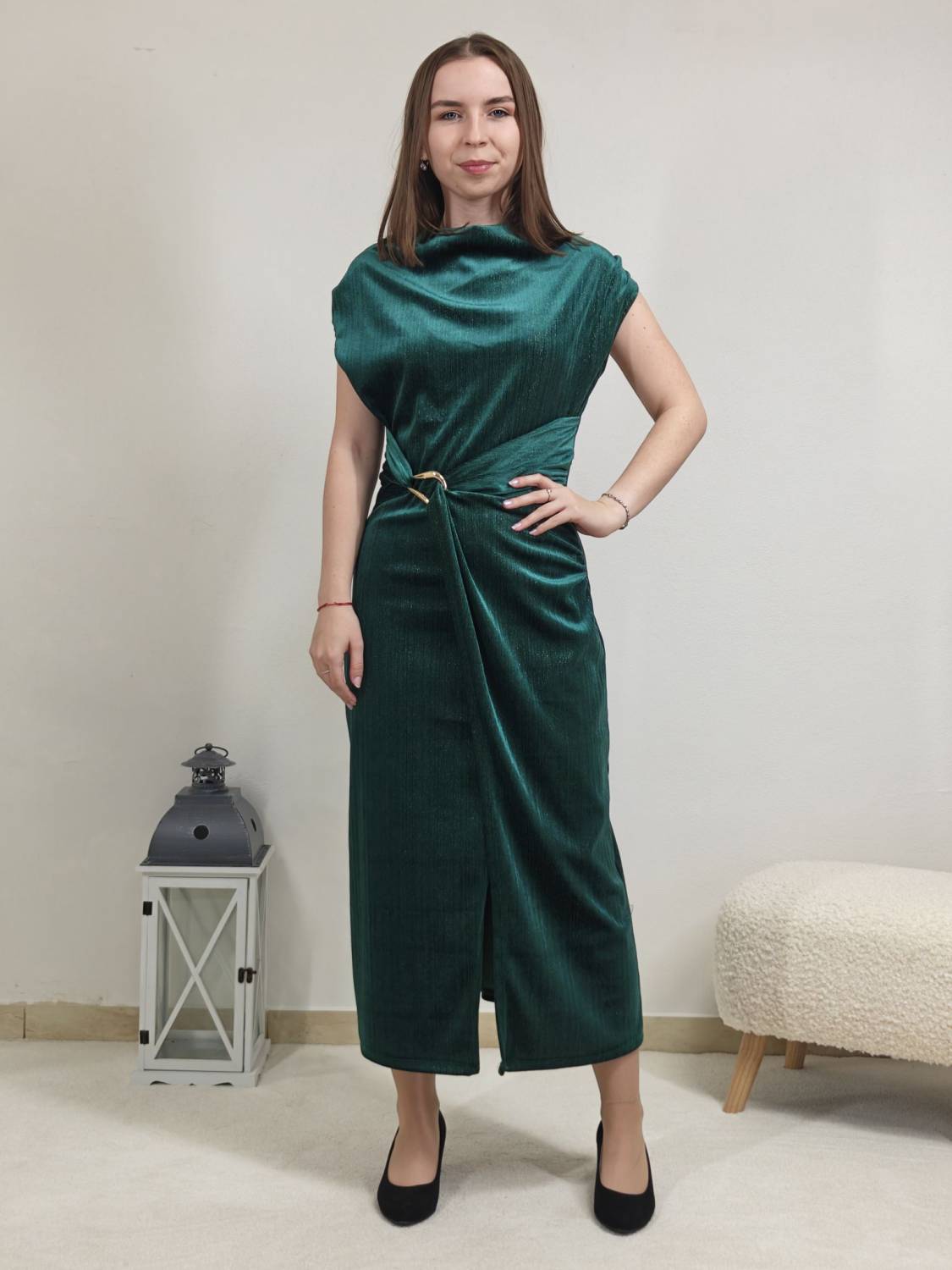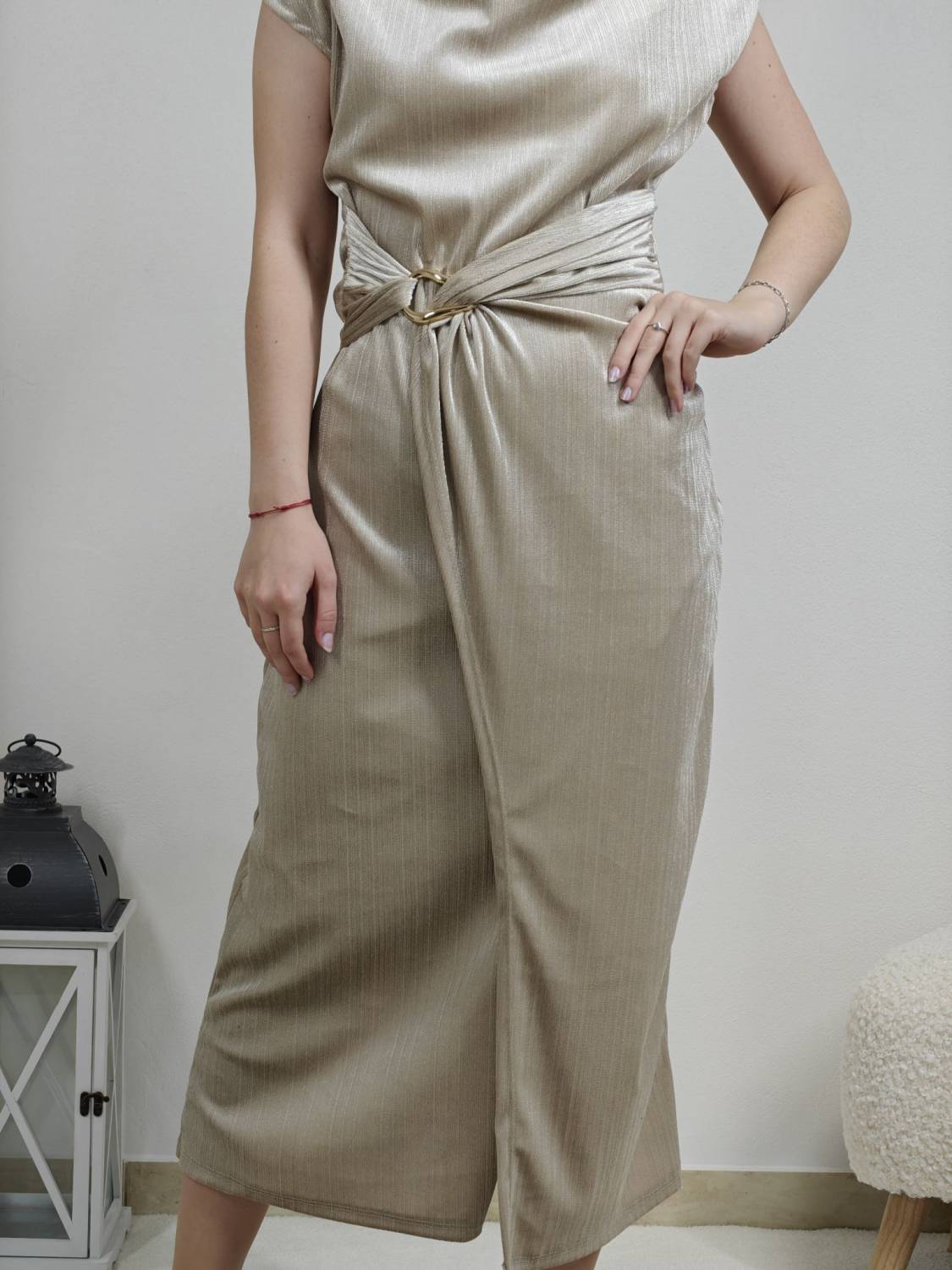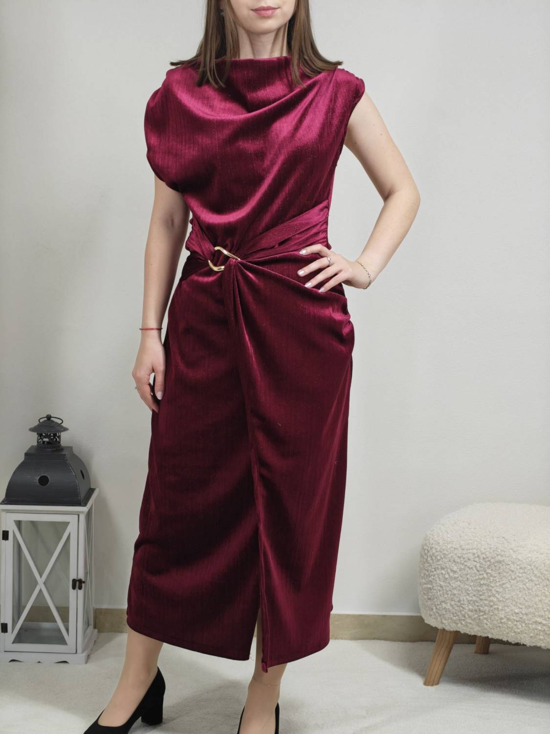 Jednofarebné velúrové šaty bez rukávov s lurexovou nitkou, majú ozdobnú sponu zlatej farby.