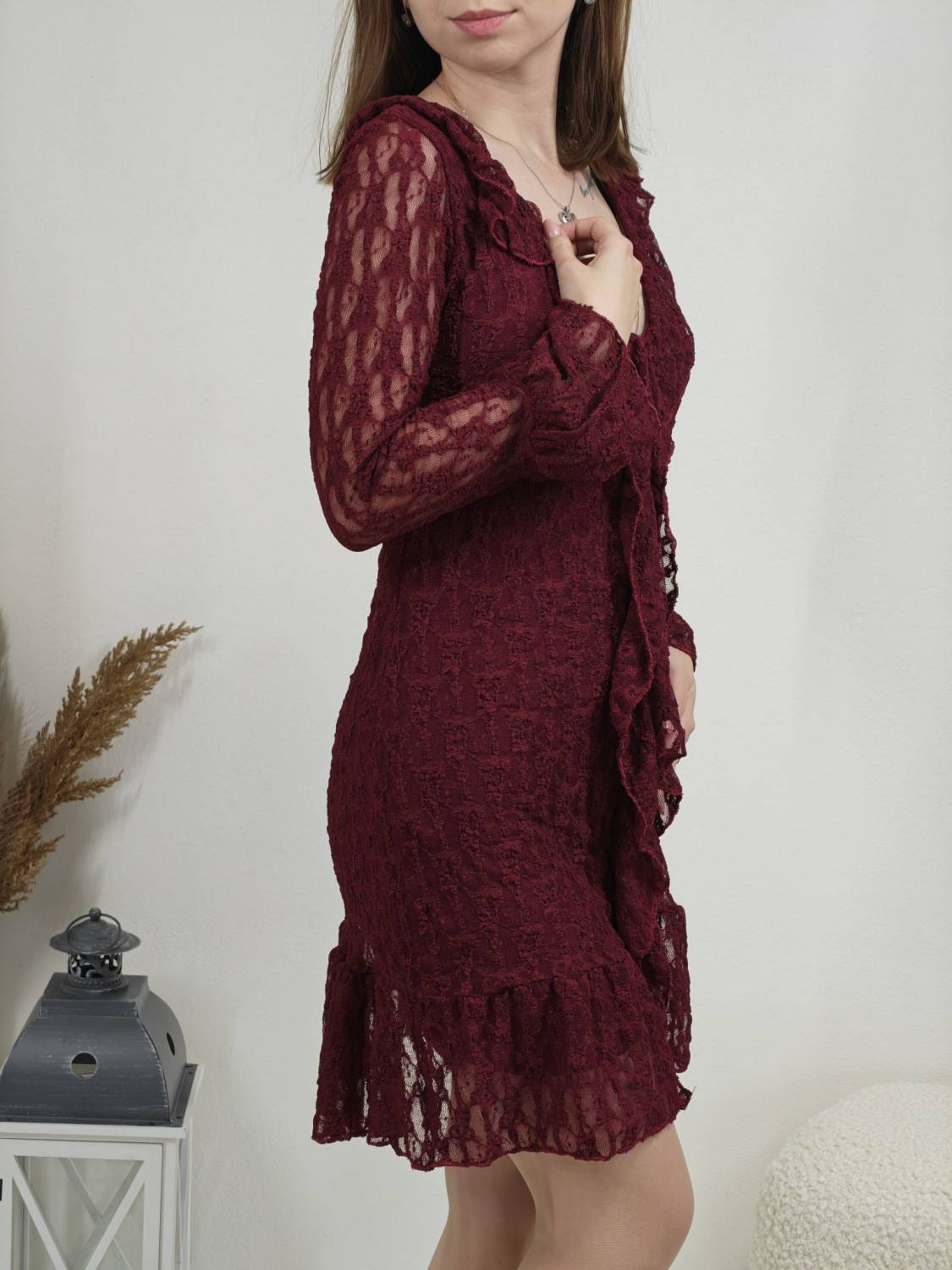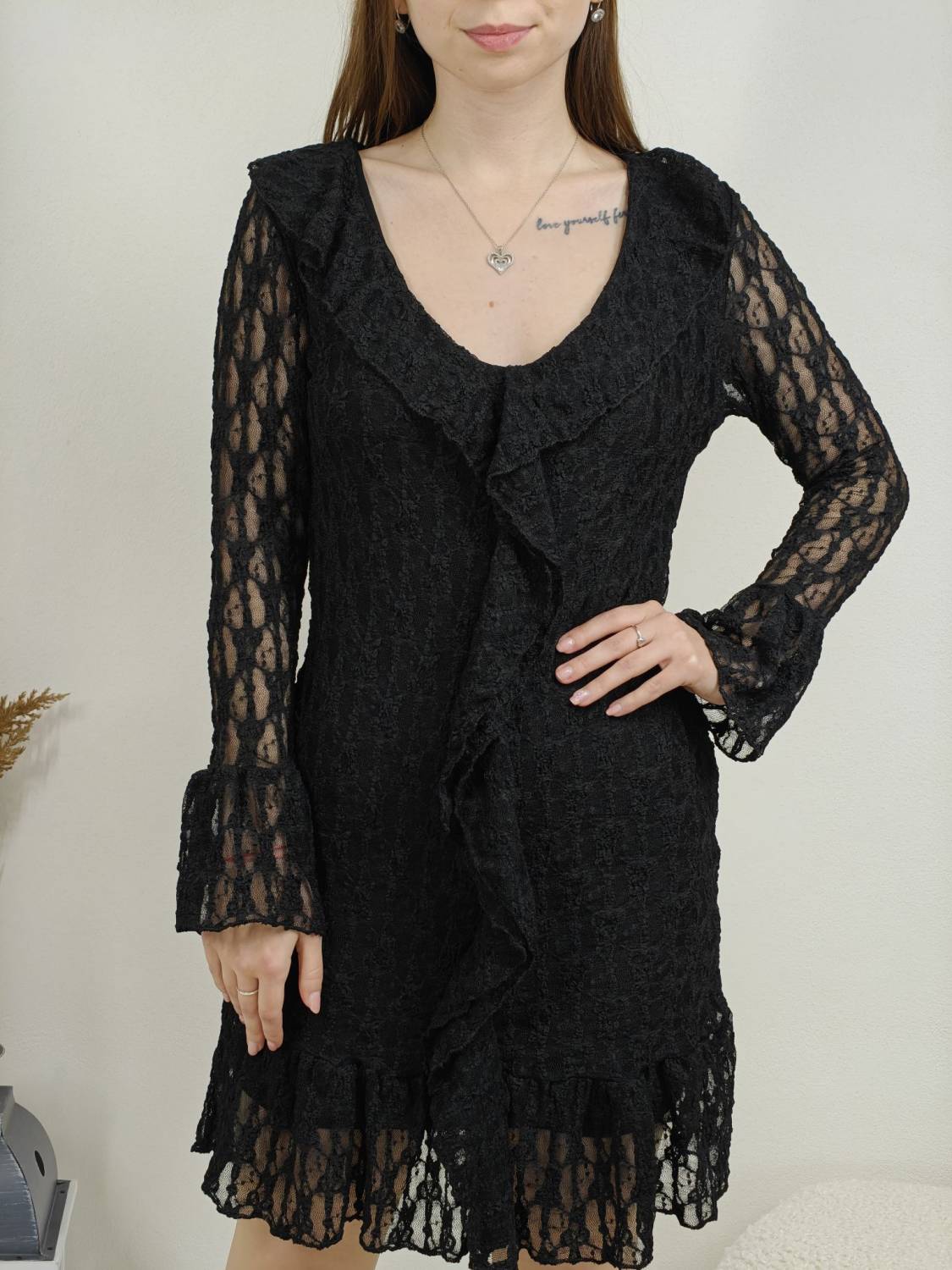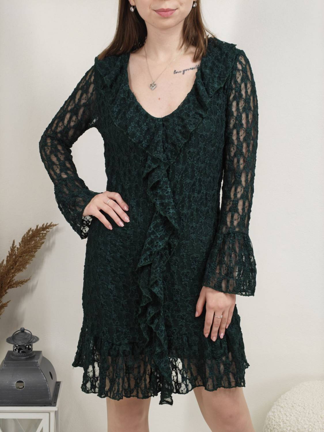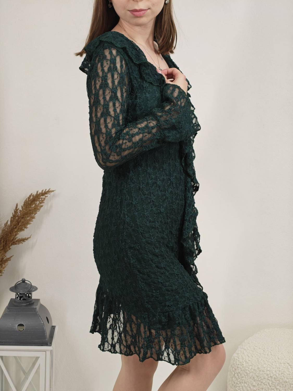 Krajkové šaty so žabó na prsiach. Rukáv je jemne transparentný, zakončený volánom. Volán je aj v spodnej časti šiat, ktoré sú podšité, takže nepresvitajú.