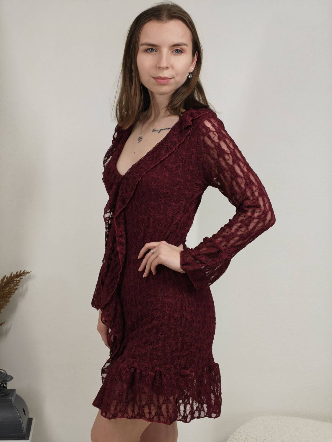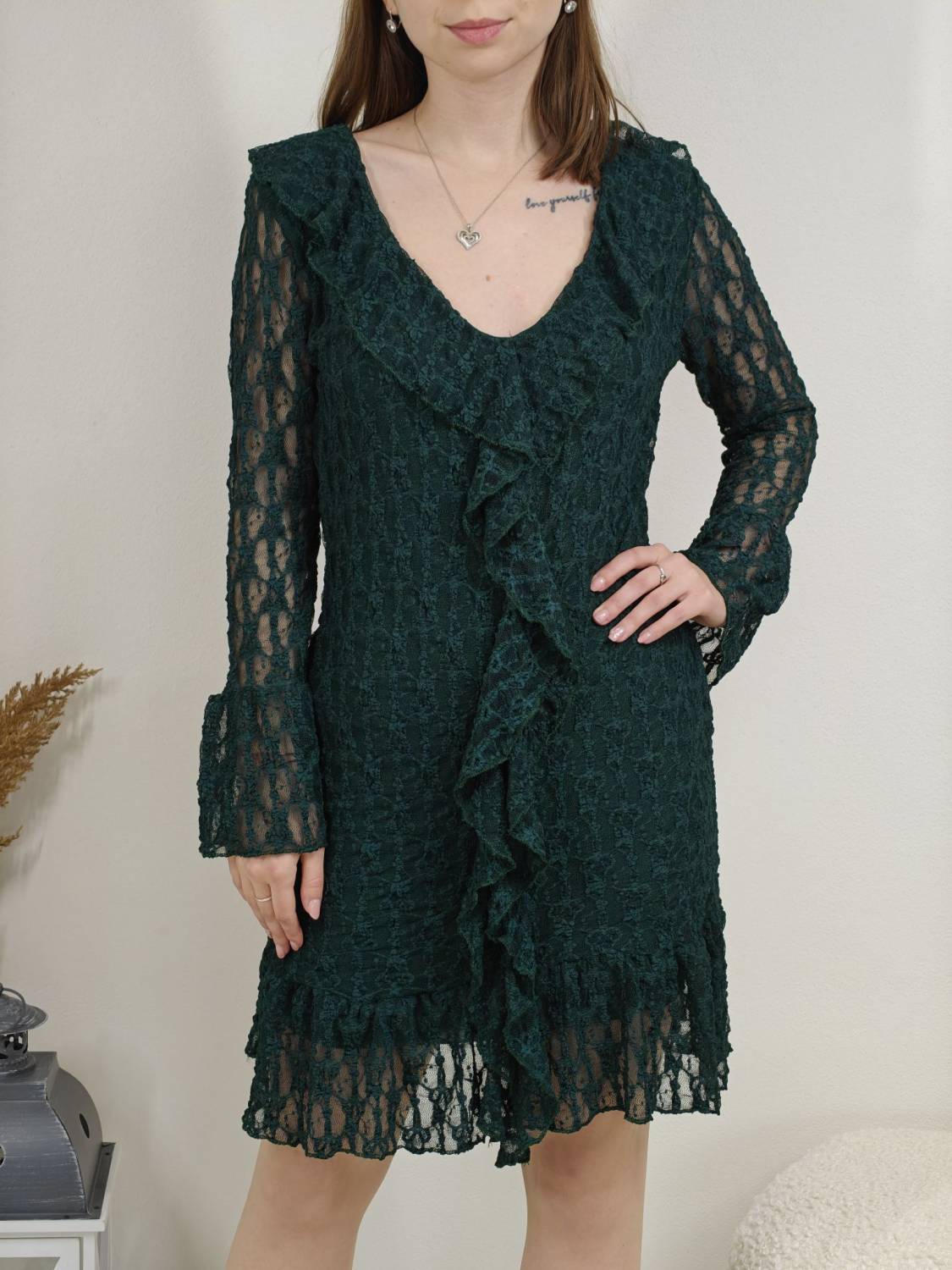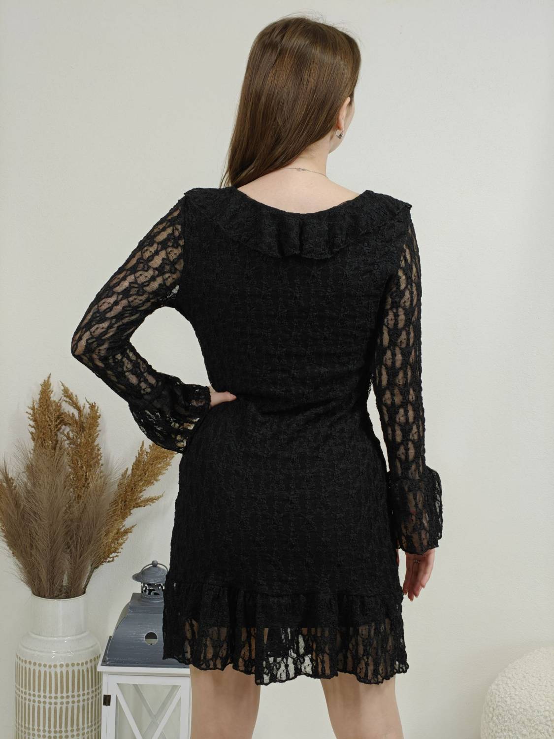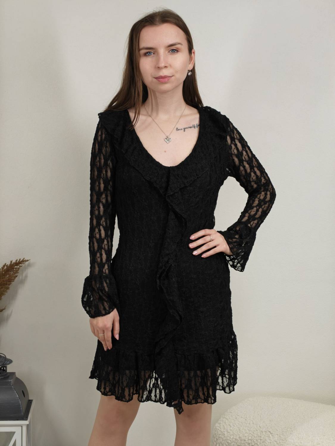 Krajkové šaty so žabó na prsiach. Rukáv je jemne transparentný, zakončený volánom. Volán je aj v spodnej časti šiat, ktoré sú podšité, takže nepresvitajú.