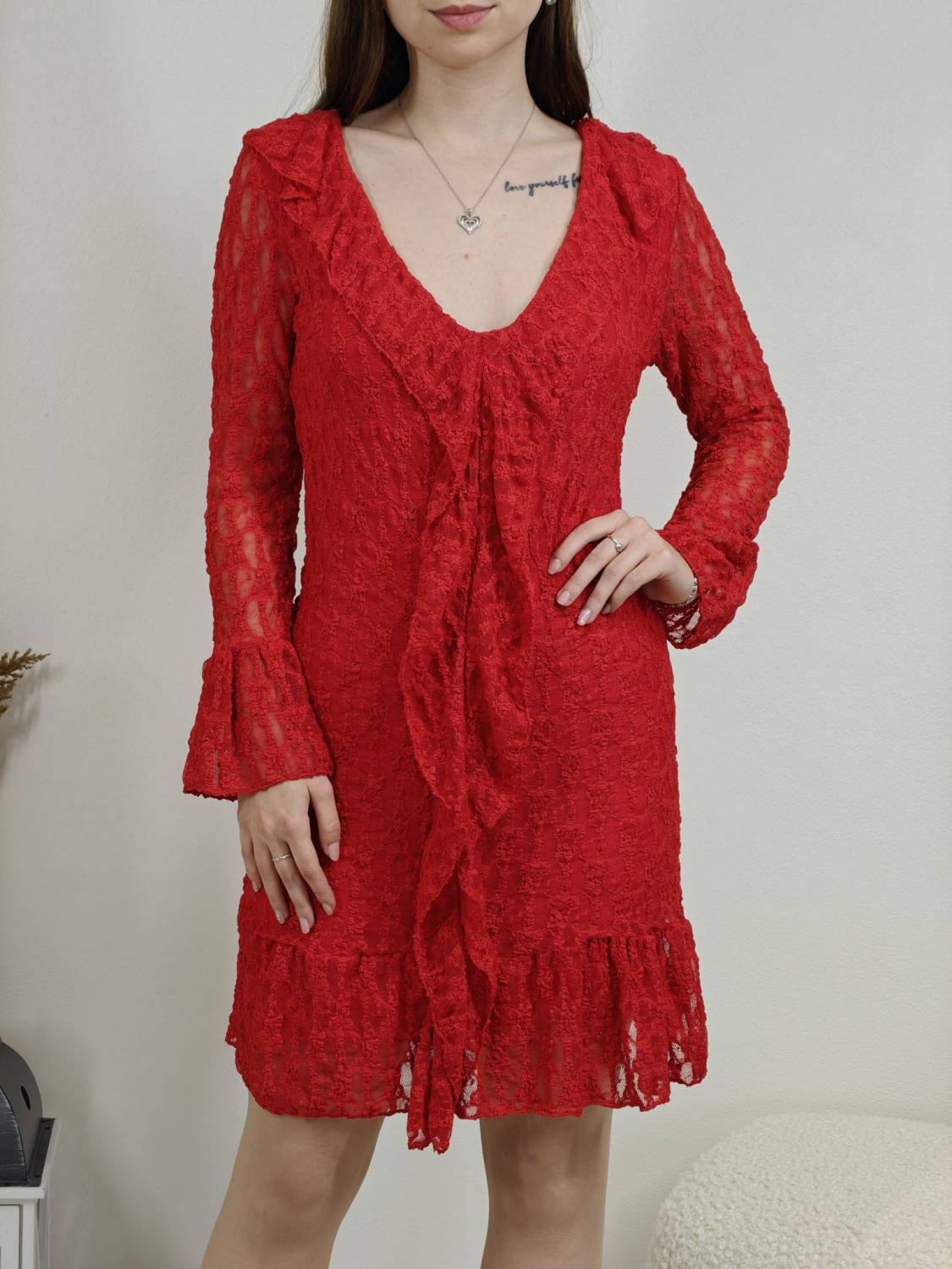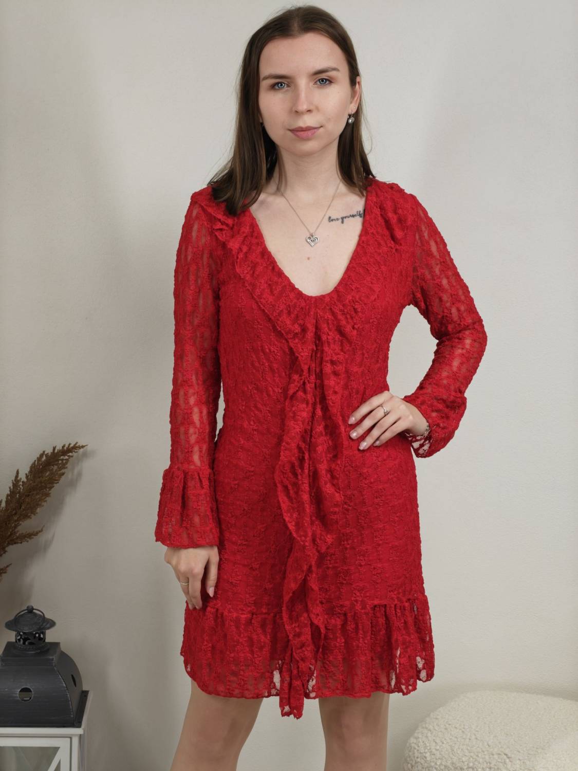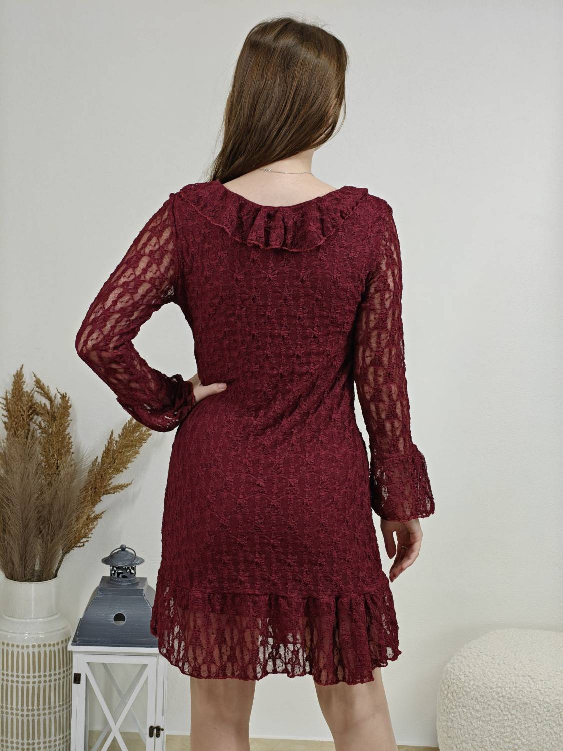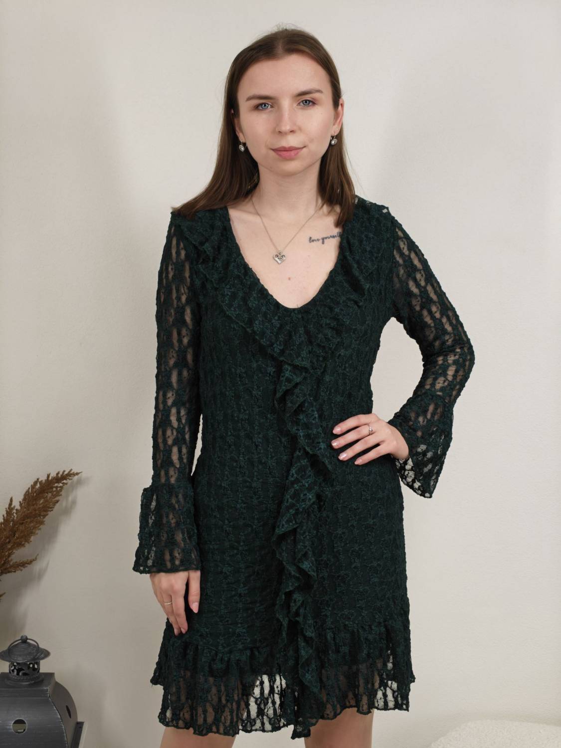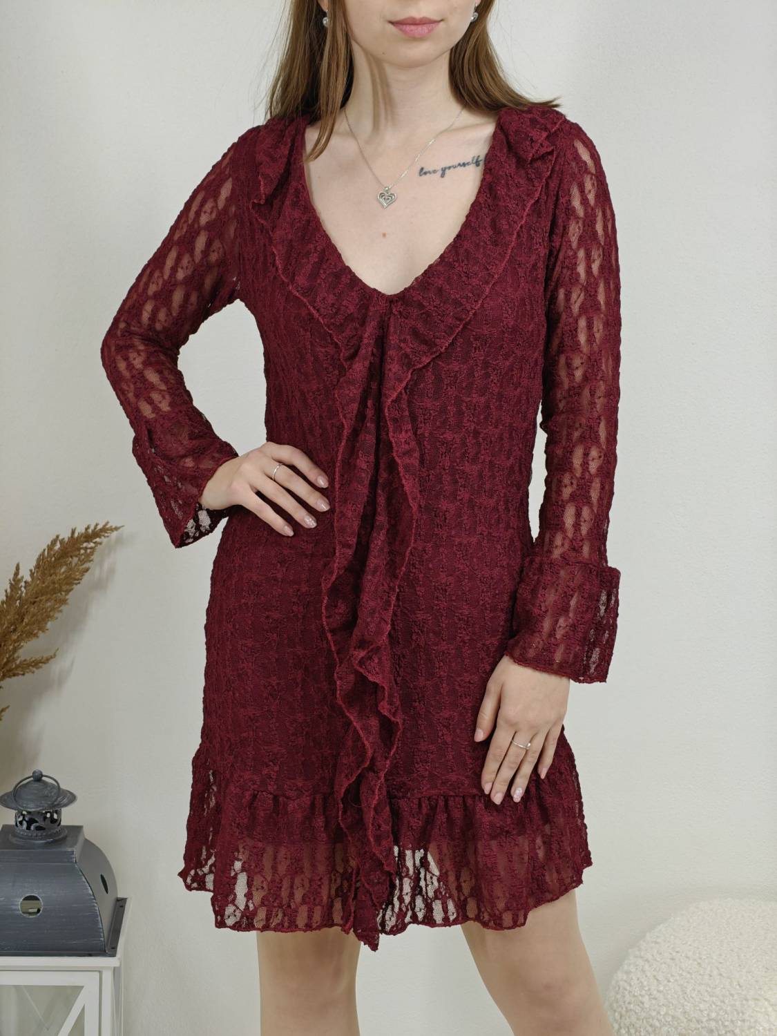 Krajkové šaty so žabó na prsiach. Rukáv je jemne transparentný, zakončený volánom. Volán je aj v spodnej časti šiat, ktoré sú podšité, takže nepresvitajú.