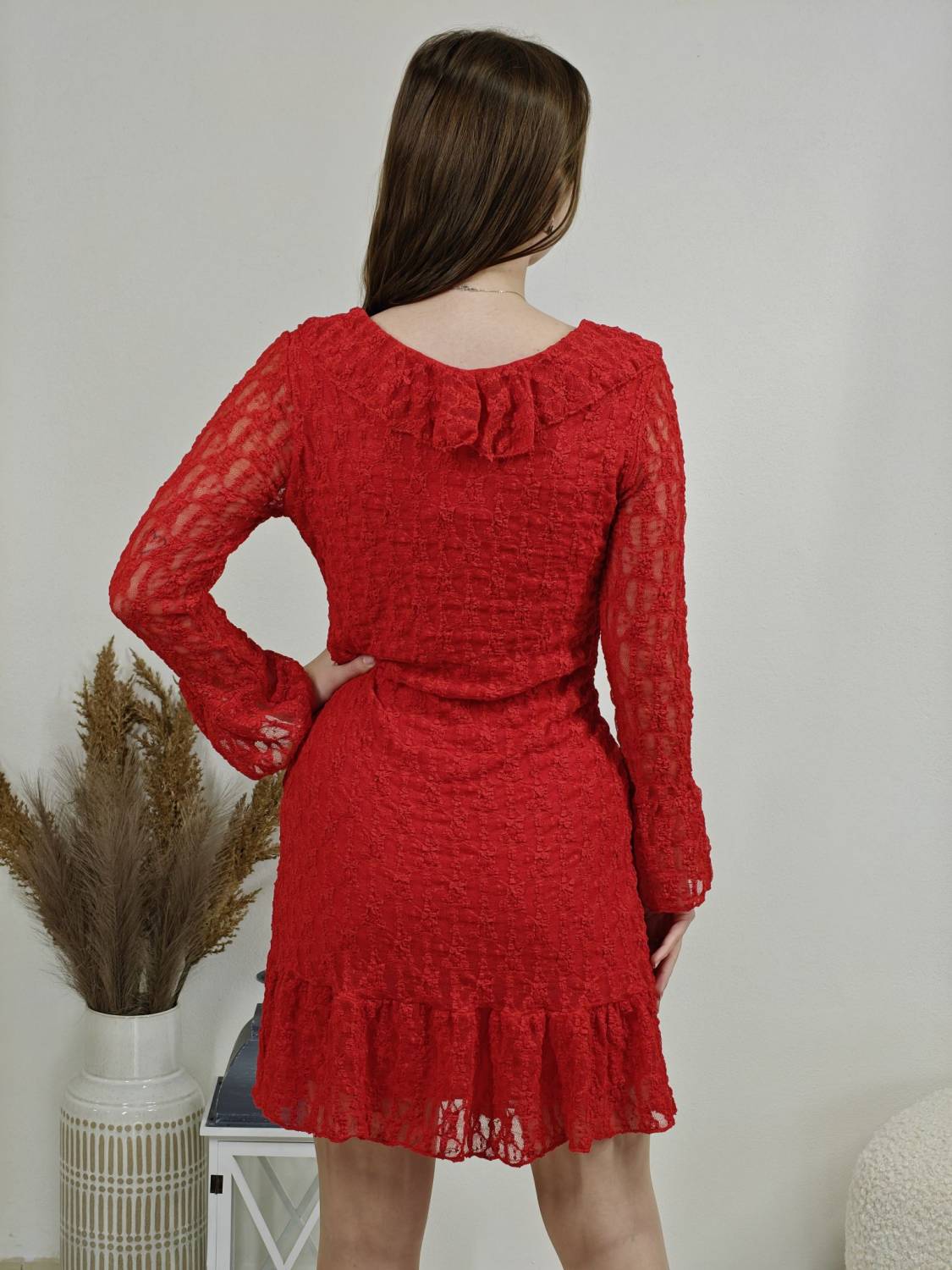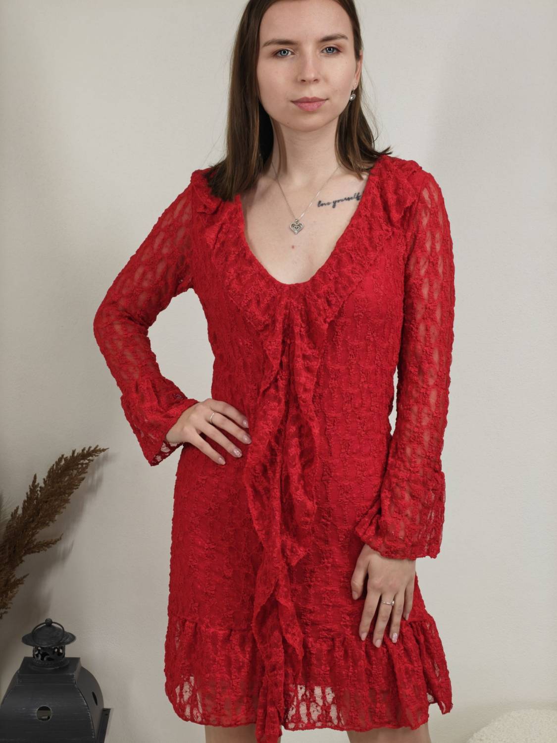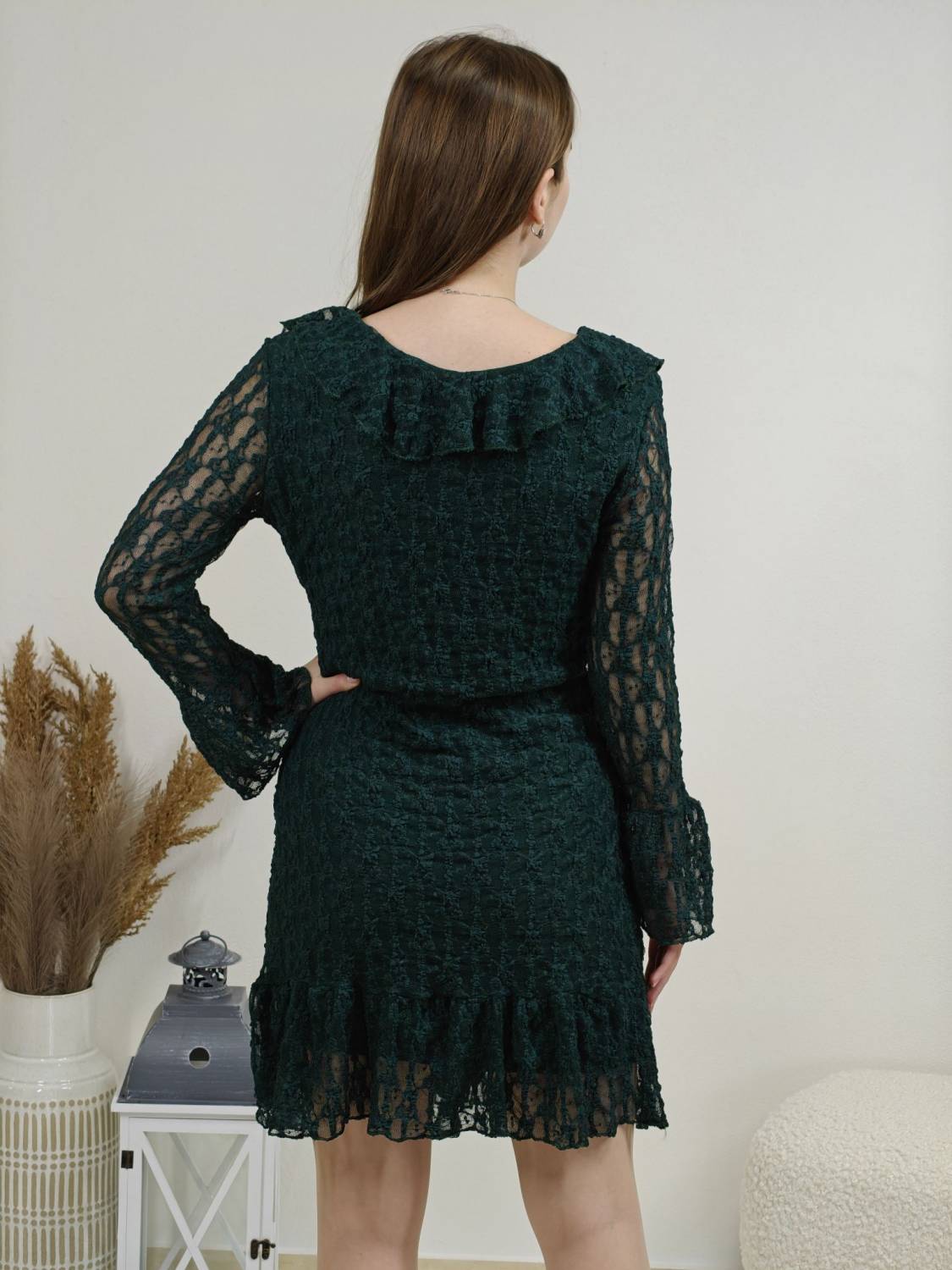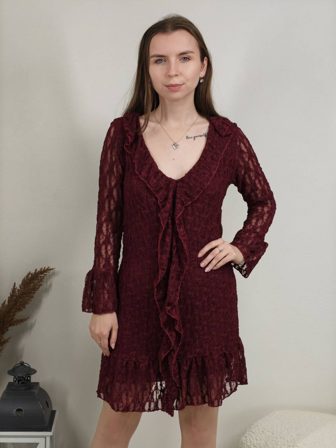 Krajkové šaty so žabó na prsiach. Rukáv je jemne transparentný, zakončený volánom. Volán je aj v spodnej časti šiat, ktoré sú podšité, takže nepresvitajú.