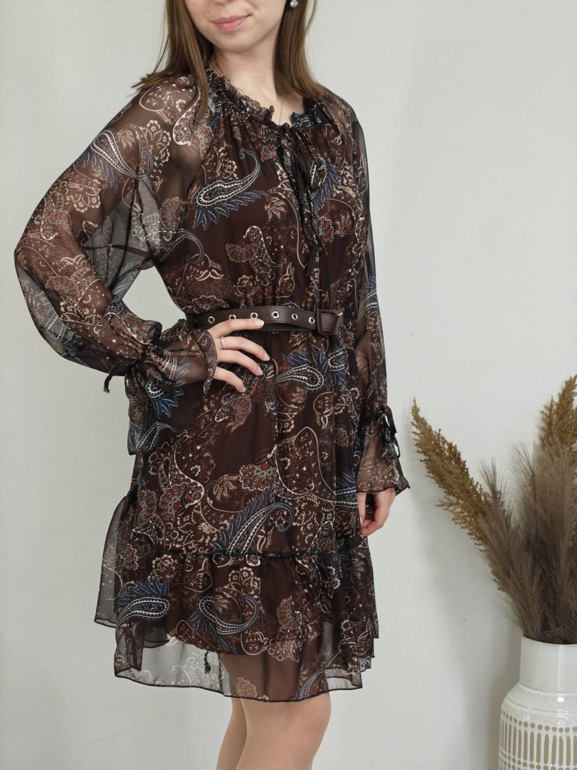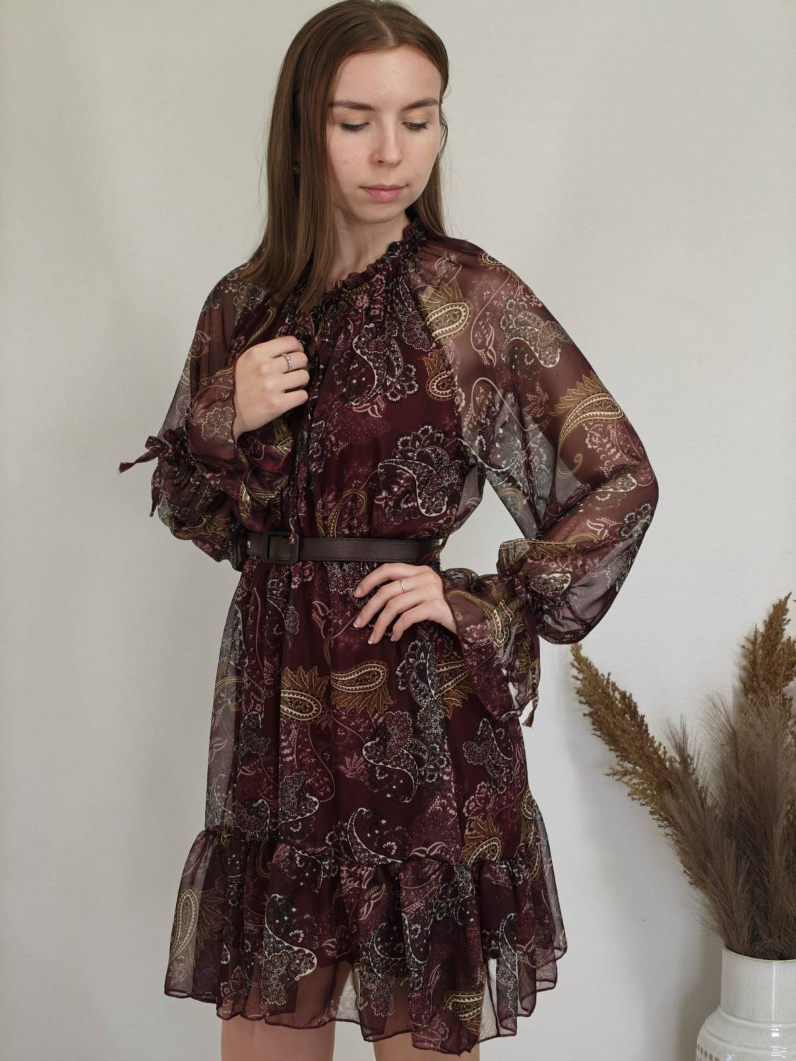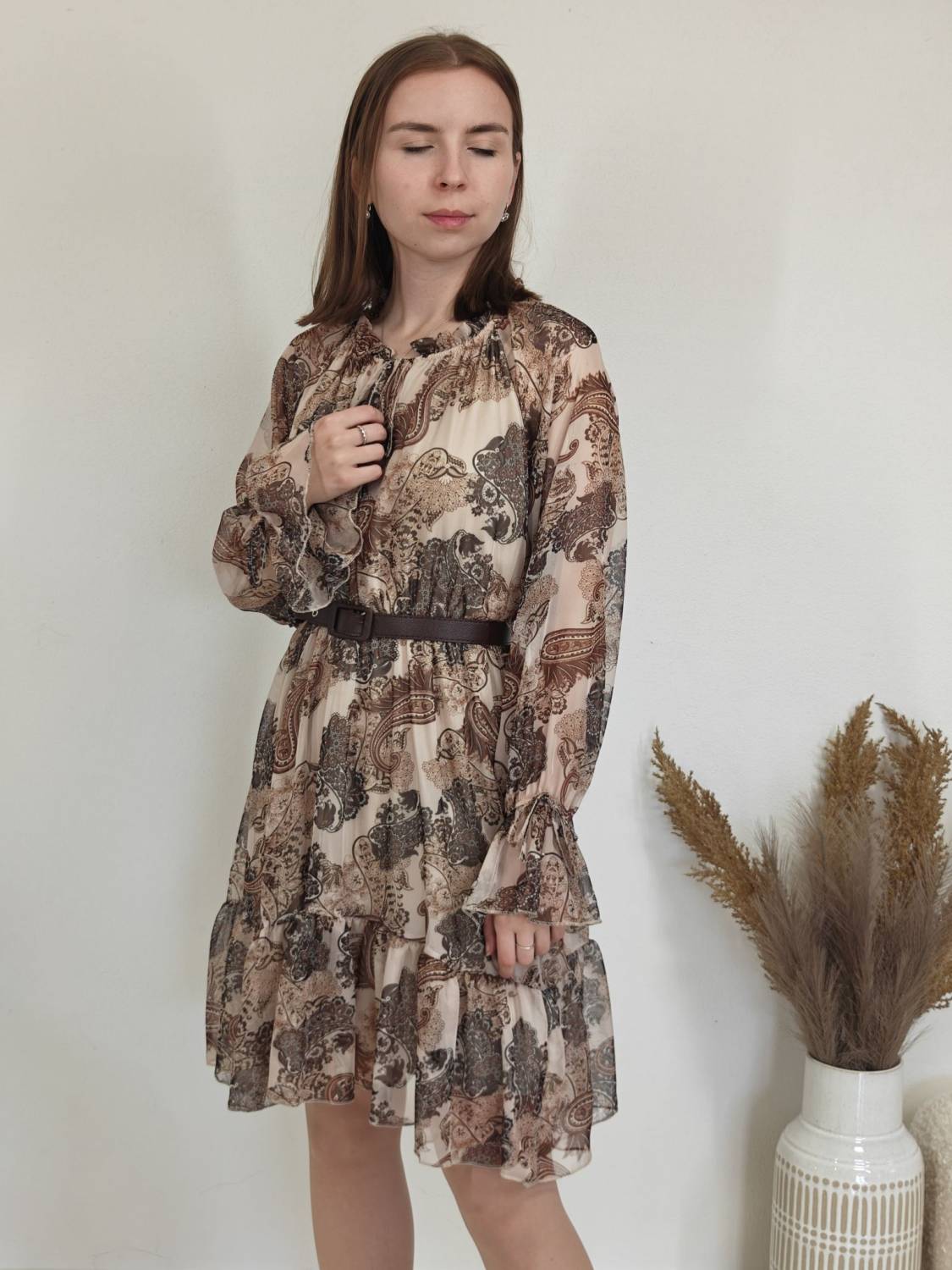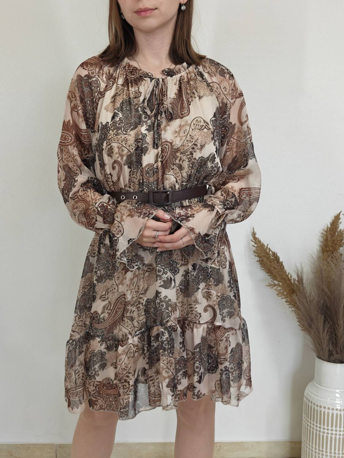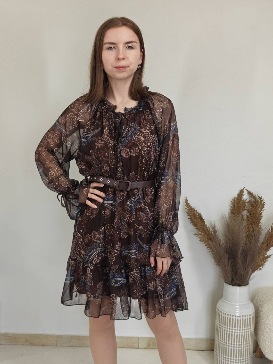 Šaty s abstraktným vzorom, prestrihnuté v páse a do gumičky. Rukáv je zakončený tiež gumičkou a má volán. Šaty majú spodničku. opasok je súčasťou šiat