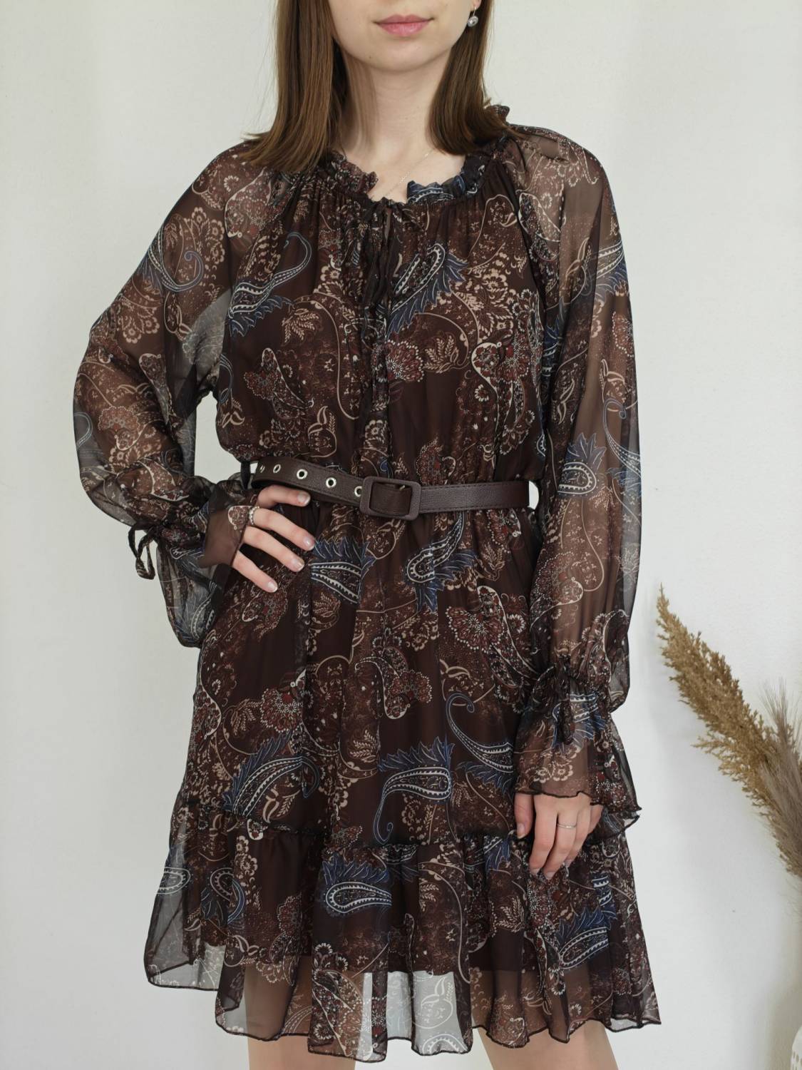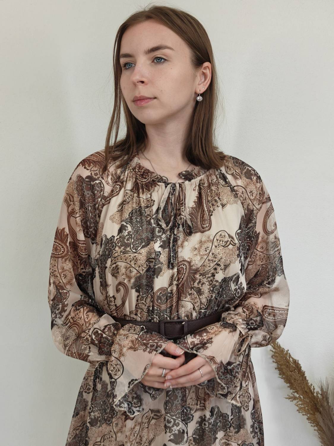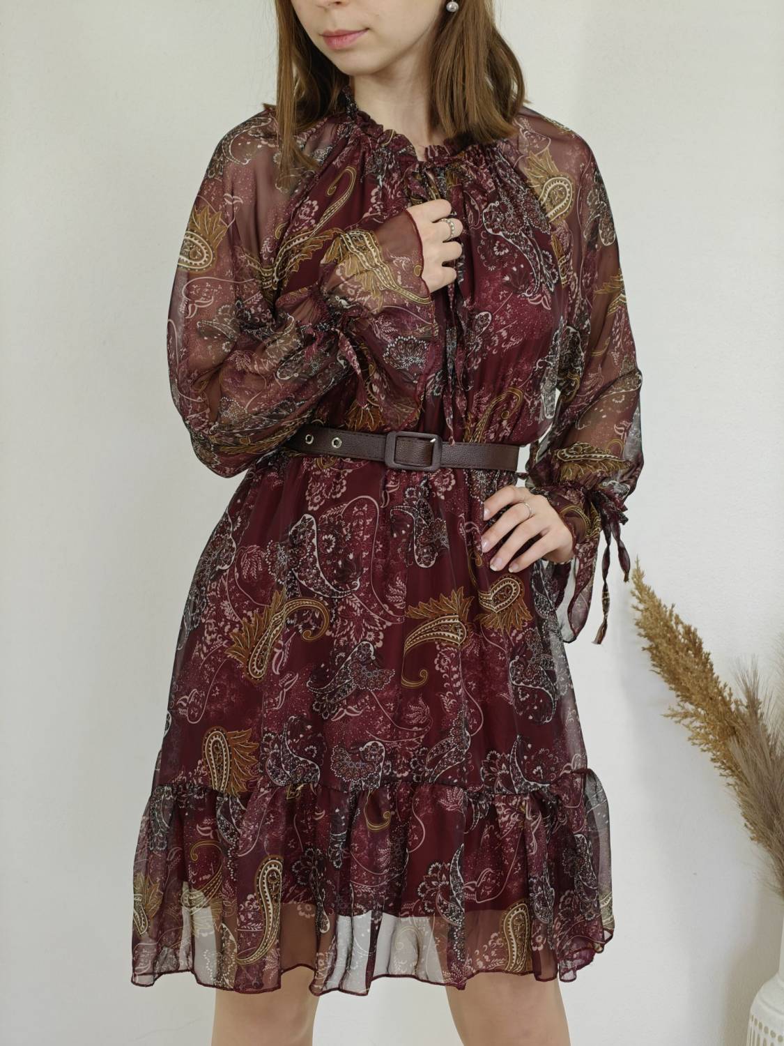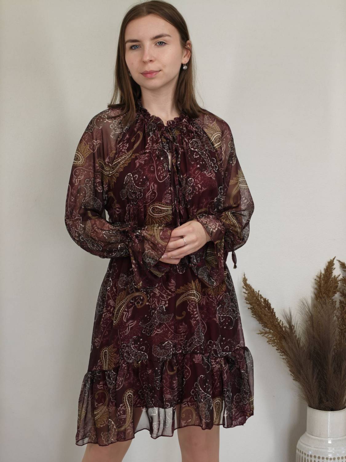 Šaty s abstraktným vzorom, prestrihnuté v páse a do gumičky. Rukáv je zakončený tiež gumičkou a má volán. Šaty majú spodničku. opasok je súčasťou šiat