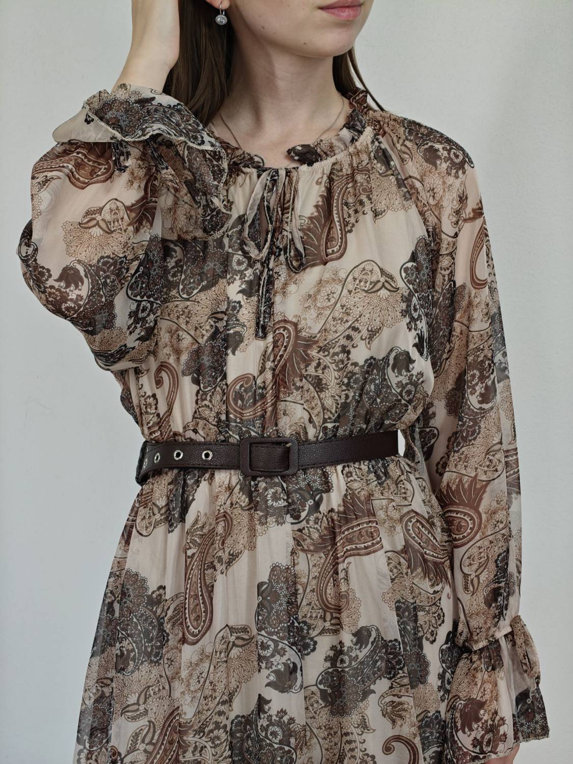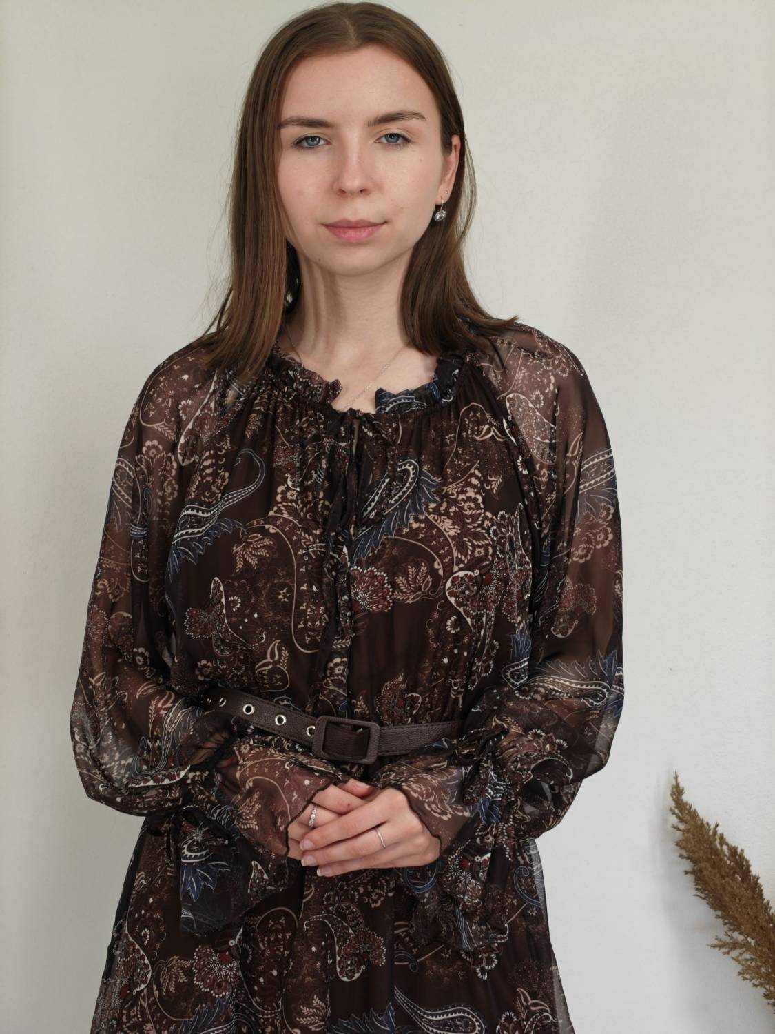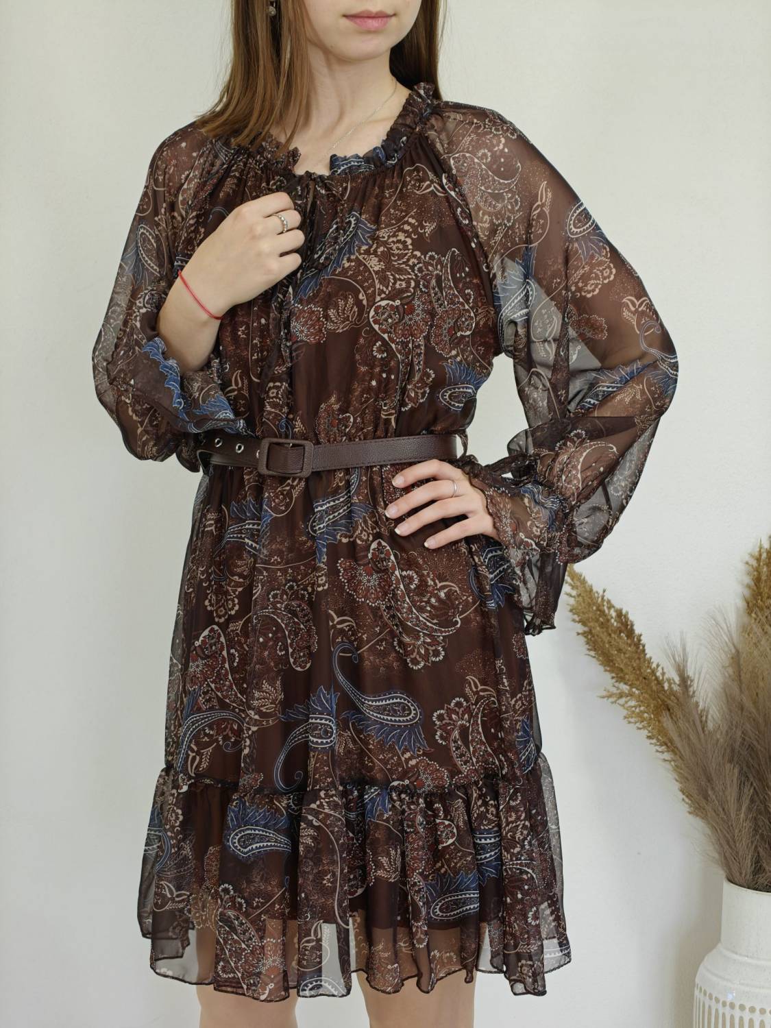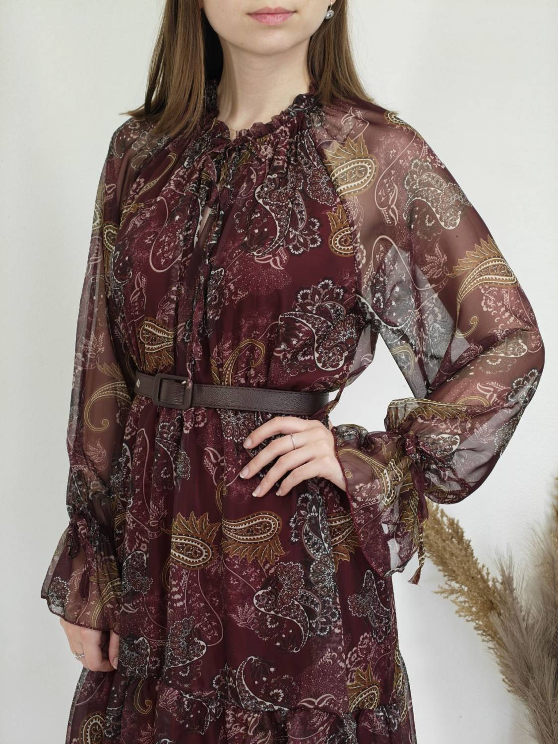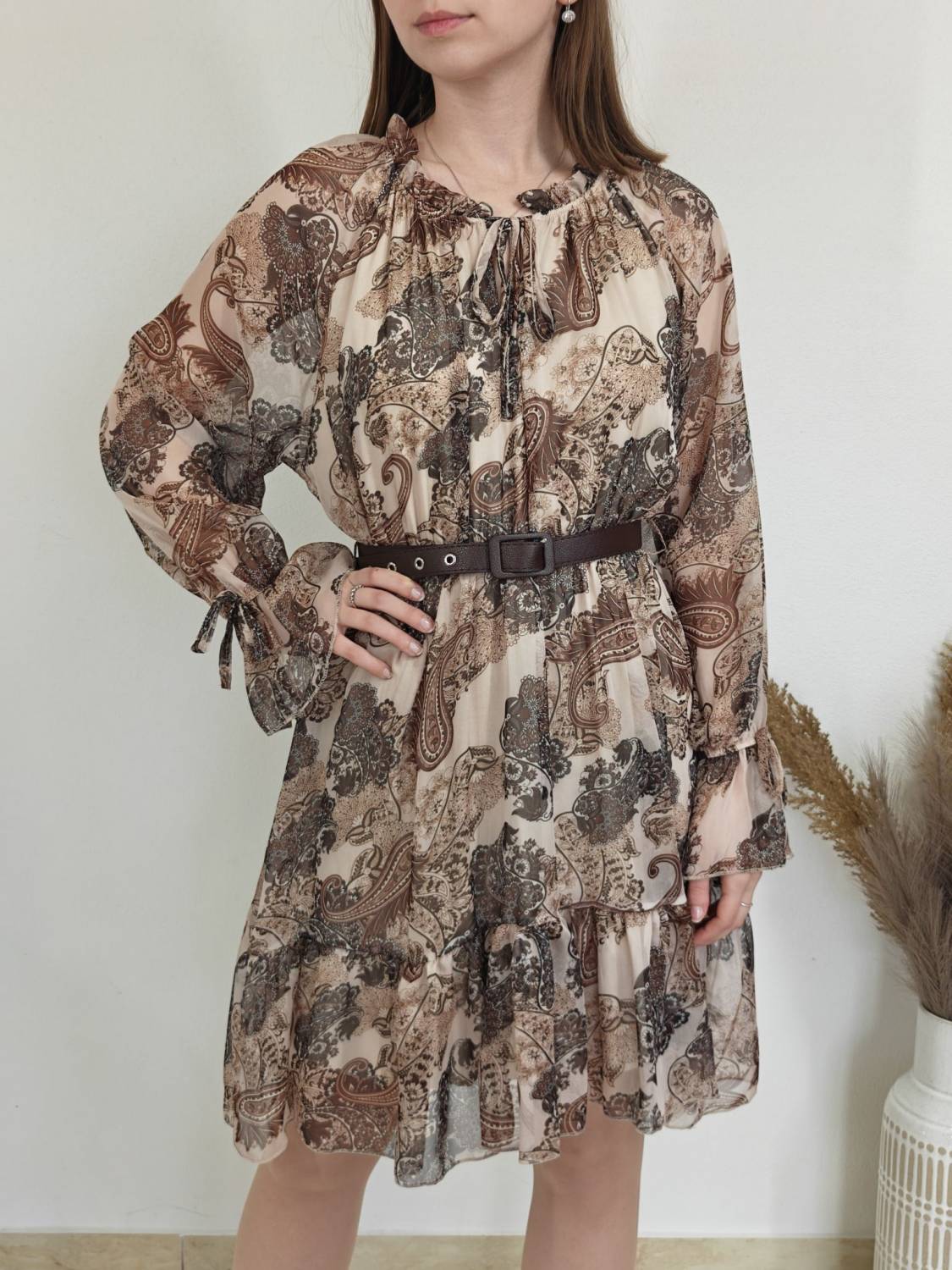 Šaty s abstraktným vzorom, prestrihnuté v páse a do gumičky. Rukáv je zakončený tiež gumičkou a má volán. Šaty majú spodničku. opasok je súčasťou šiat