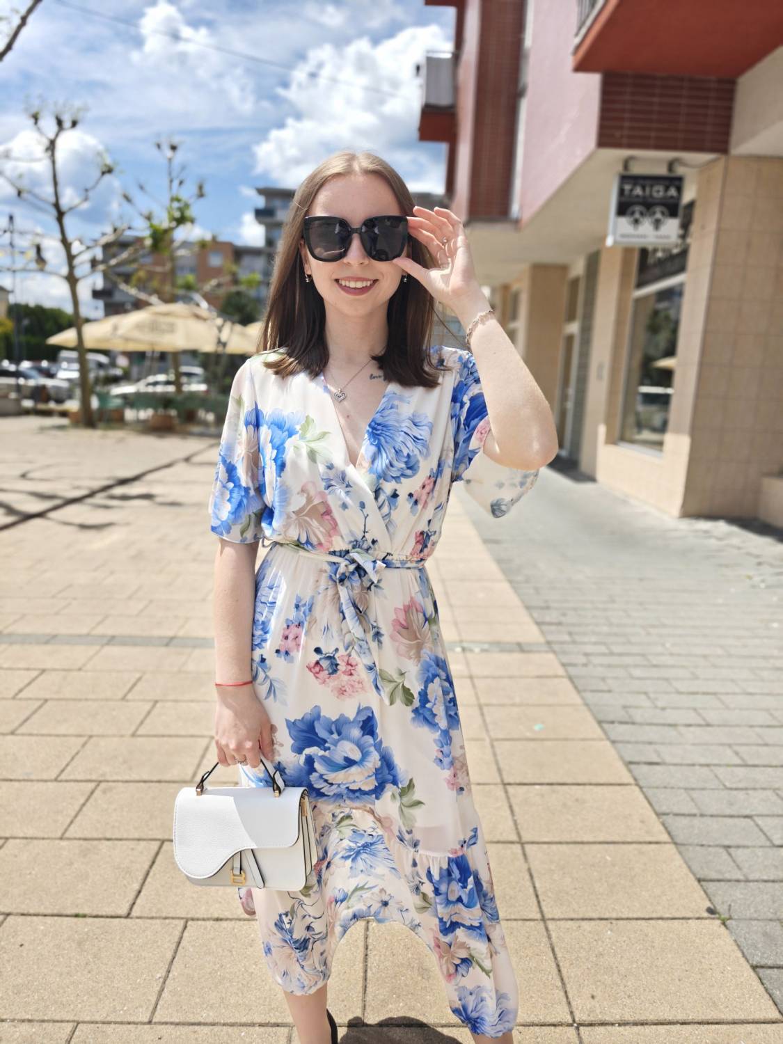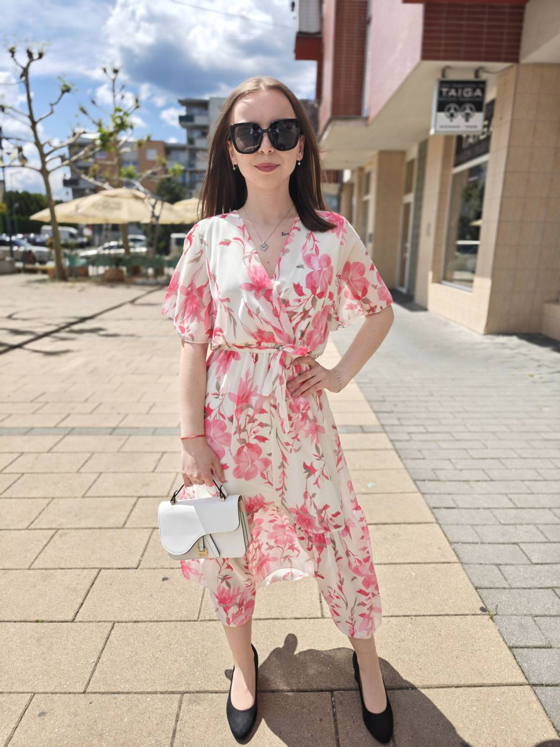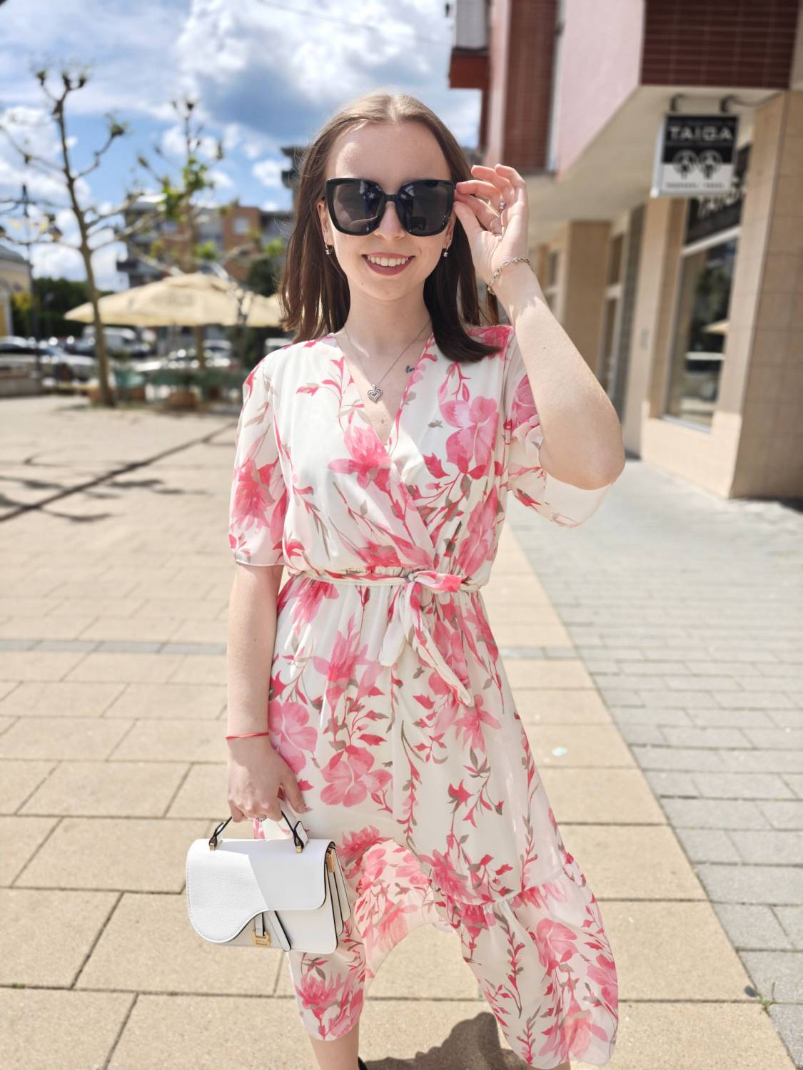 Romantické prekladané šaty s kvetovaným vzorom, v páse na gumičku, majú aj tenký opasok.