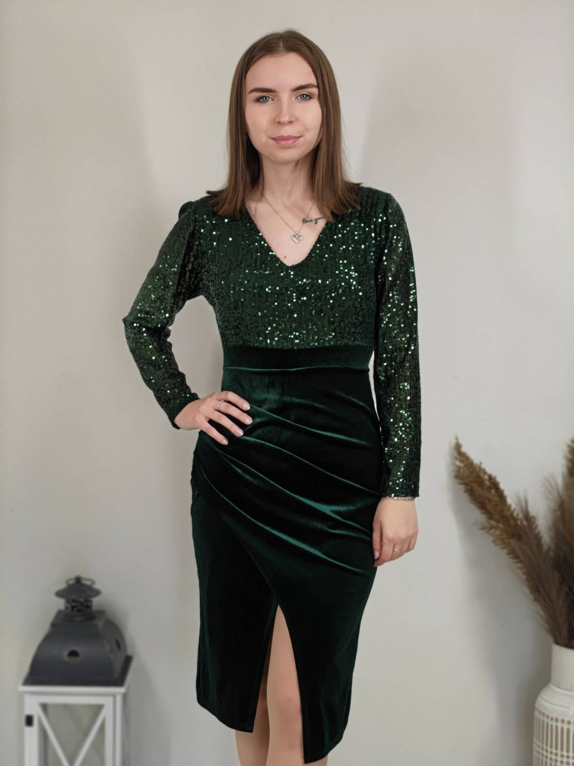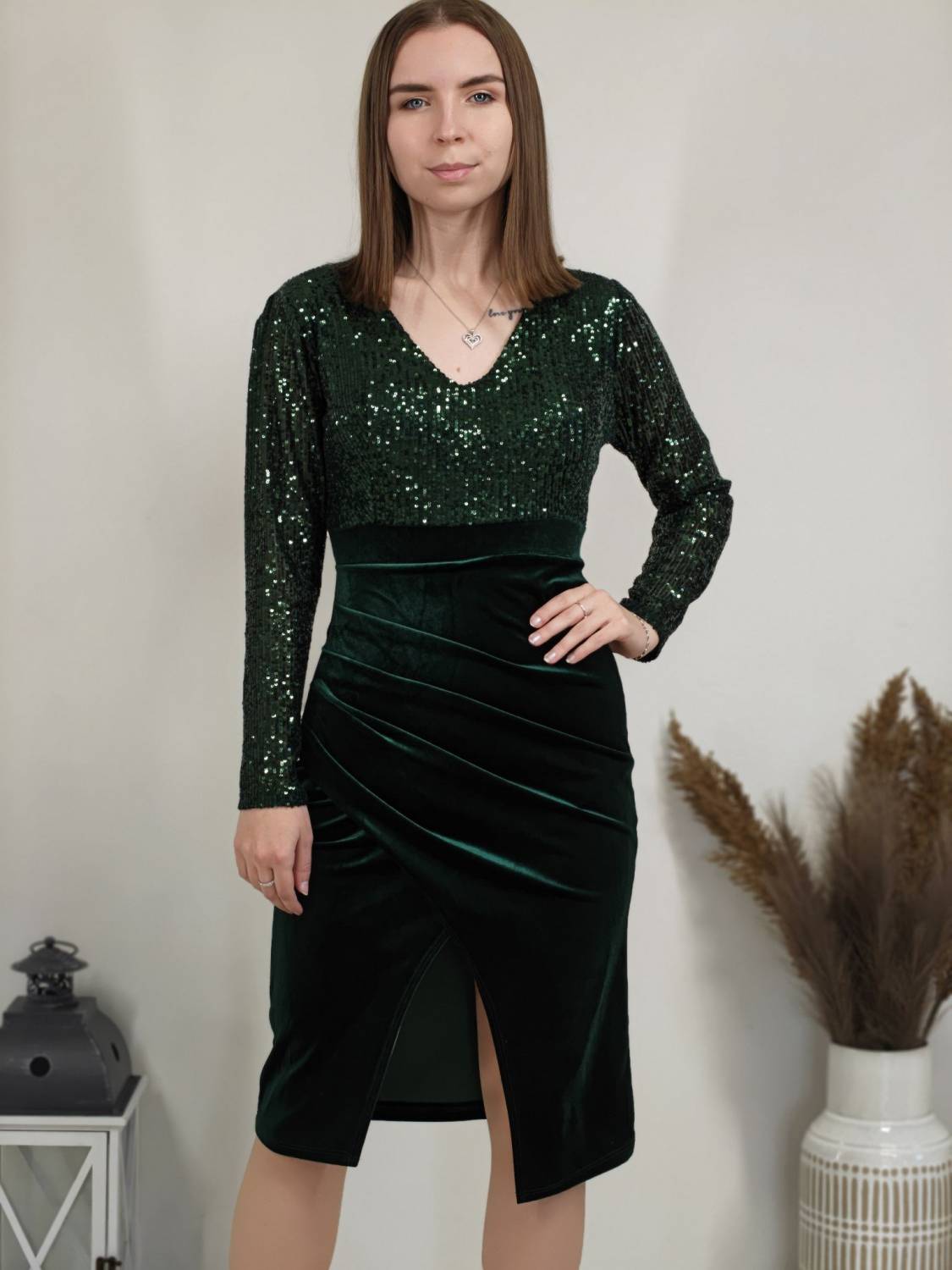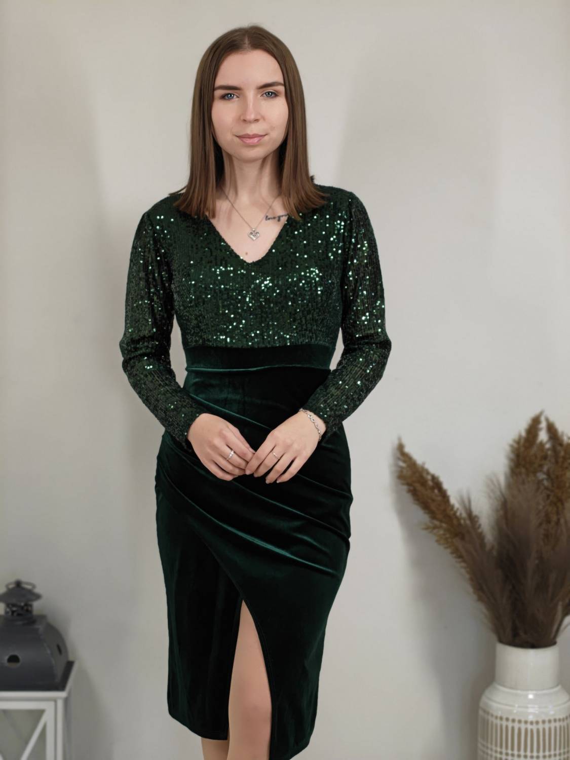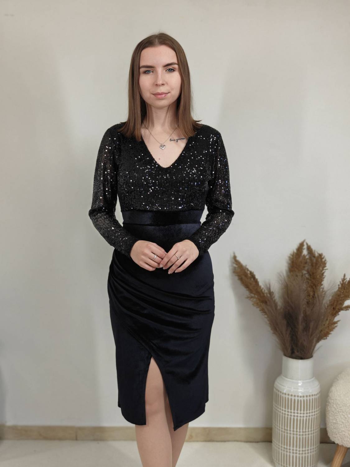 Jednofarebné velúrové šaty s flitrami v hornej časti, s jemným nariasením a rázporkom.