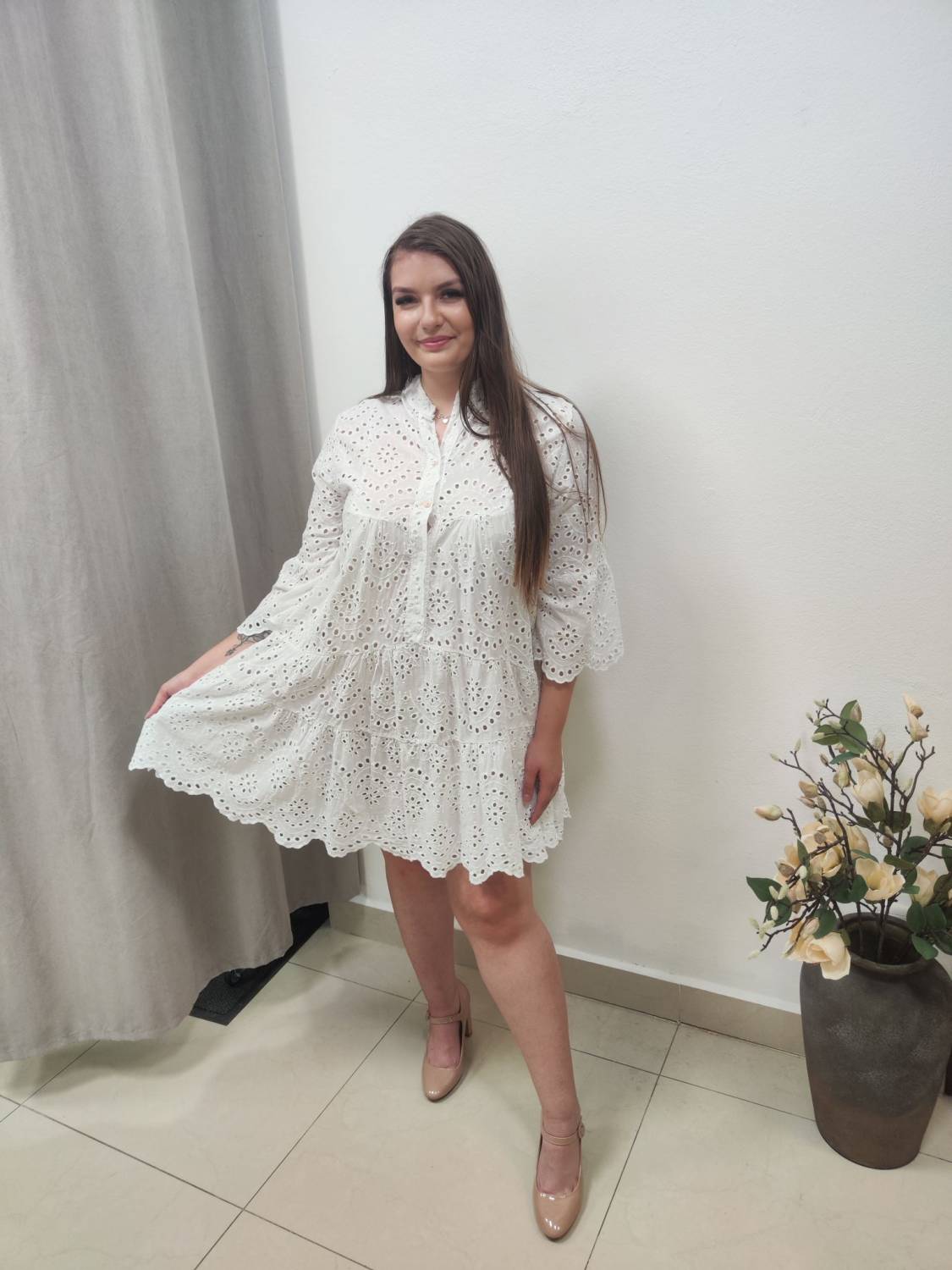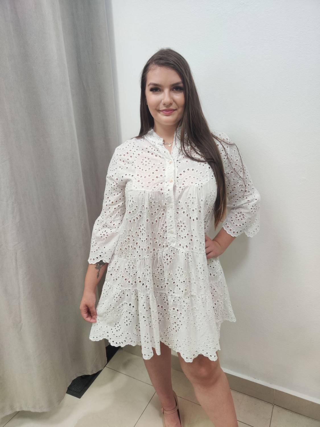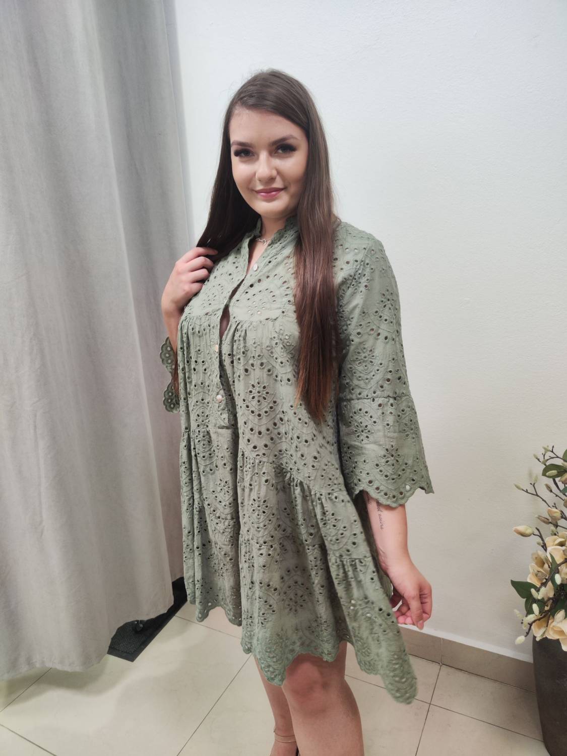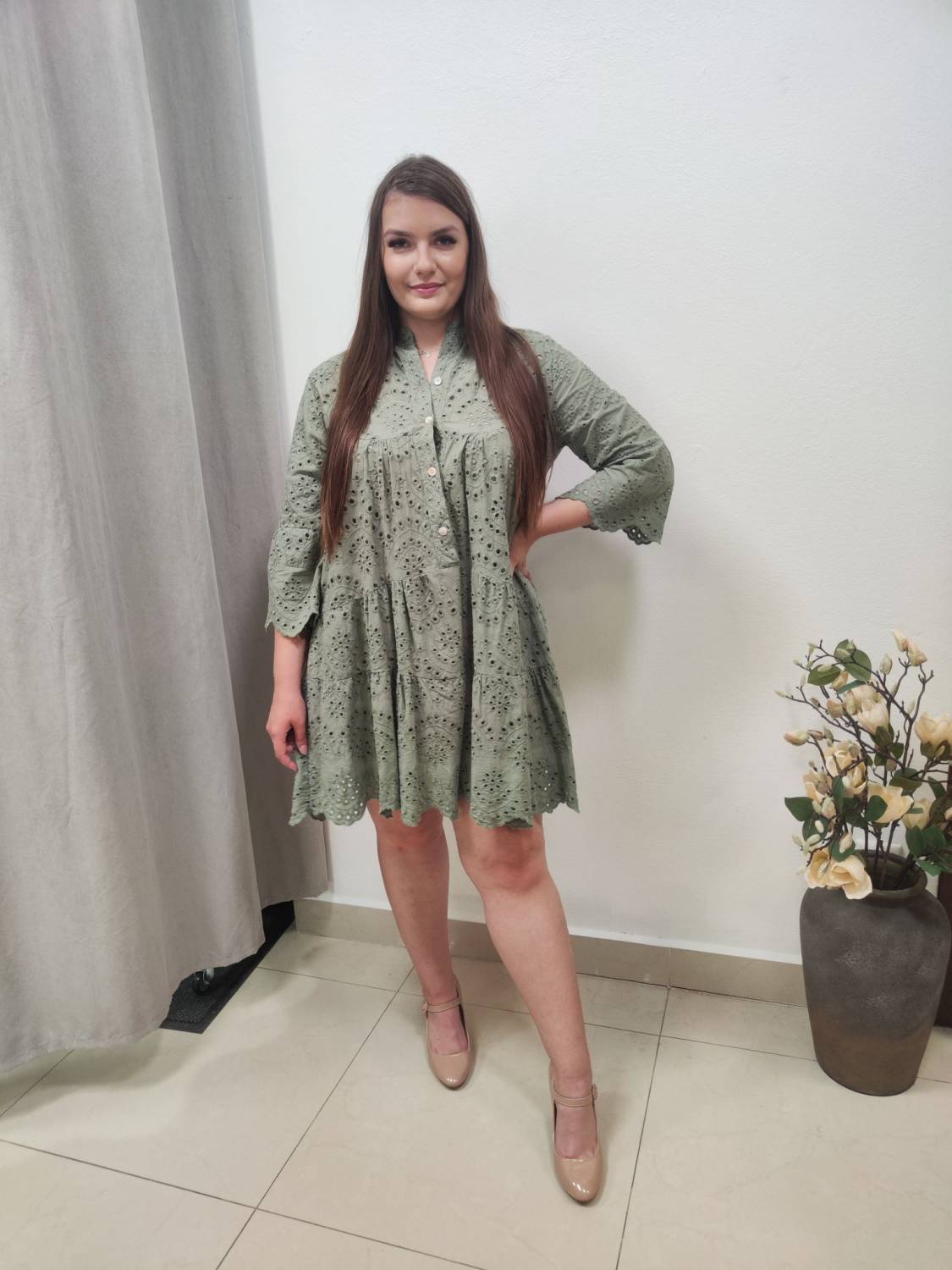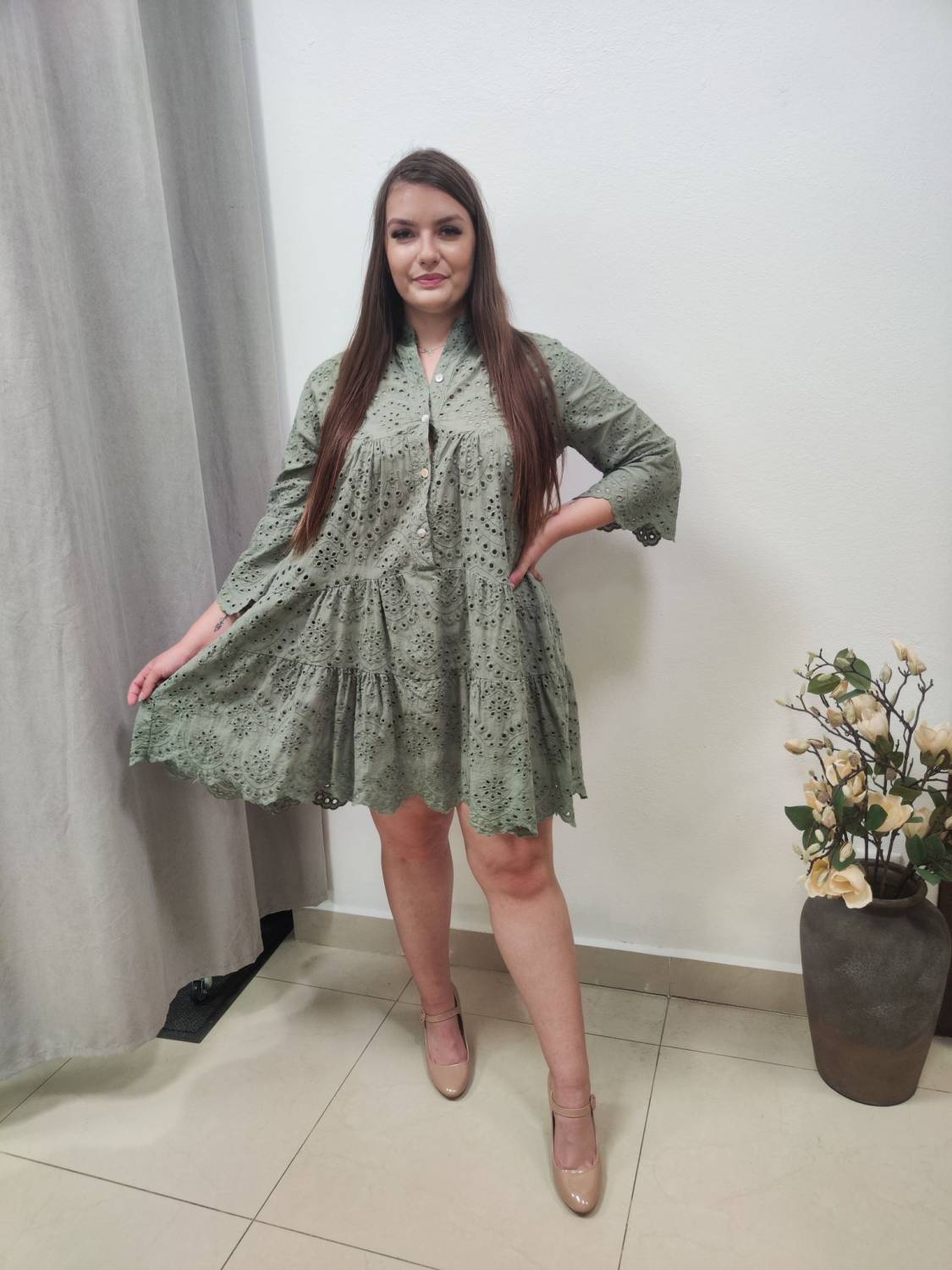 Jednofarebné šaty voľného strihu z madeiry. V hornej časti majú gombíky a na rukávoch a v spodnej časti volán.