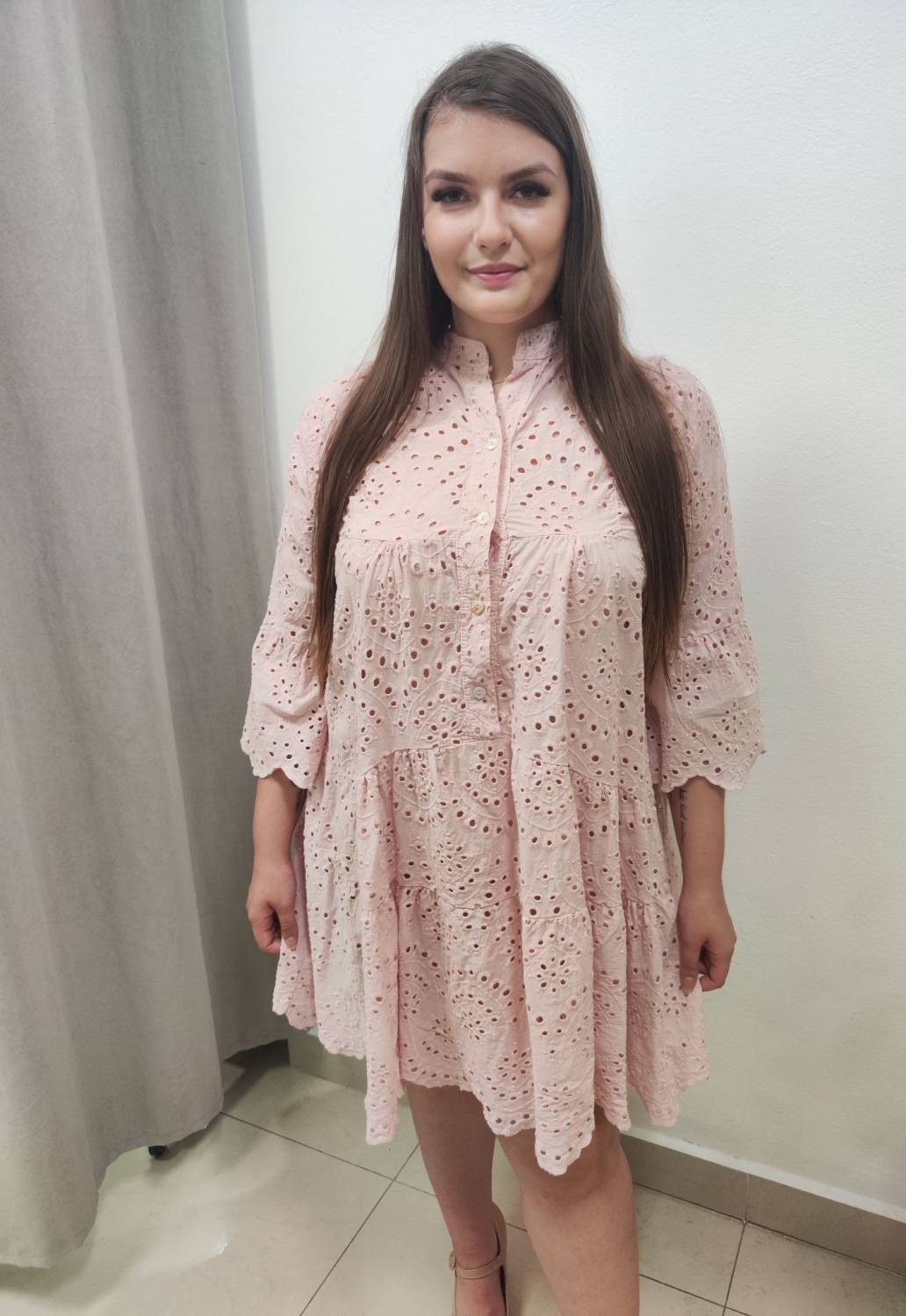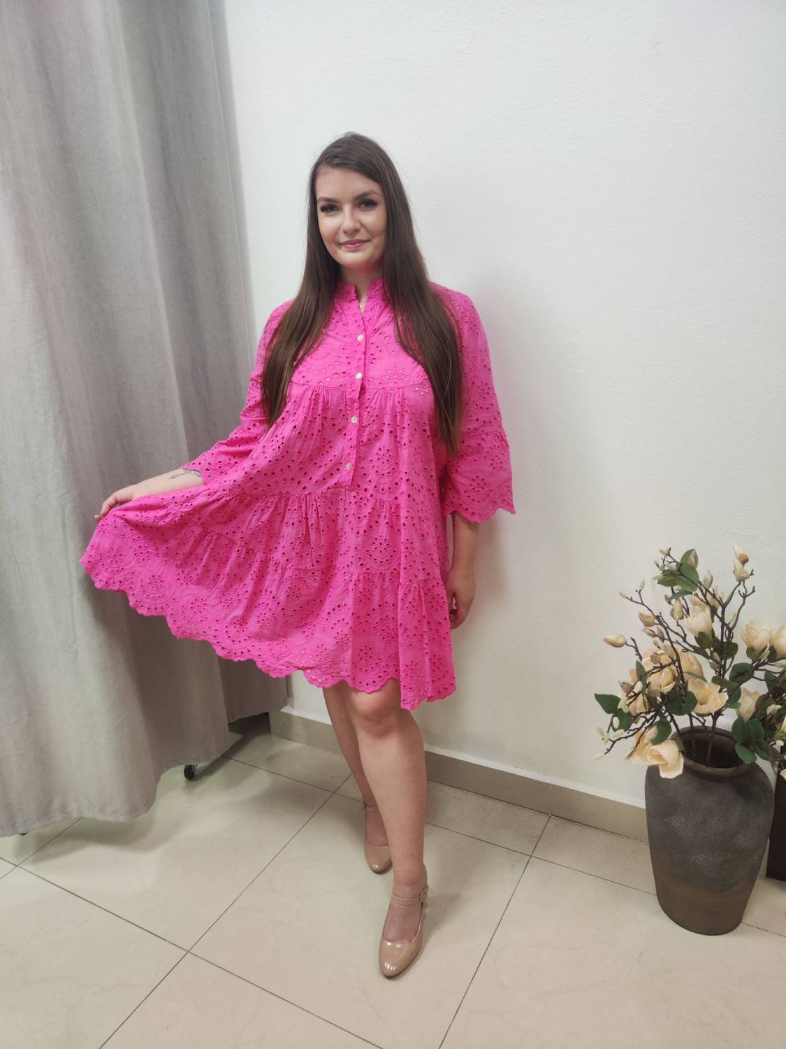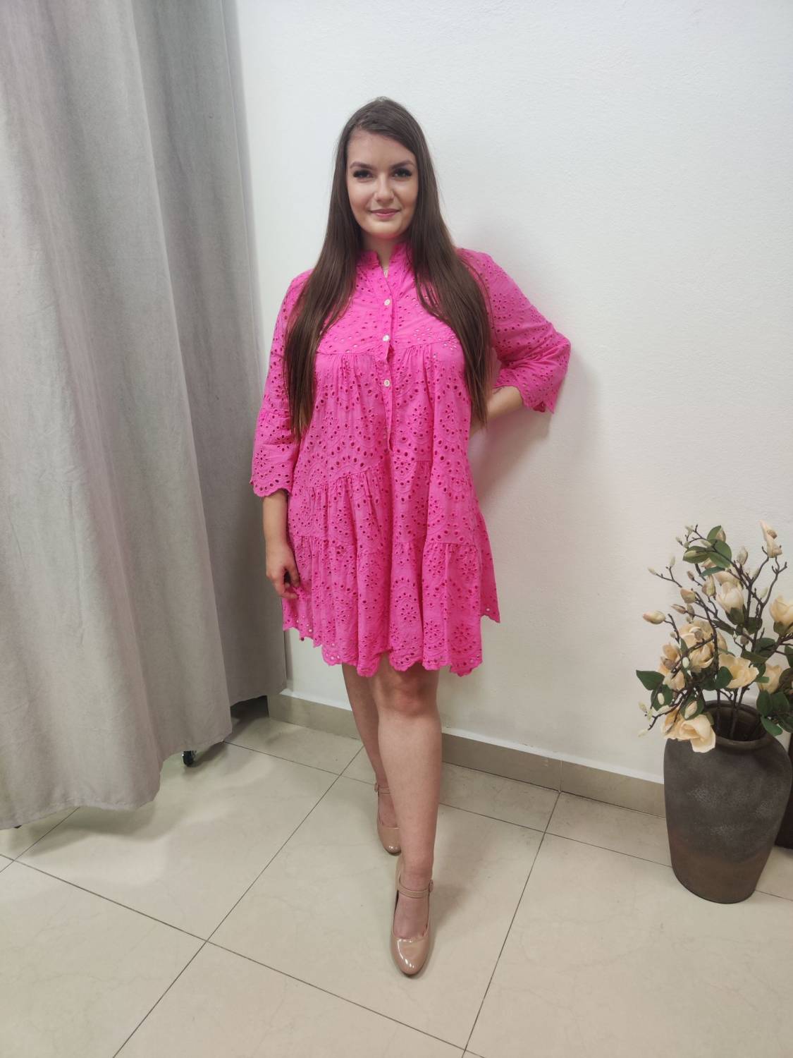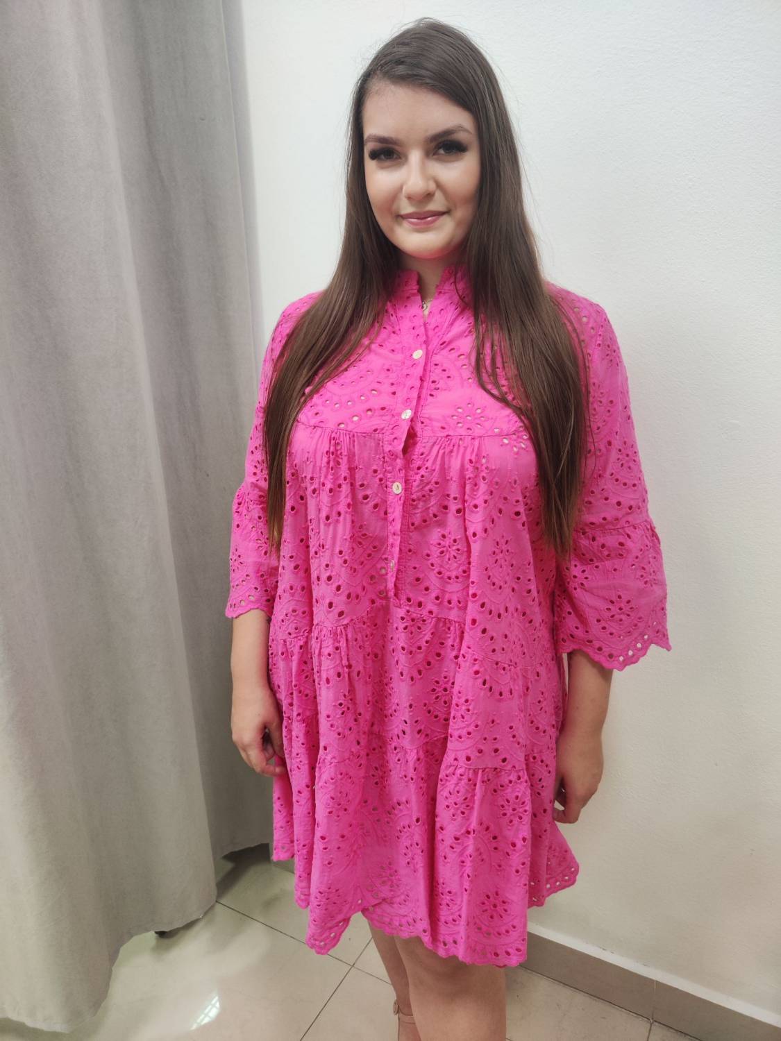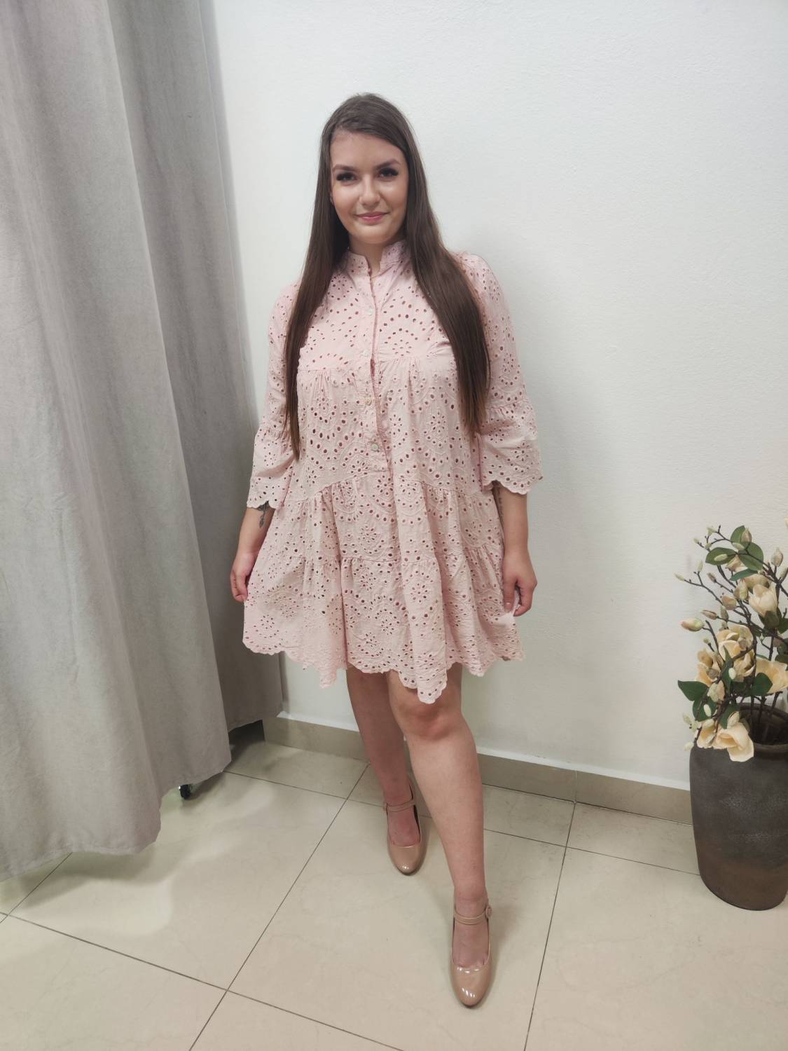 Jednofarebné šaty voľného strihu z madeiry. V hornej časti majú gombíky a na rukávoch a v spodnej časti volán.