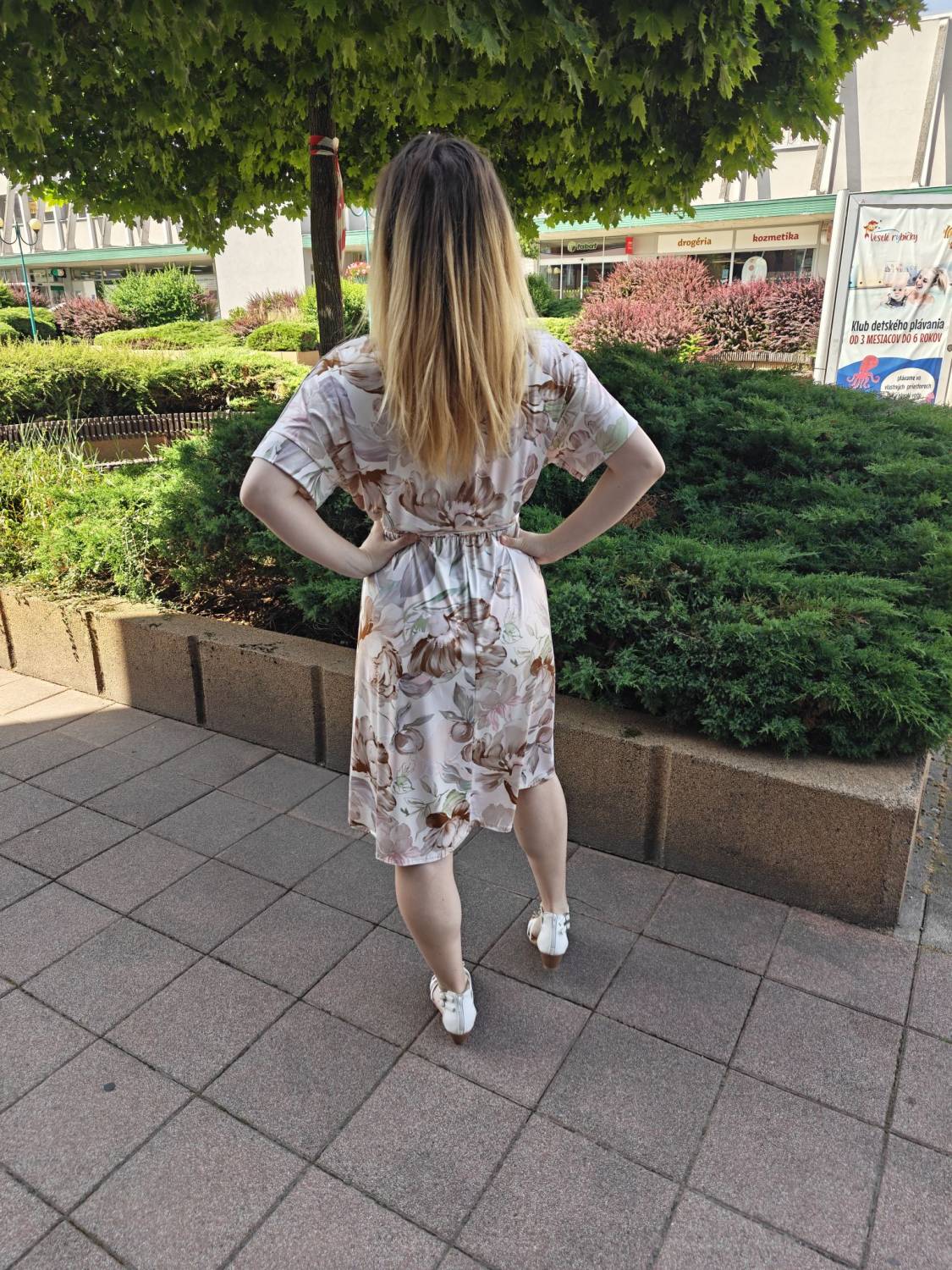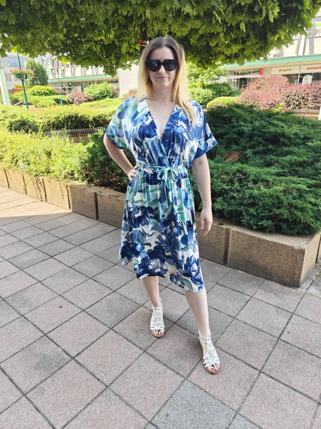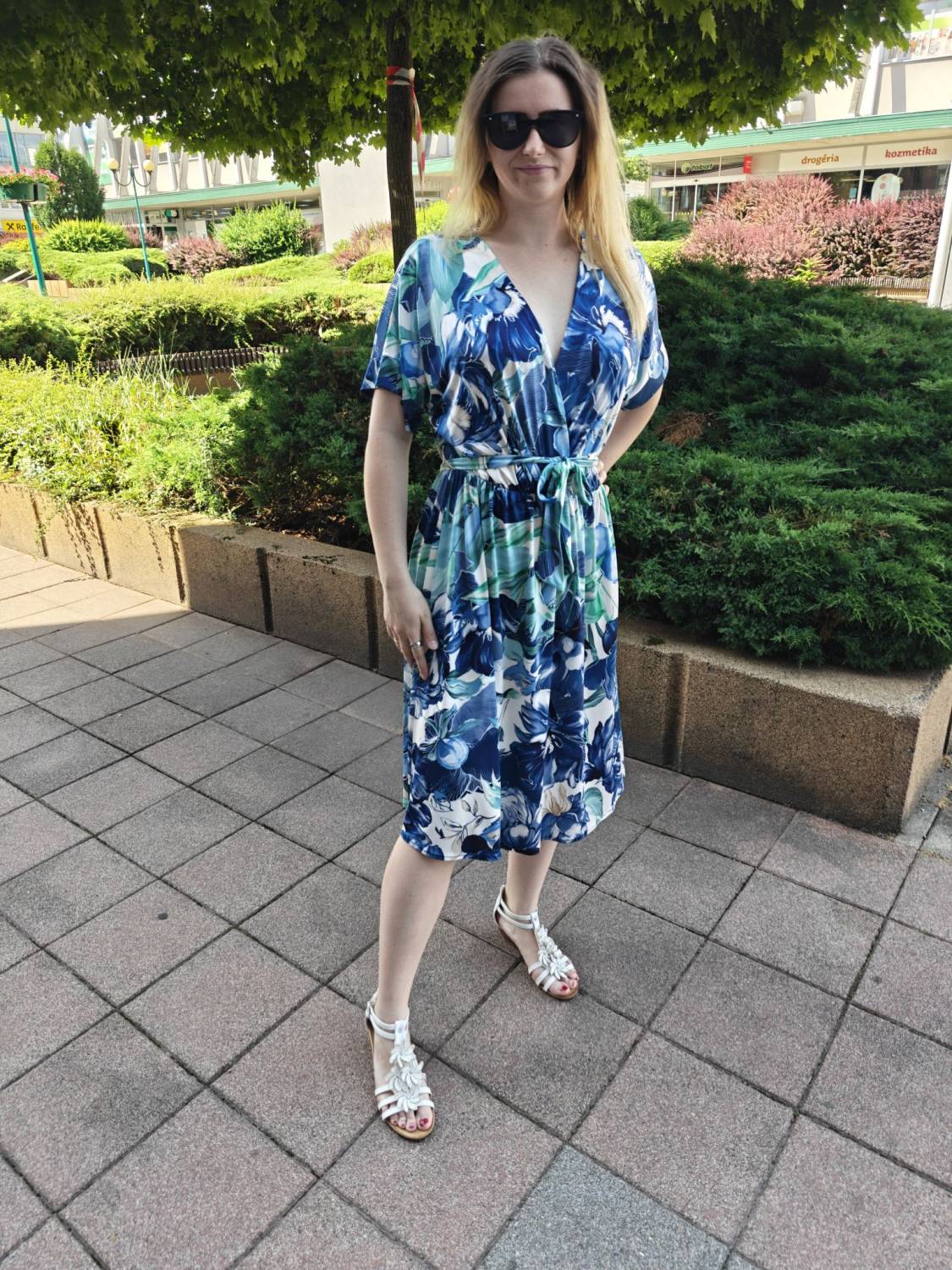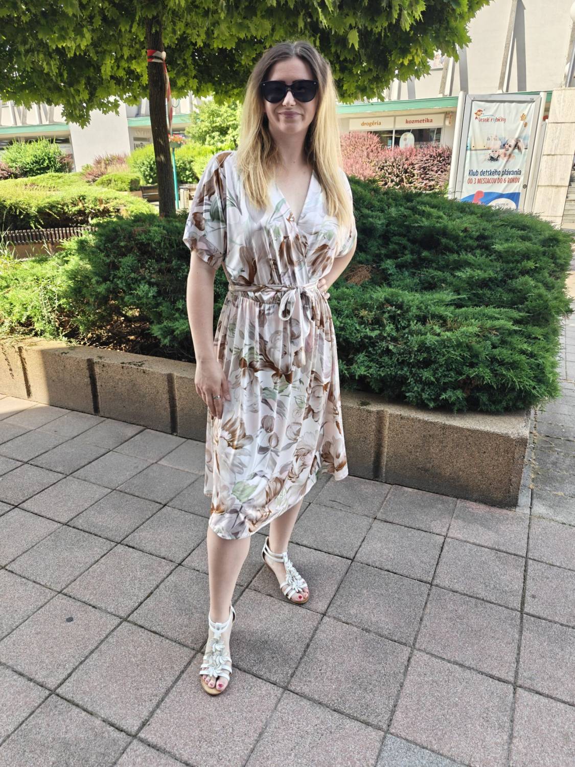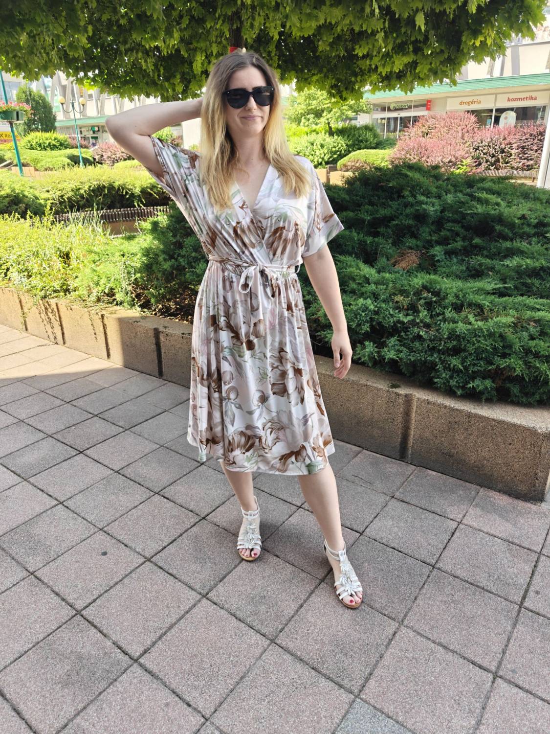 Prekladané vzorované šaty s opaskom.