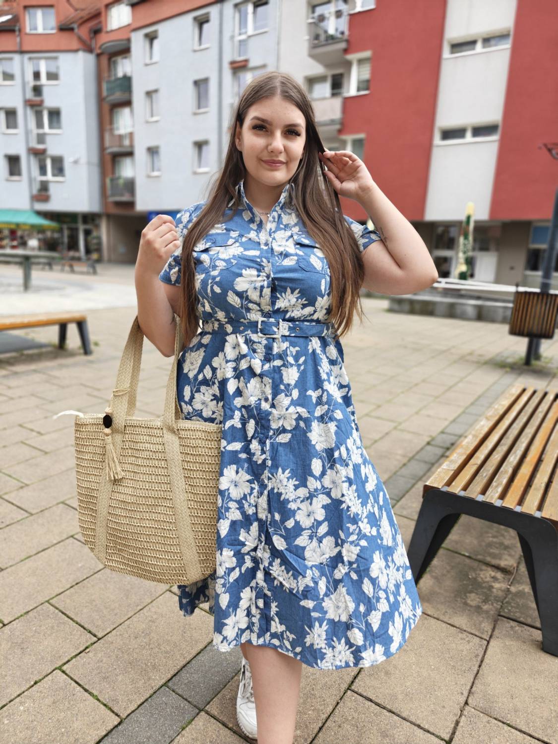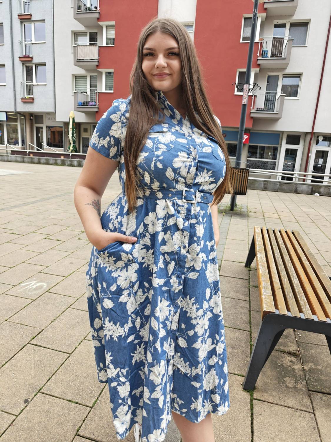 Rifľové šaty s kvetovaným vzorom. Šaty sú na gombíky, na prsiach majú vrecká. Súčasťou je aj opasok.