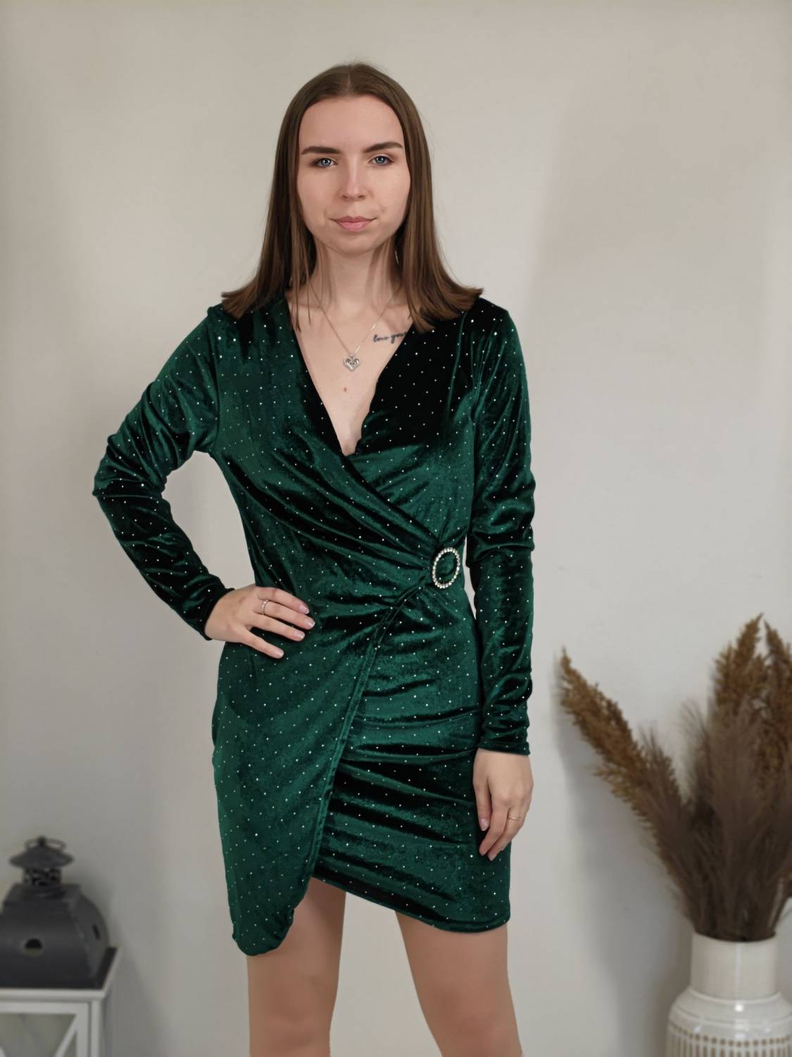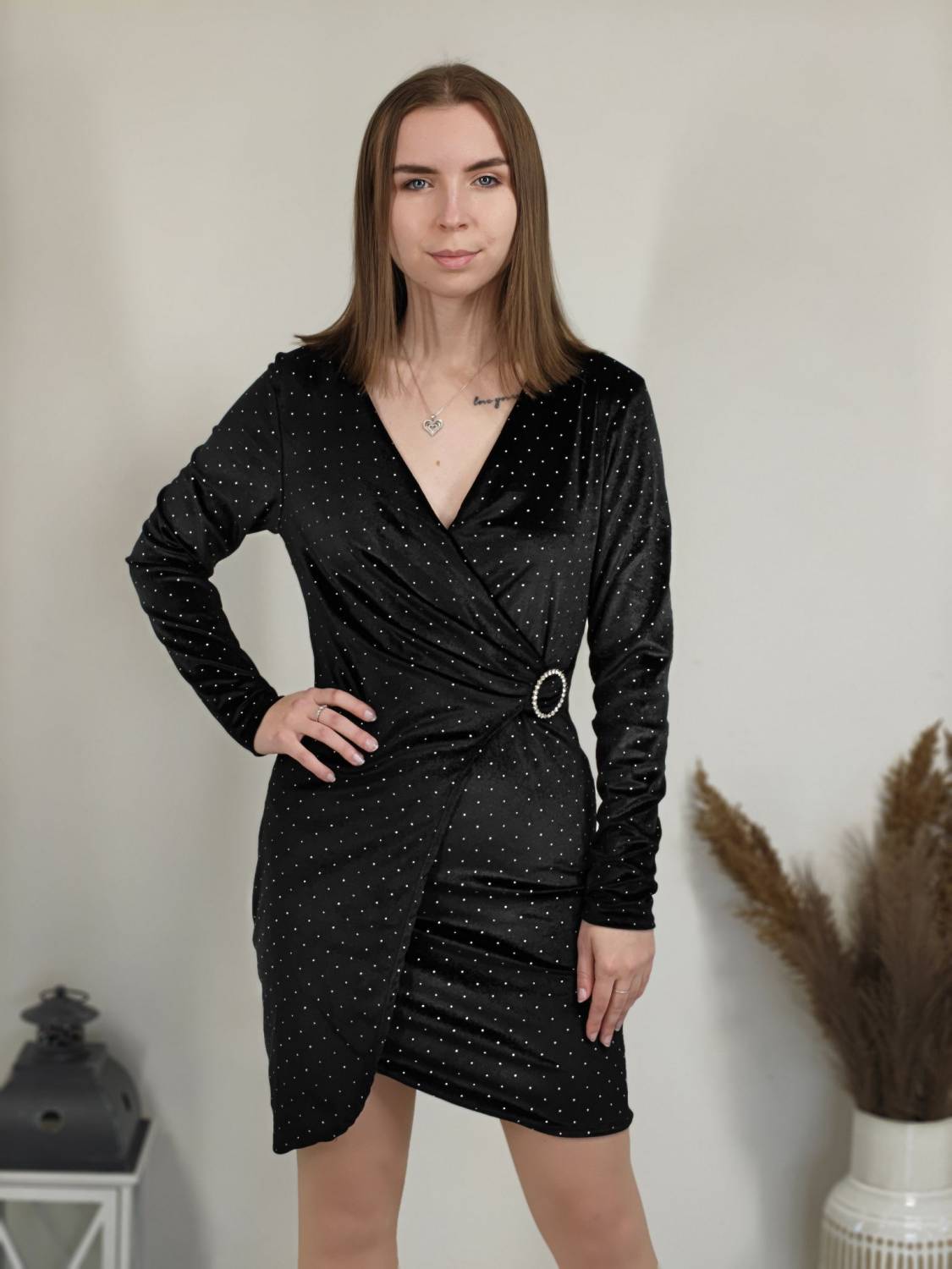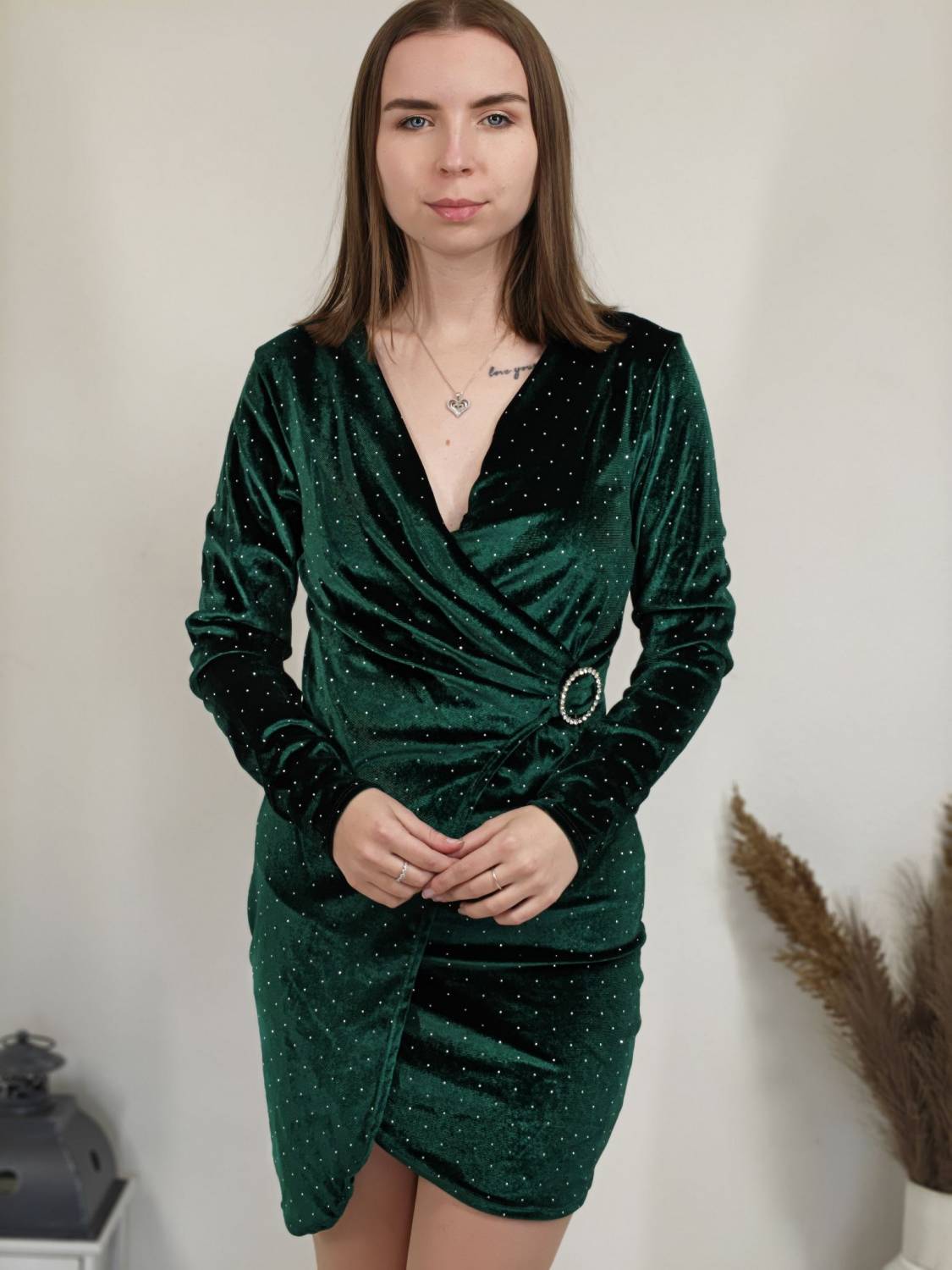 Jednofarebné velúrové šaty so zirkónmi, s prekladaním na prsiach a sponou.