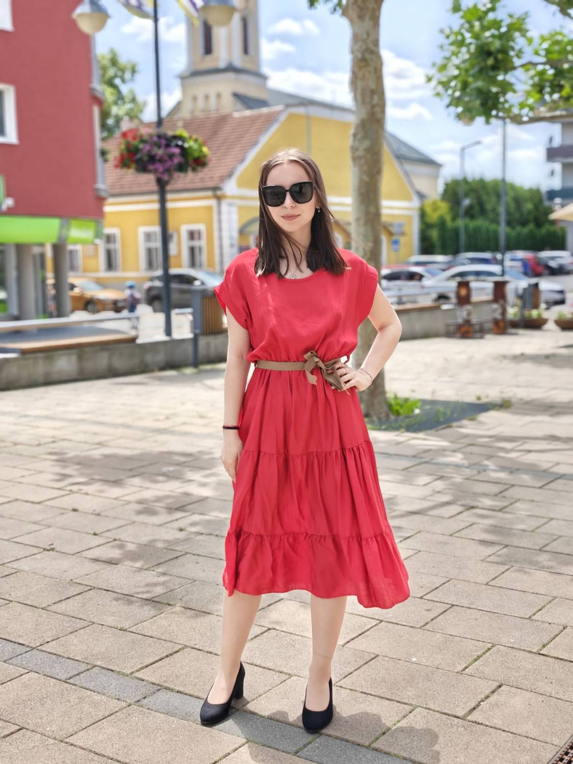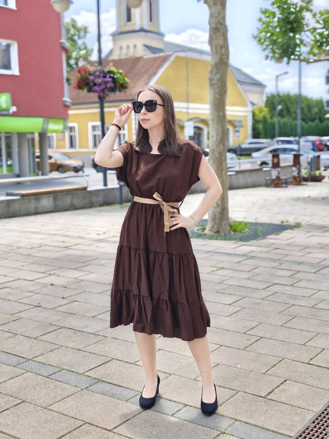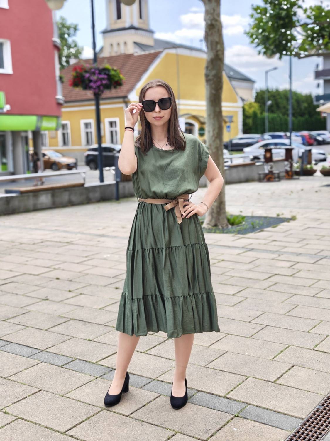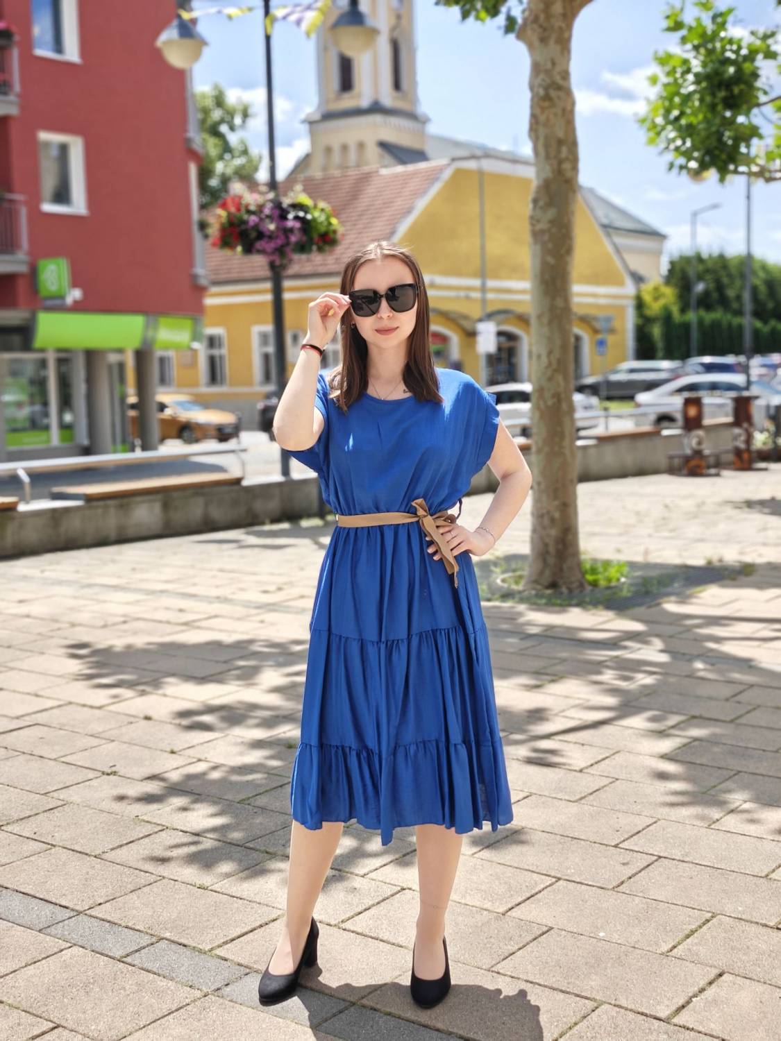 Jednofarebné šaty s opaskom, majú volán v spodnej časti.