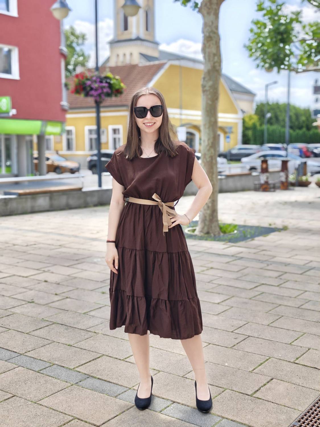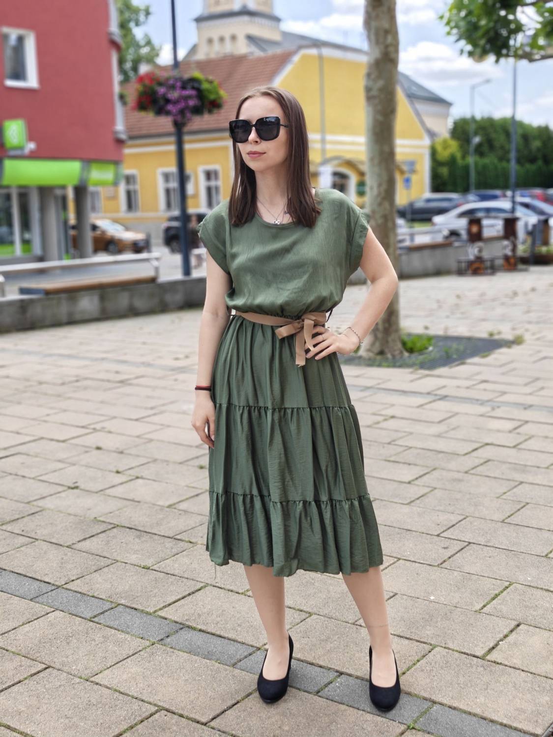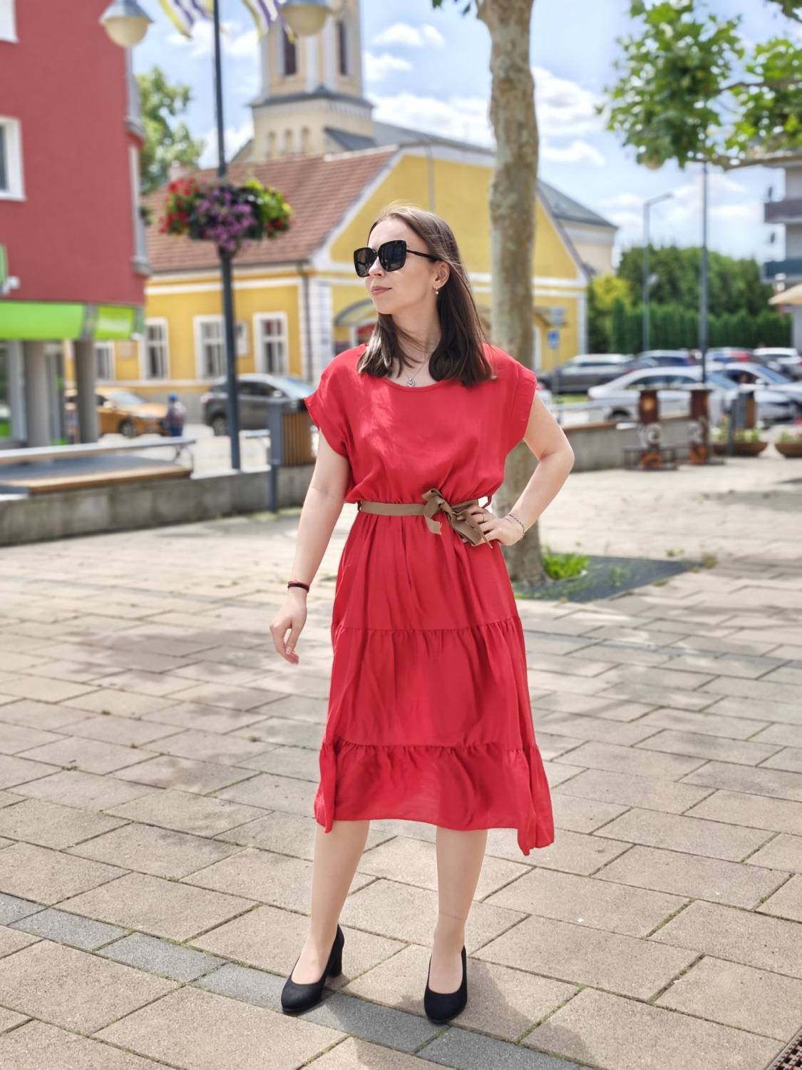 Jednofarebné šaty s opaskom, majú volán v spodnej časti.