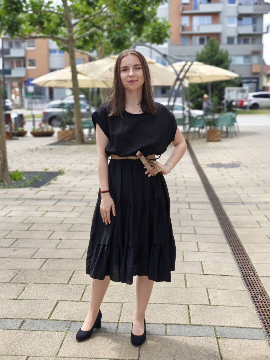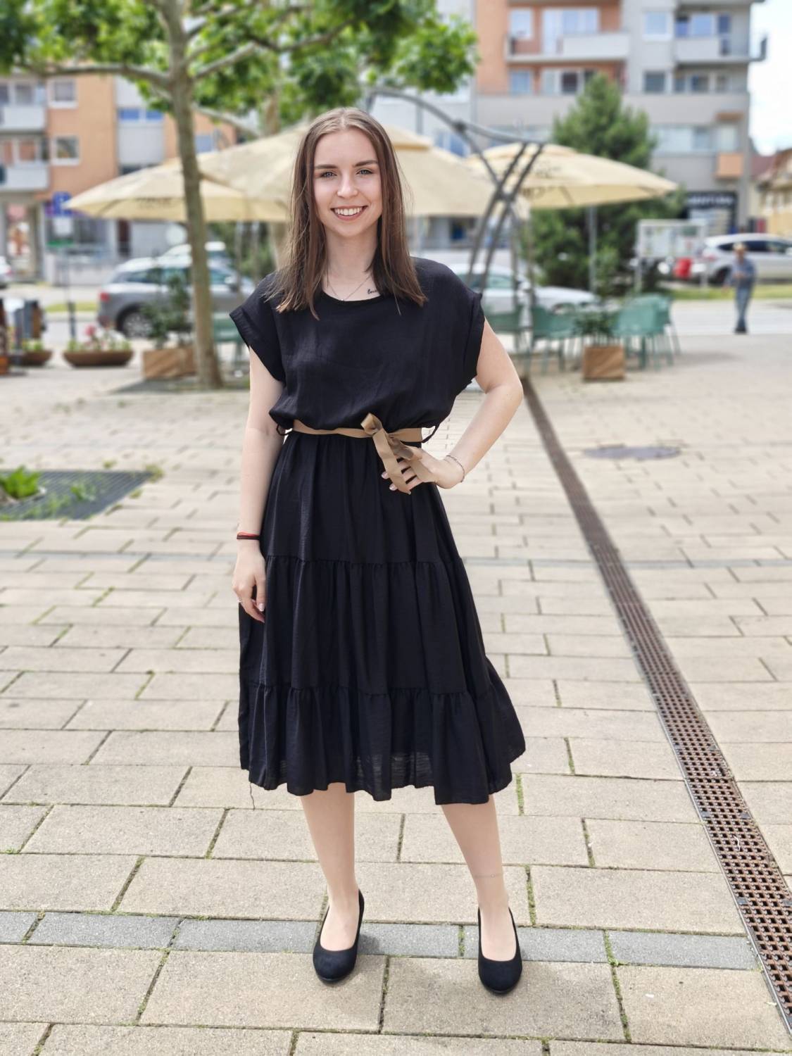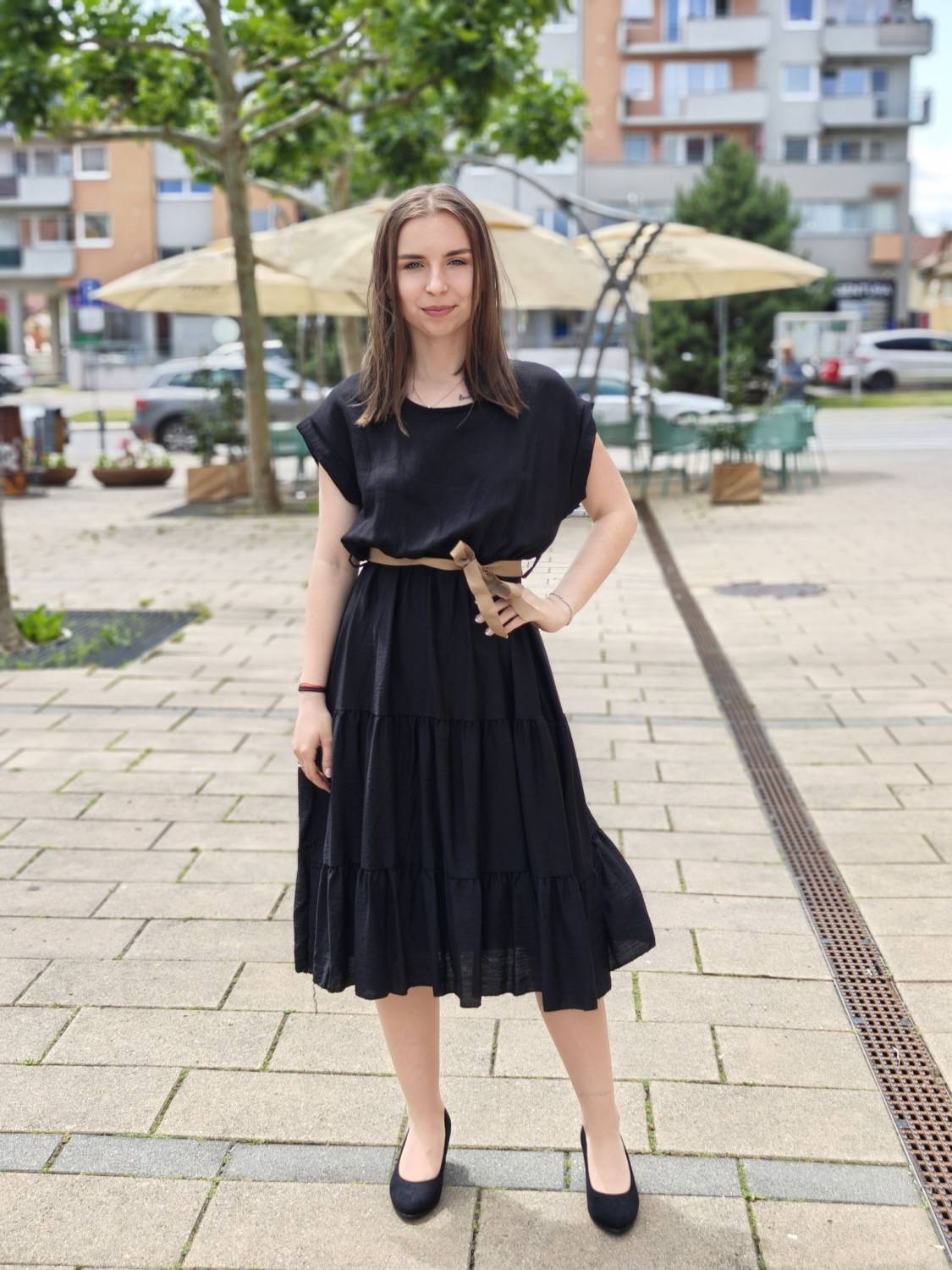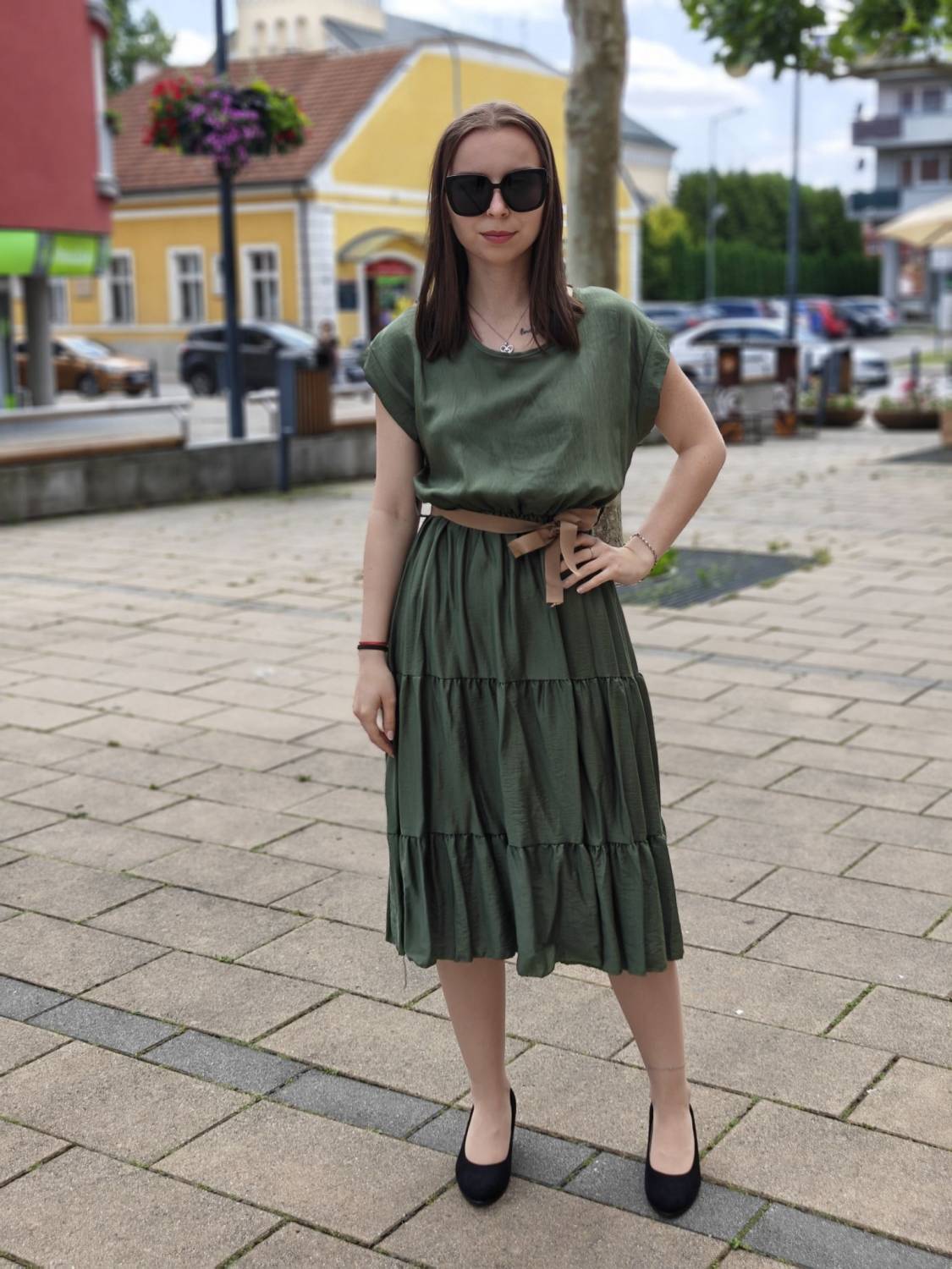 Jednofarebné šaty s opaskom, majú volán v spodnej časti.