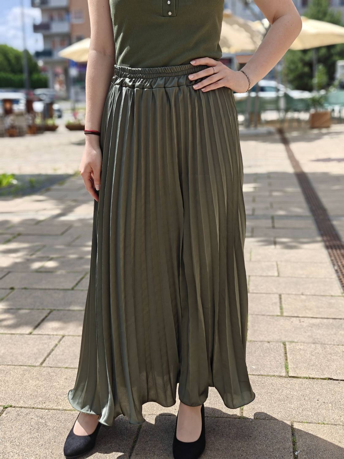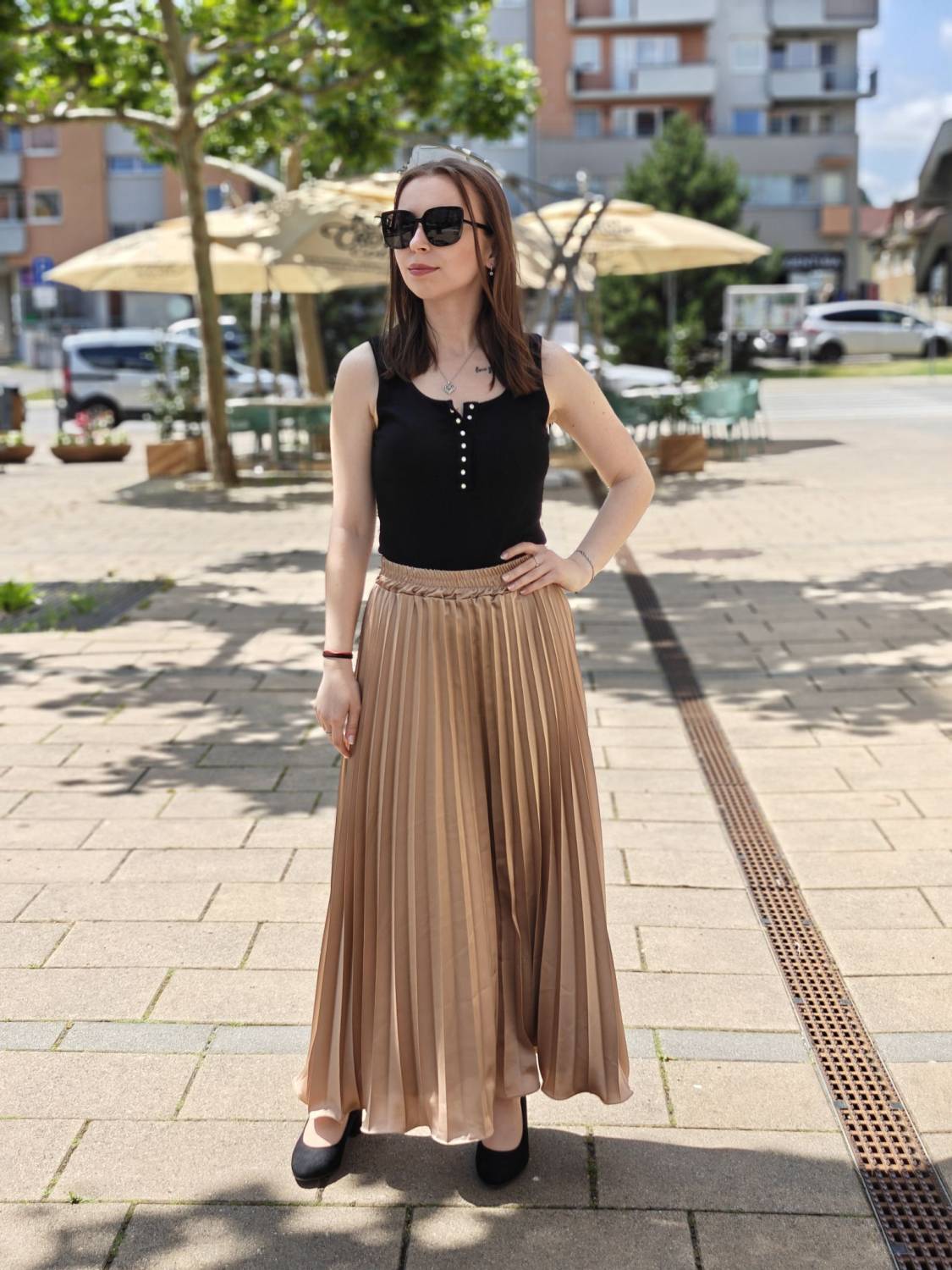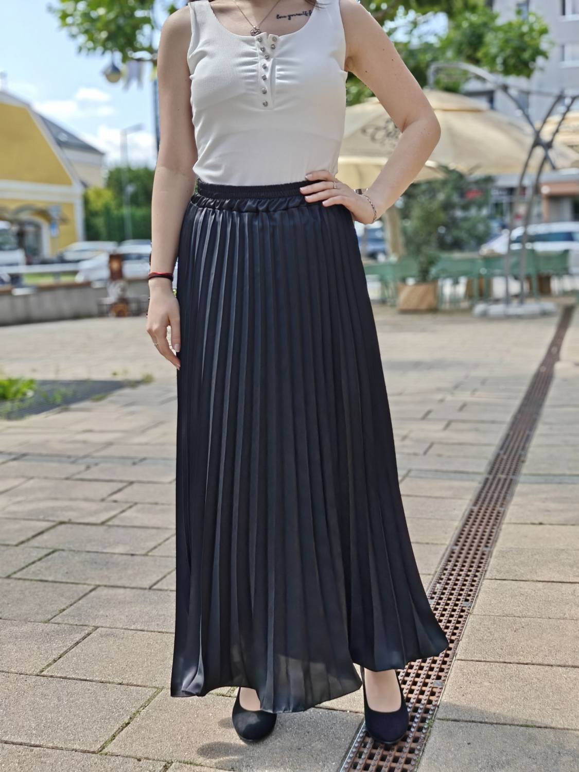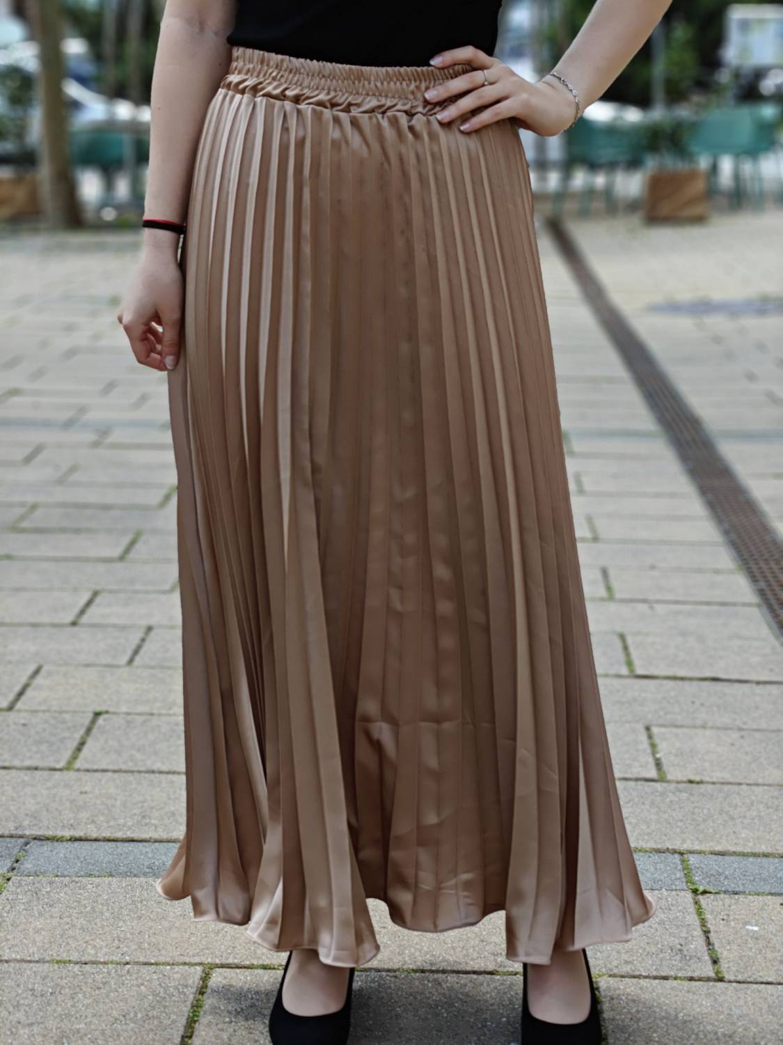 Jednofarebná plisovaná sukňa. V páse do gumičky a v spodnej časti má jemný volán. Príjemný a pohodlný saténový materiál.