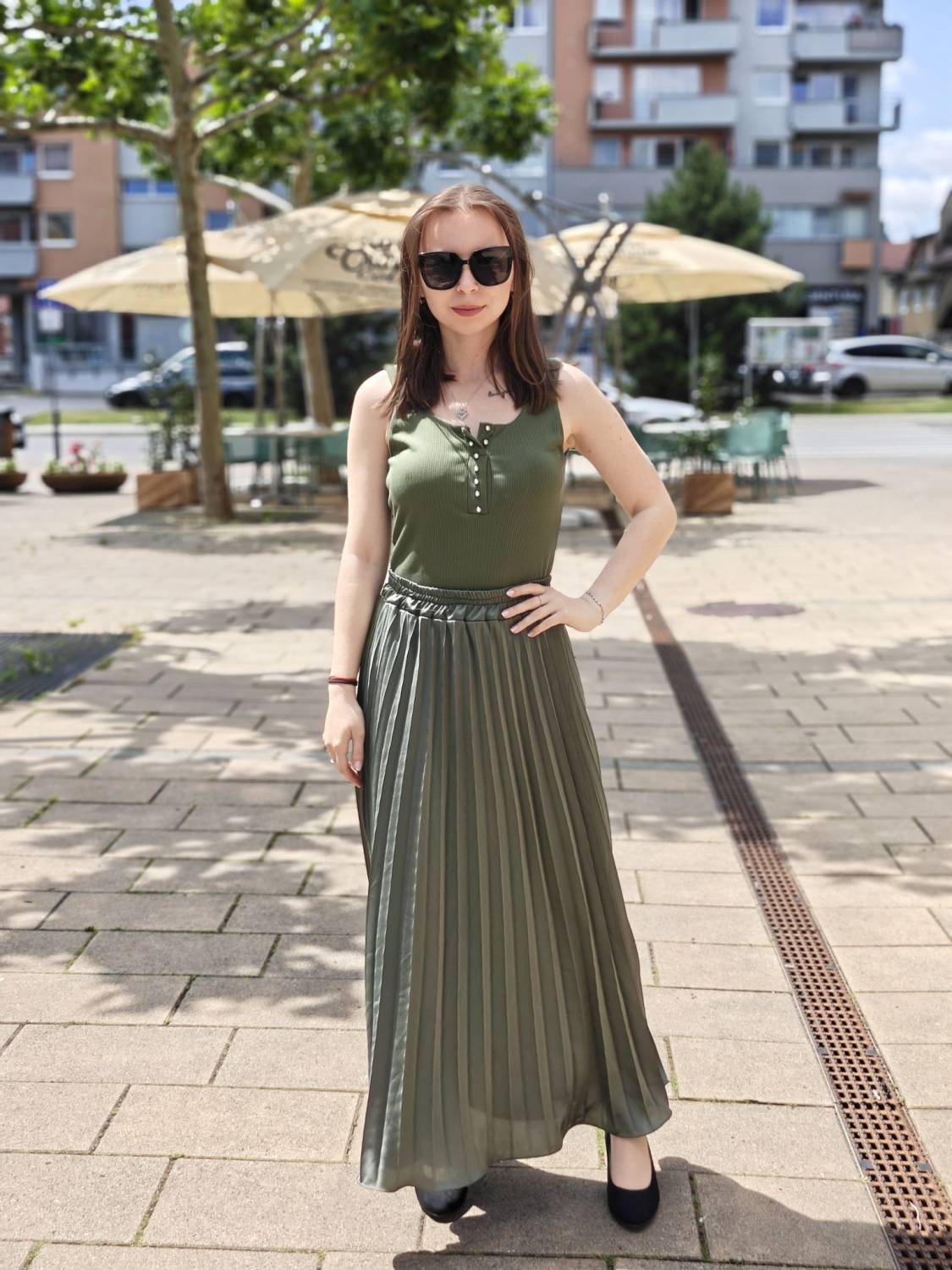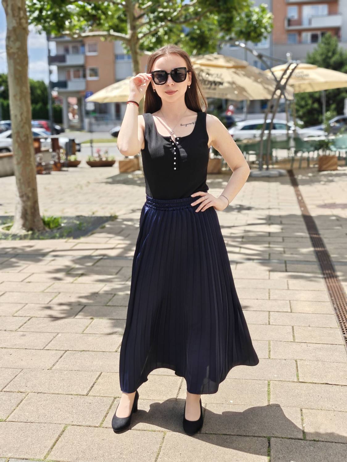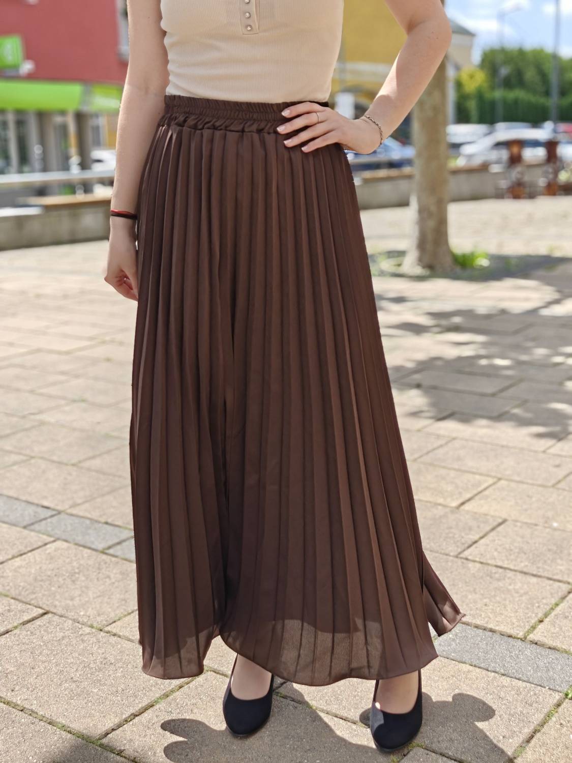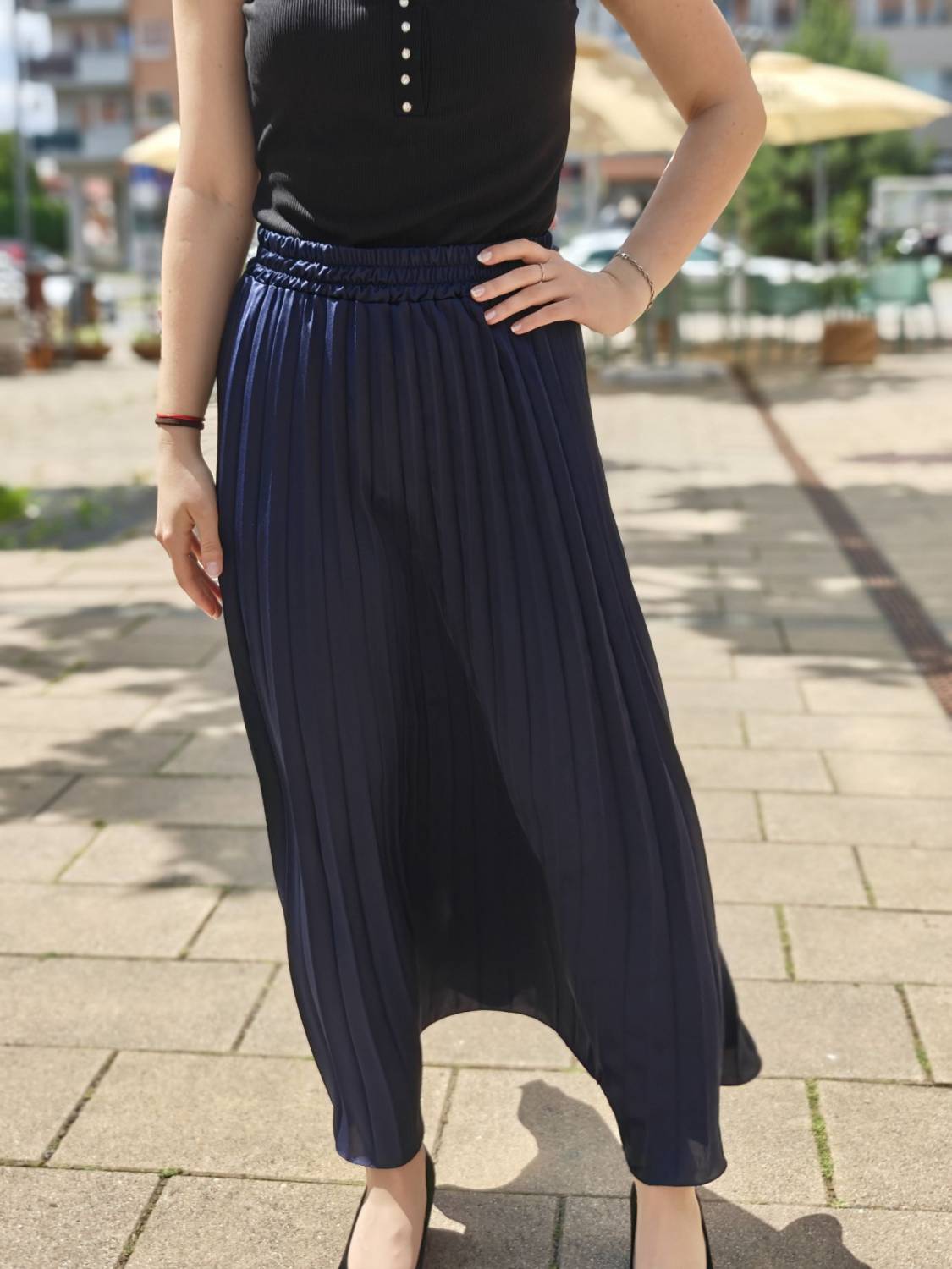 Jednofarebná plisovaná sukňa. V páse do gumičky a v spodnej časti má jemný volán. Príjemný a pohodlný saténový materiál.