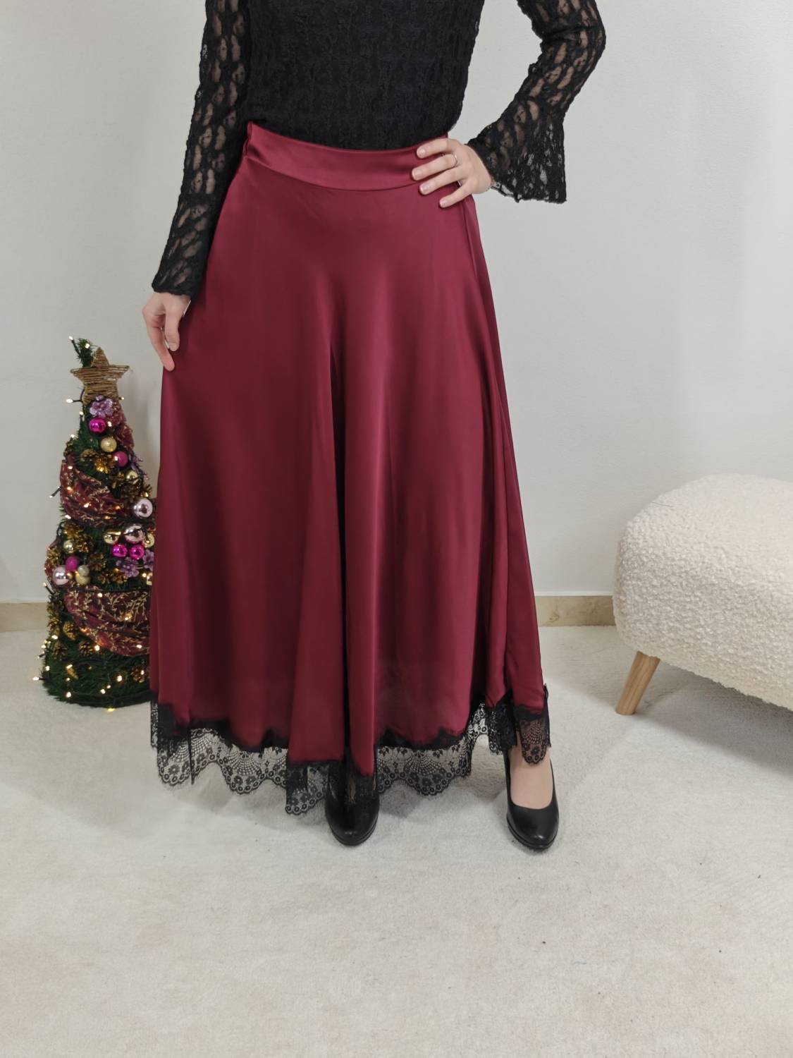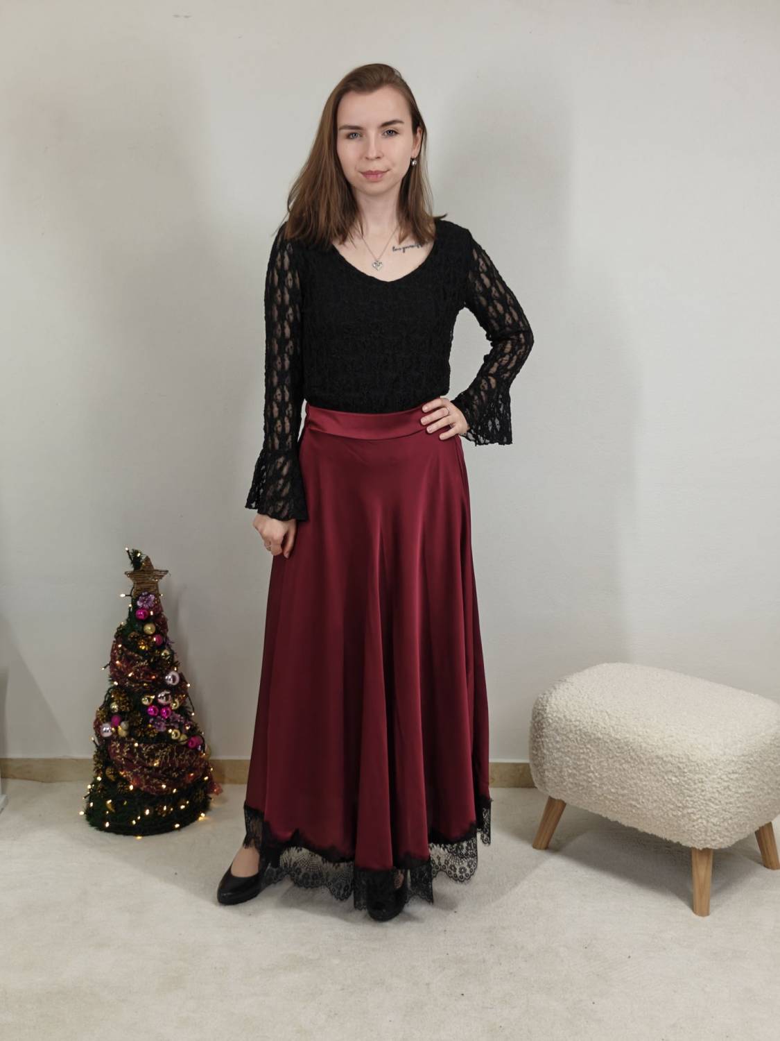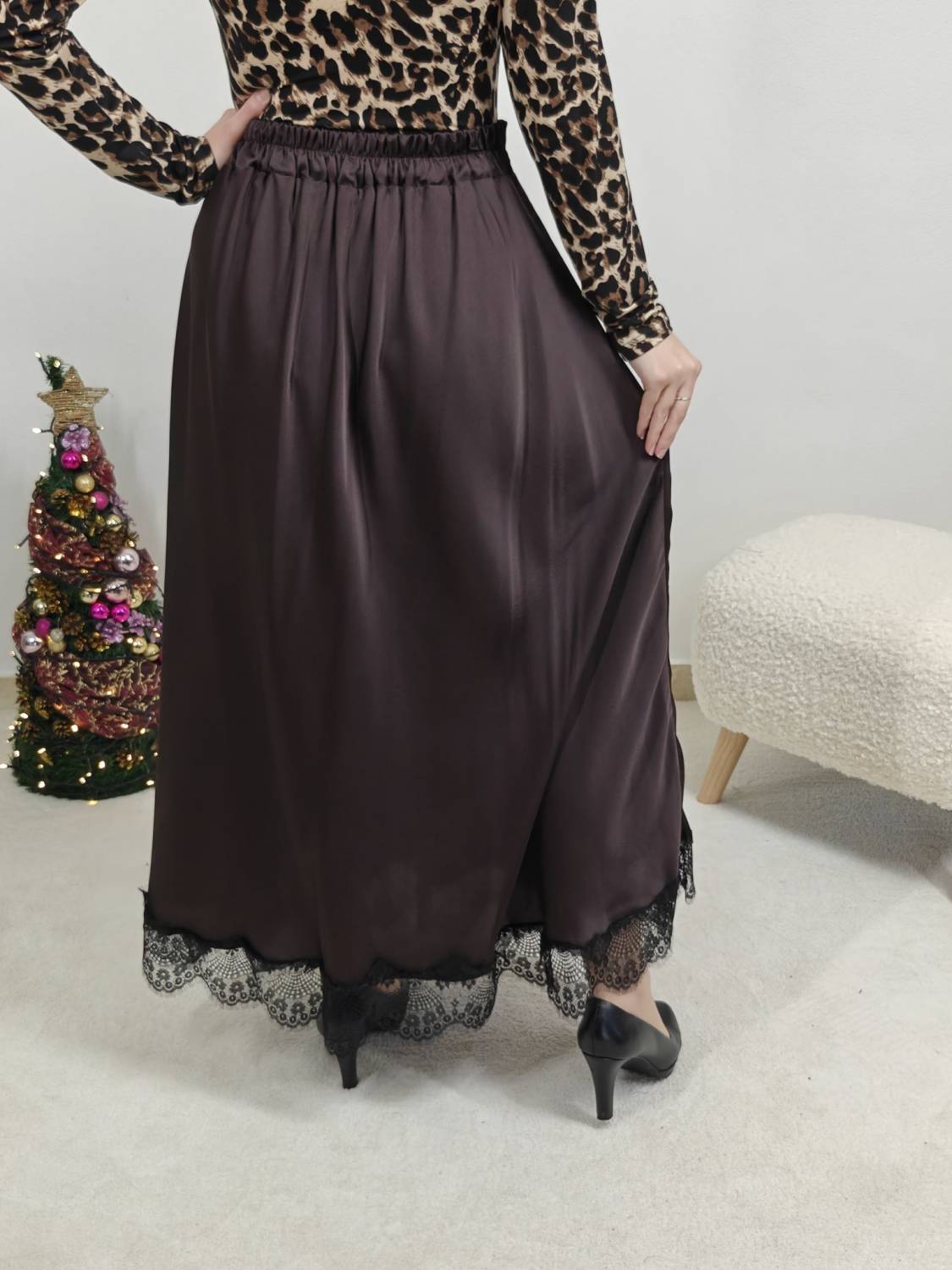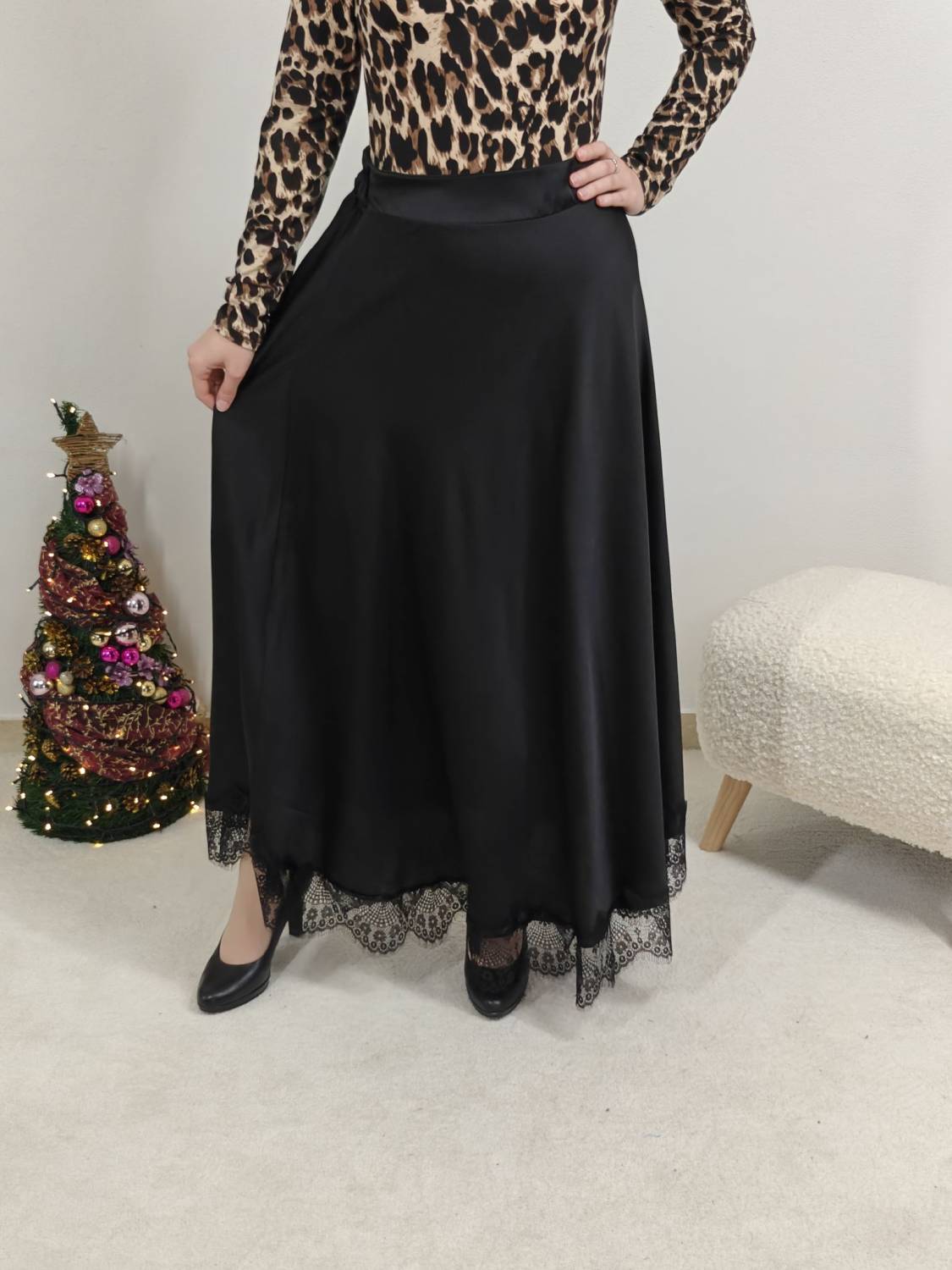 Saténová dlhá sukňa s krajkouv spodnej časti. Sukňa má gumičku v páse.