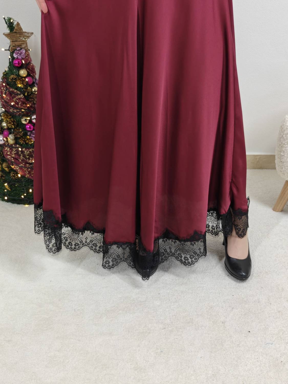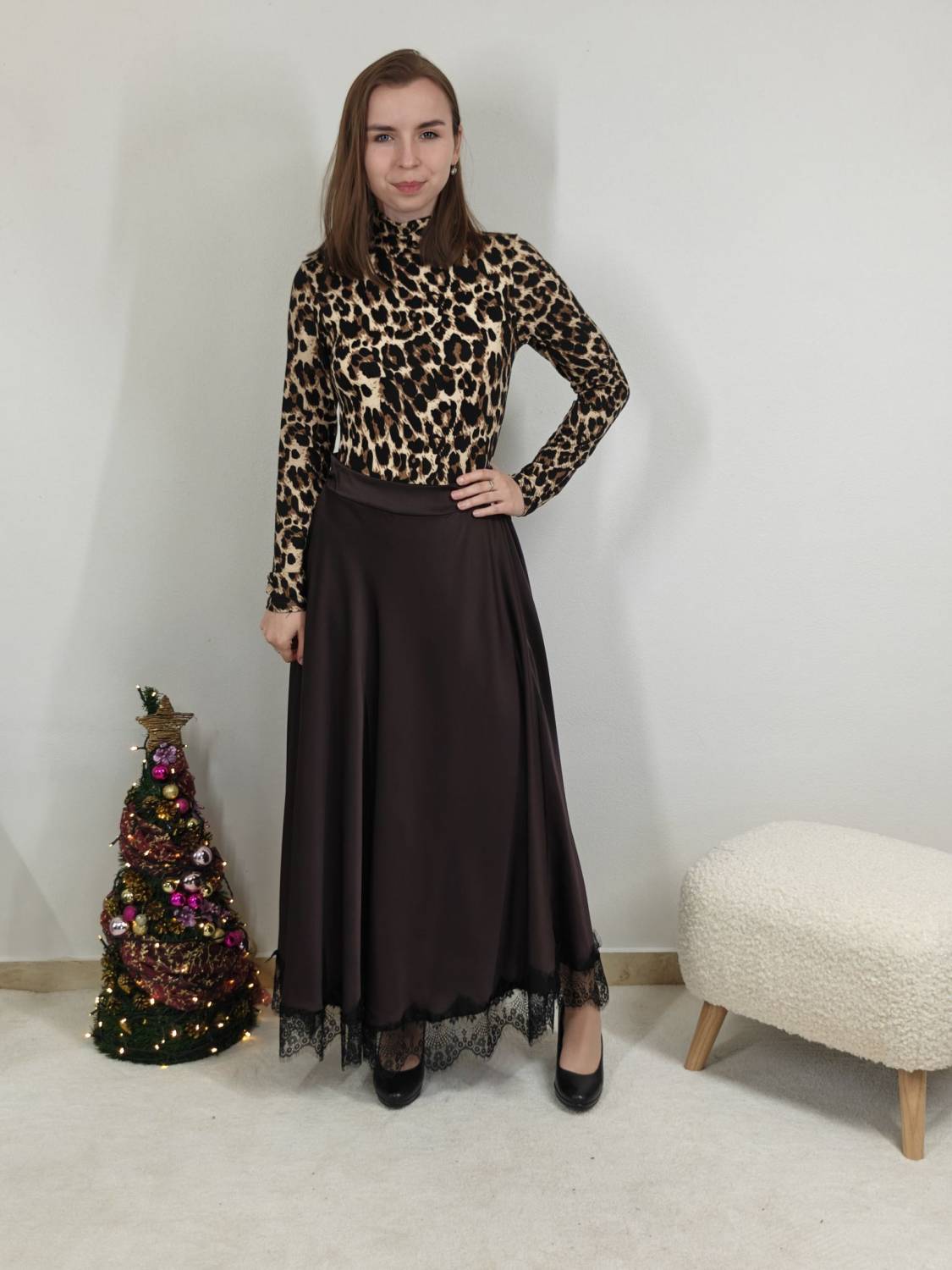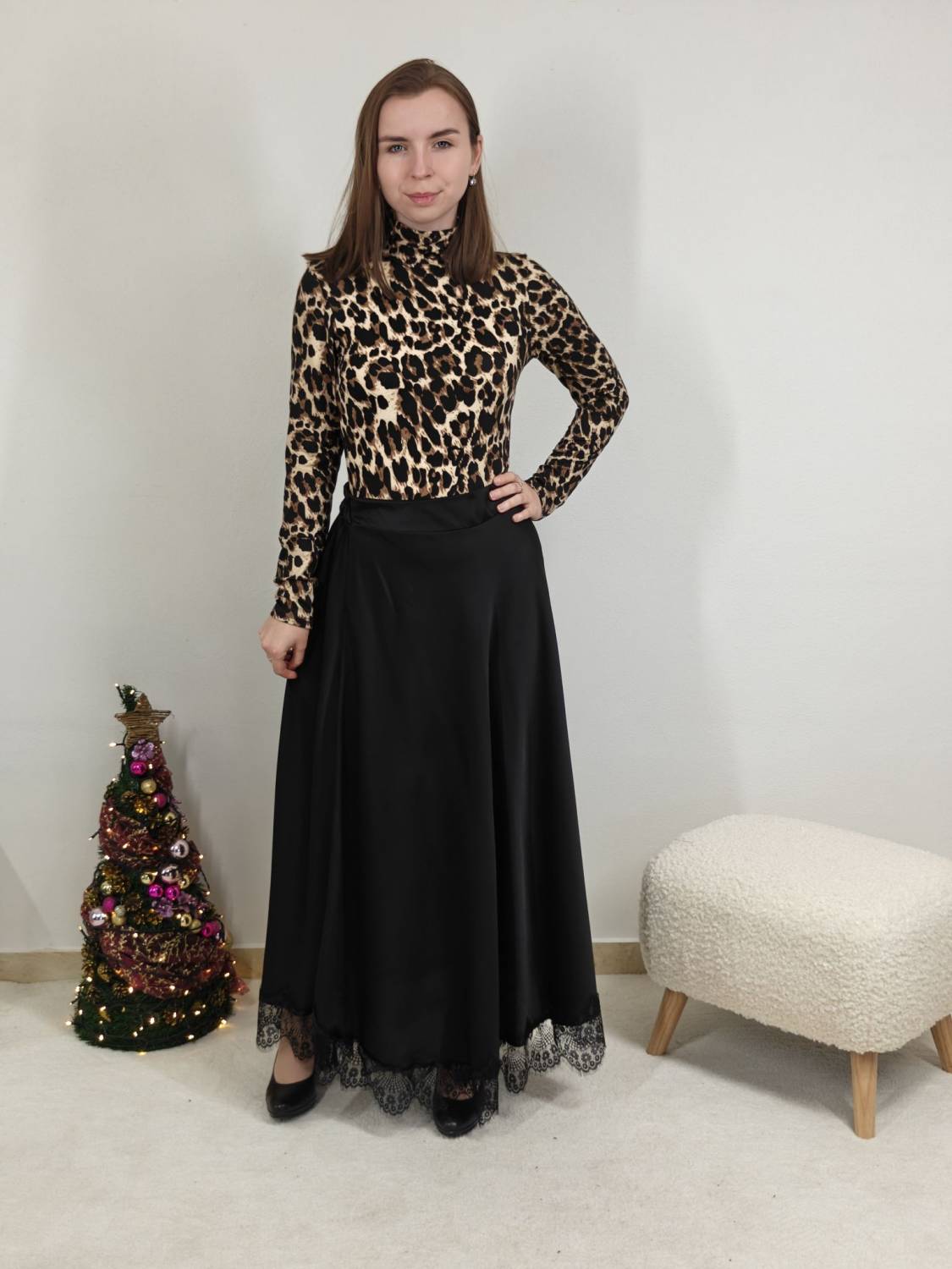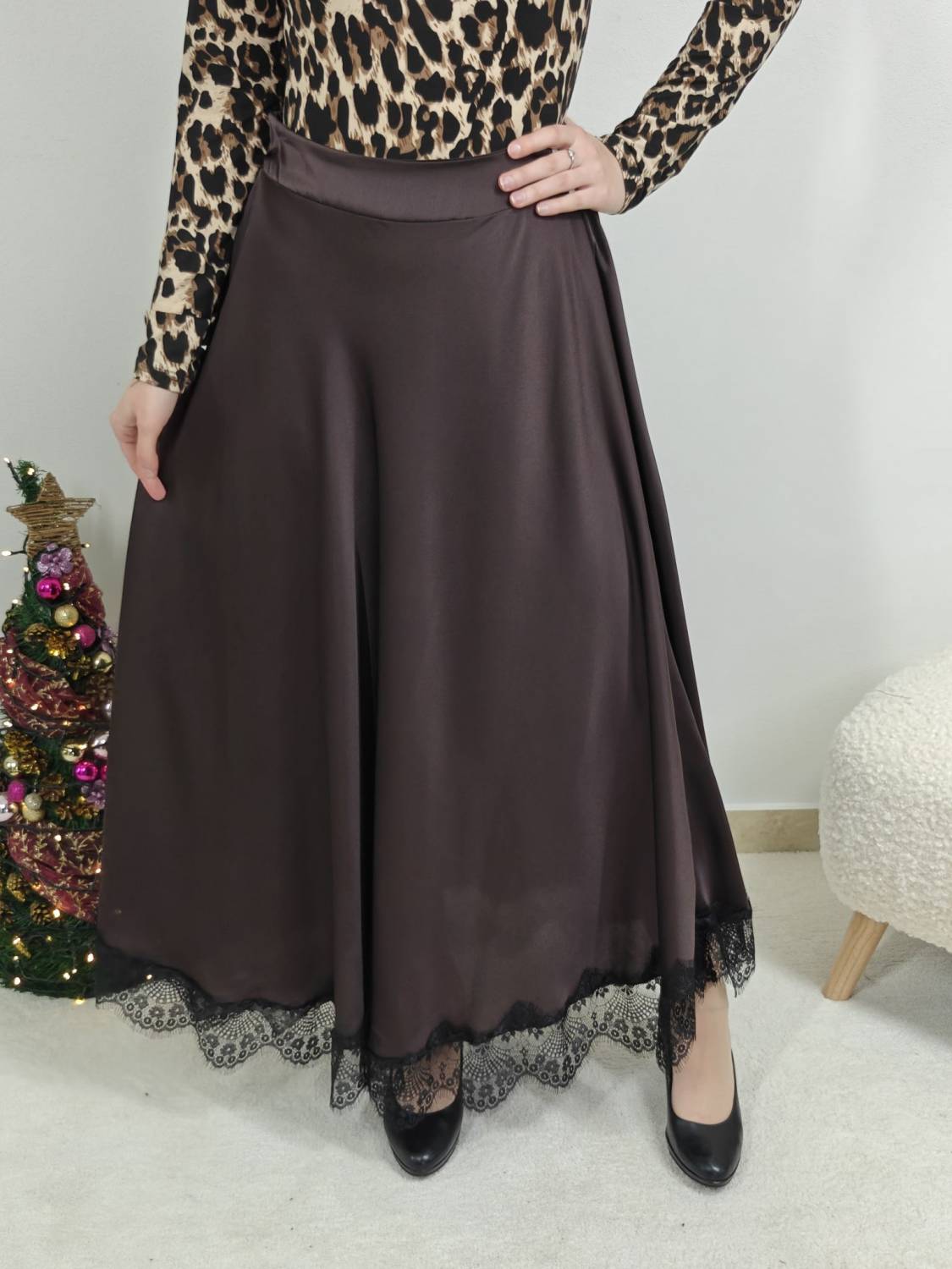 Saténová dlhá sukňa s krajkouv spodnej časti. Sukňa má gumičku v páse.