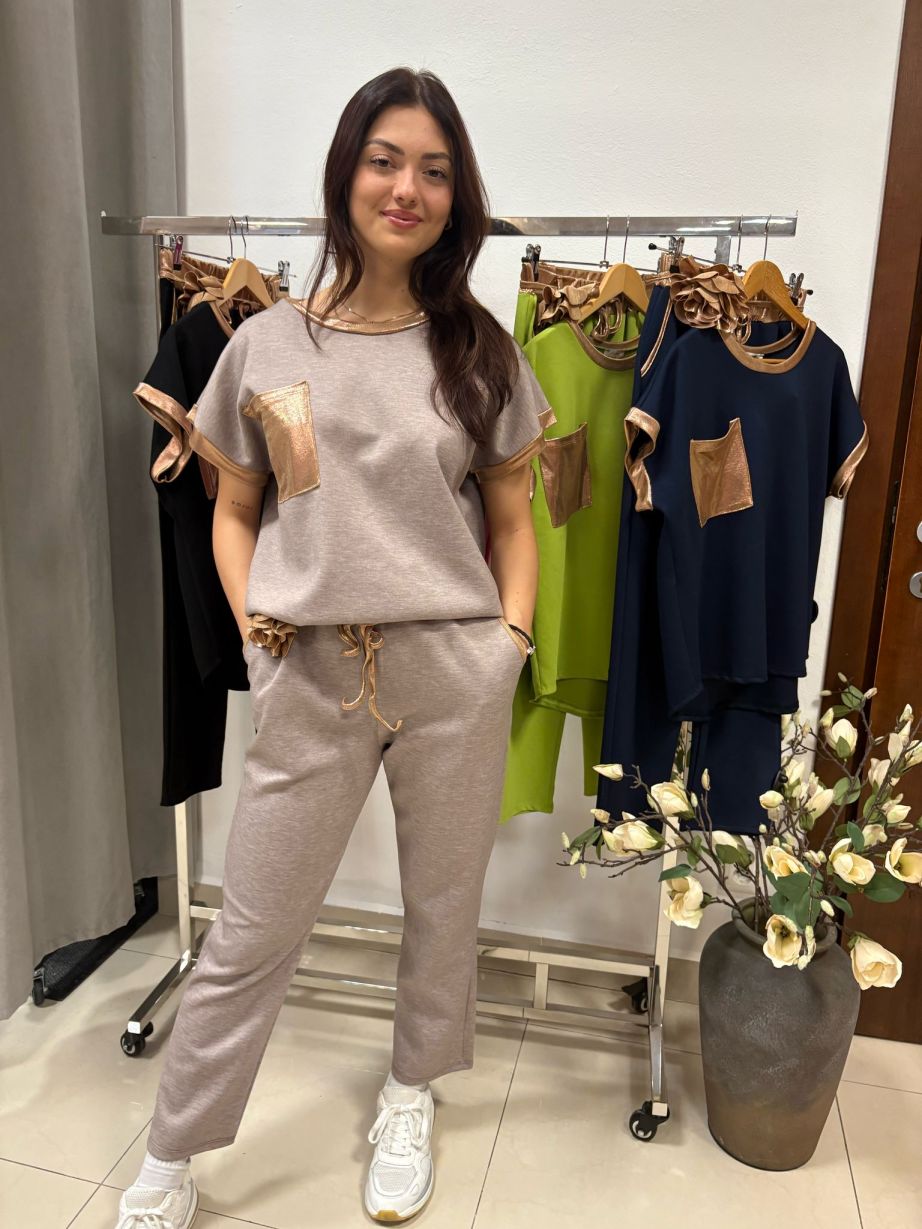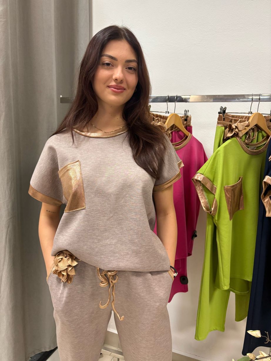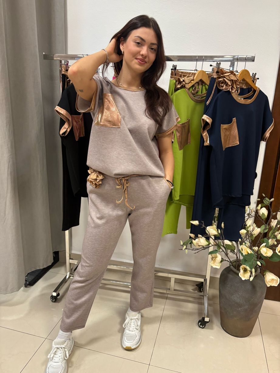 Tepláková súprava z príjemného materiálu. Ozdobená zlatými detailami na mikine aj teplákoch. Mikina je oversizového strihu. Tepláky sú rovného strihu a v páse do gumičky so šnúrkovým opaskom s ružičkou.