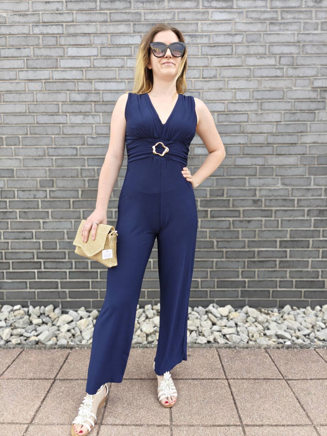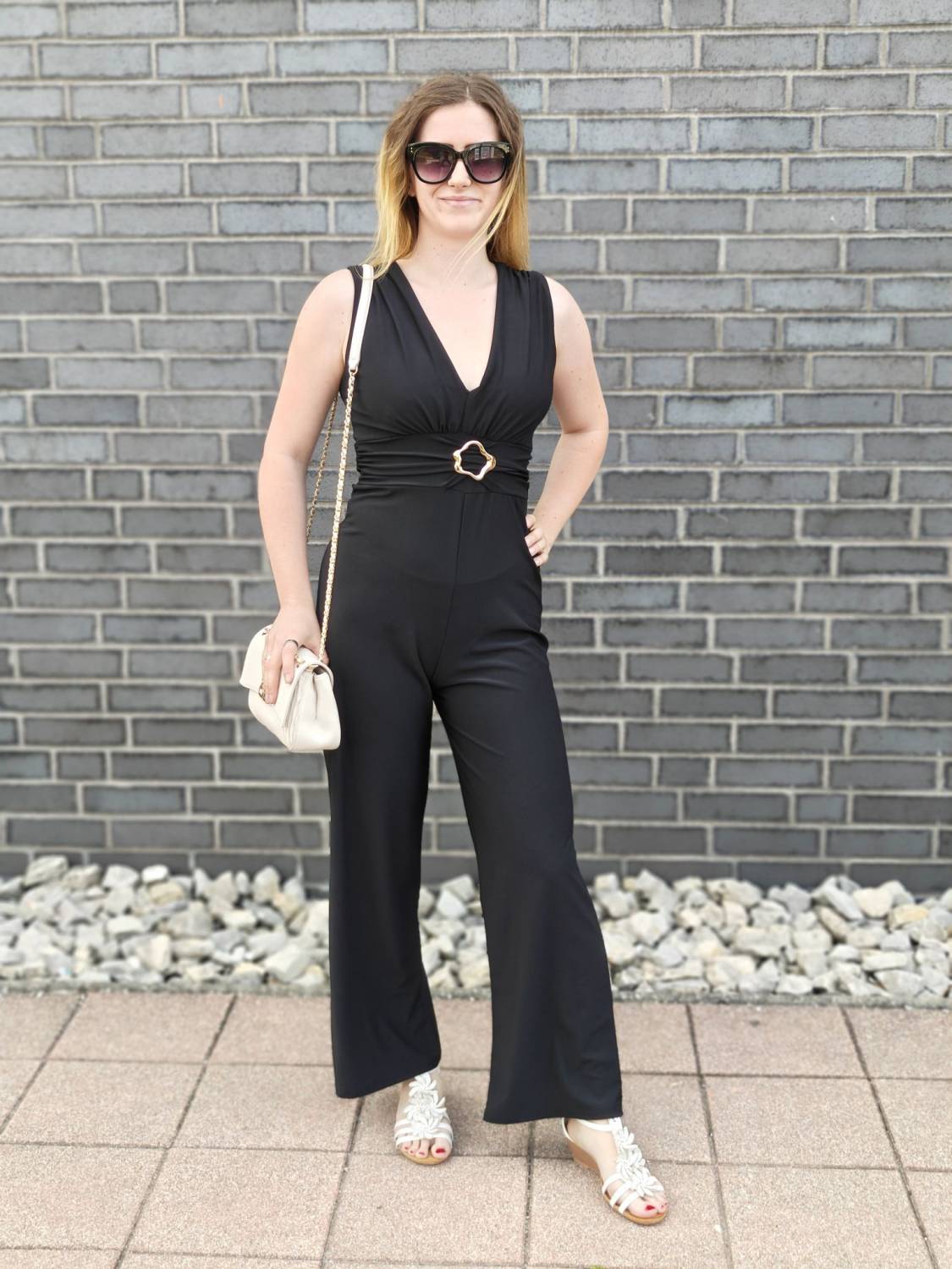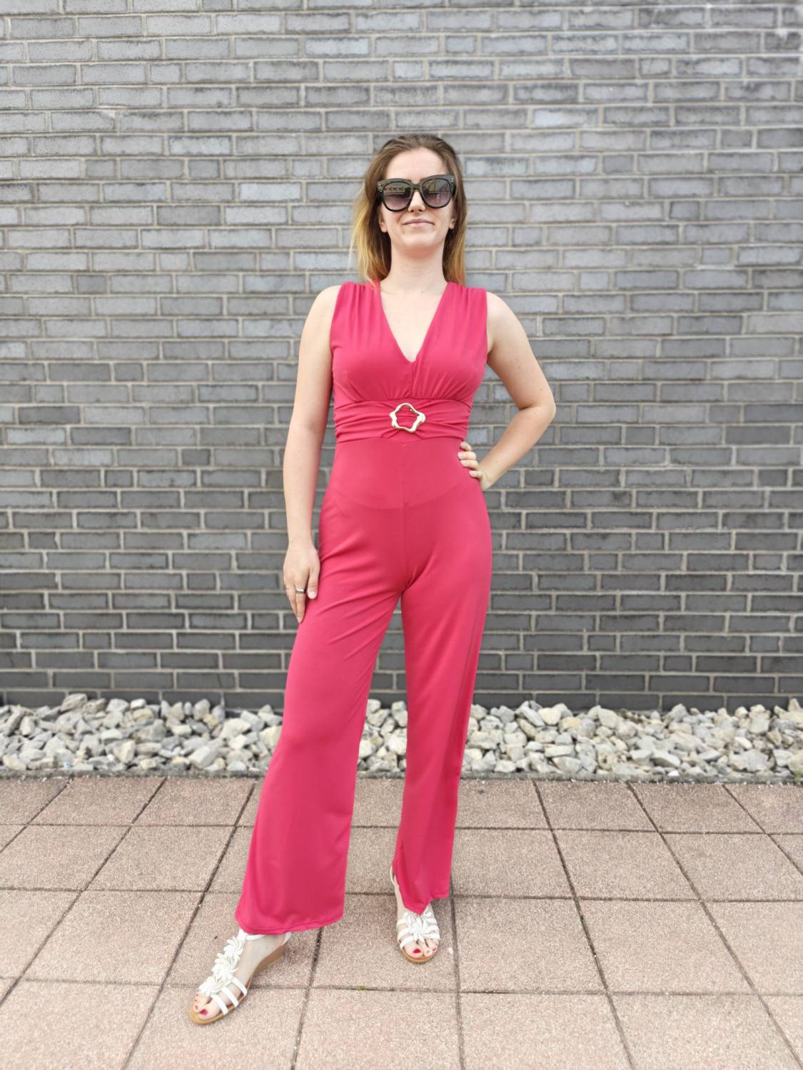 Dlhý jednofarebný overal s ozdobnou sponou.