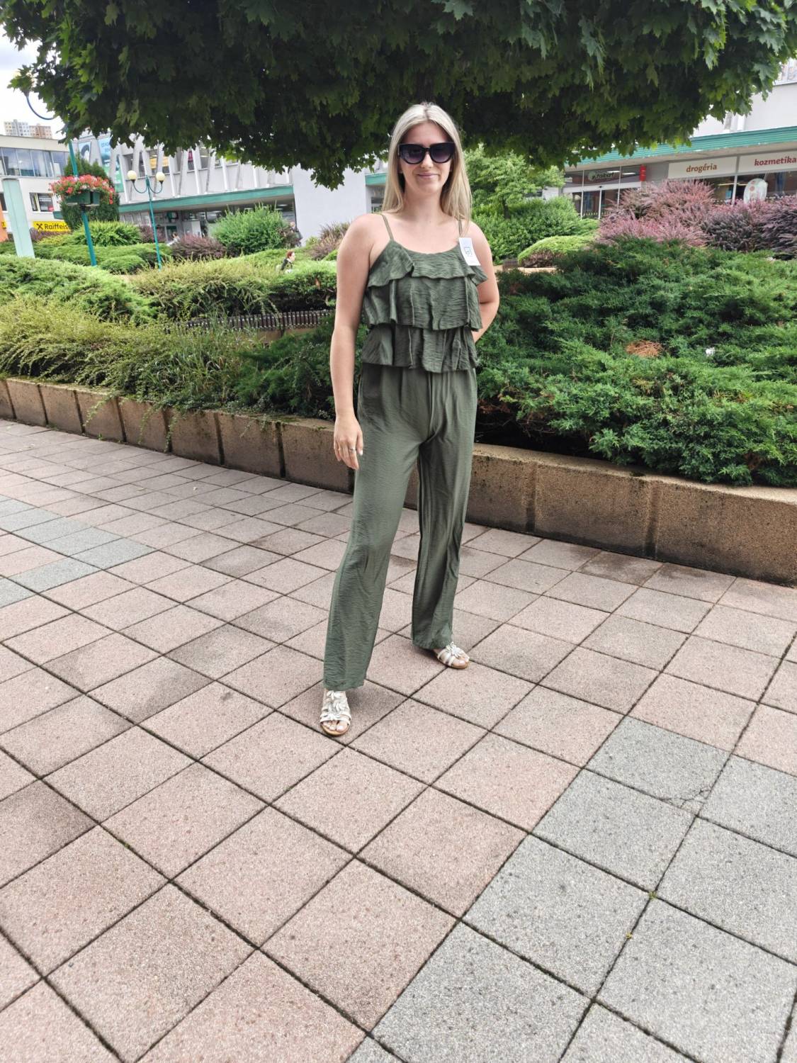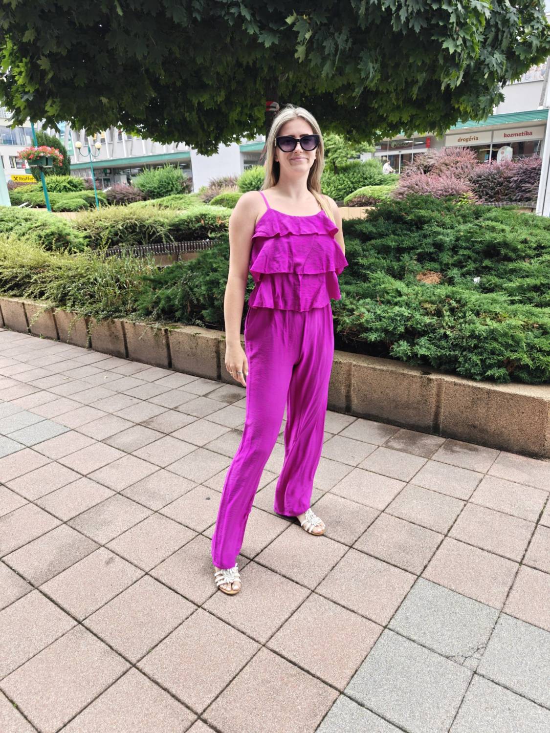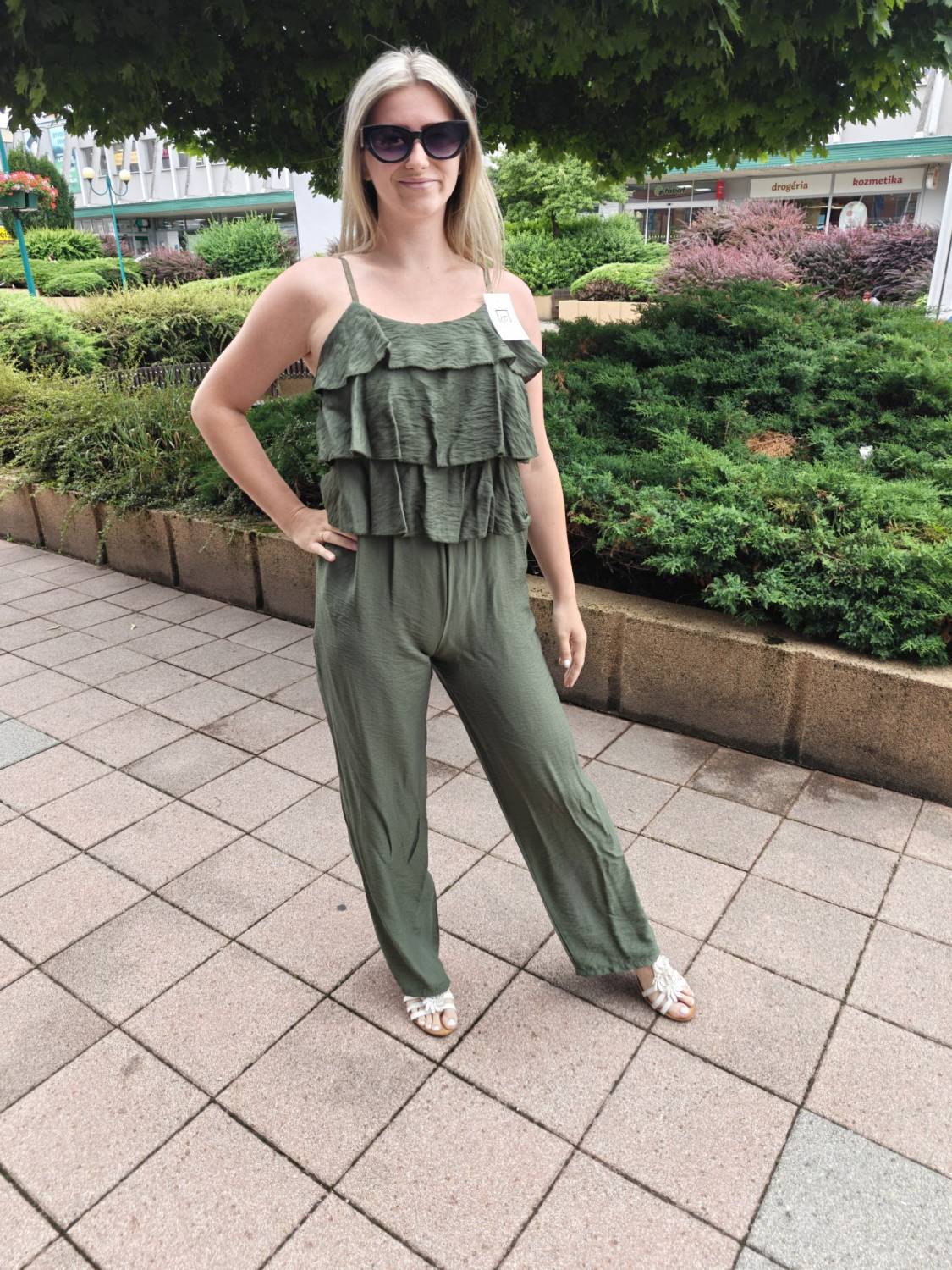 Dlhý jednofarebný overal s volánom na prsiach. Ramienka sú nastaviteľné.