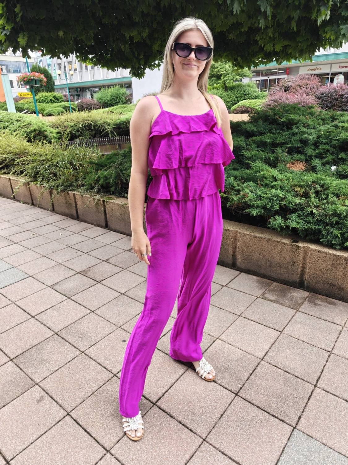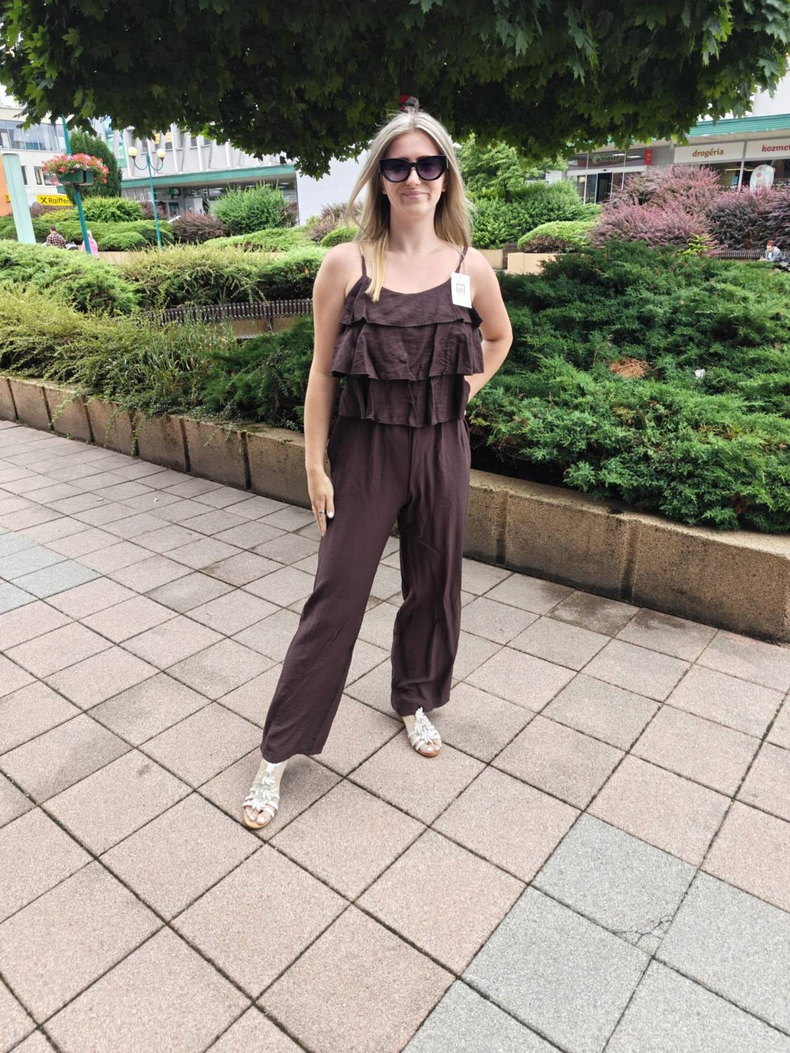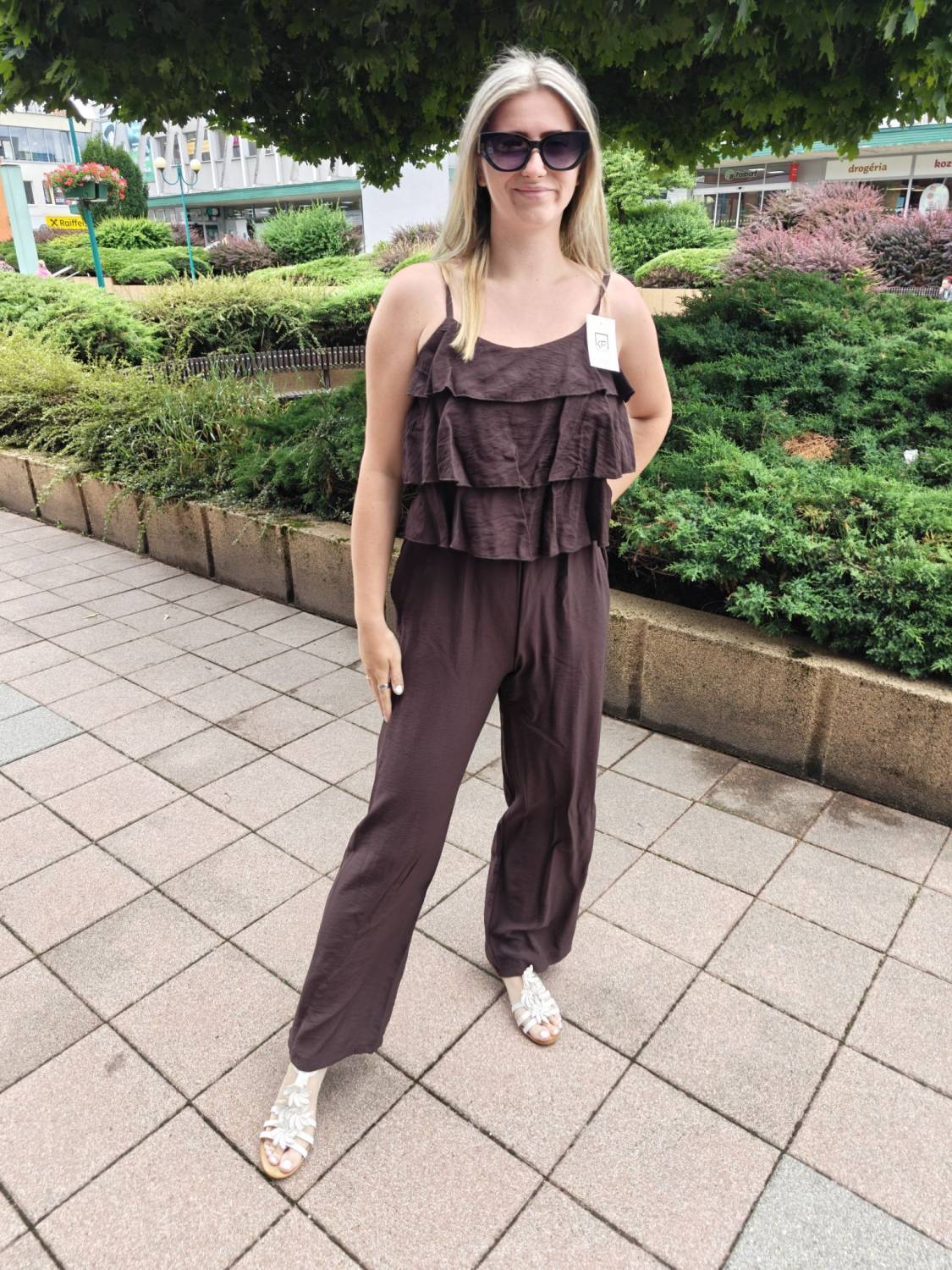 Dlhý jednofarebný overal s volánom na prsiach. Ramienka sú nastaviteľné.
