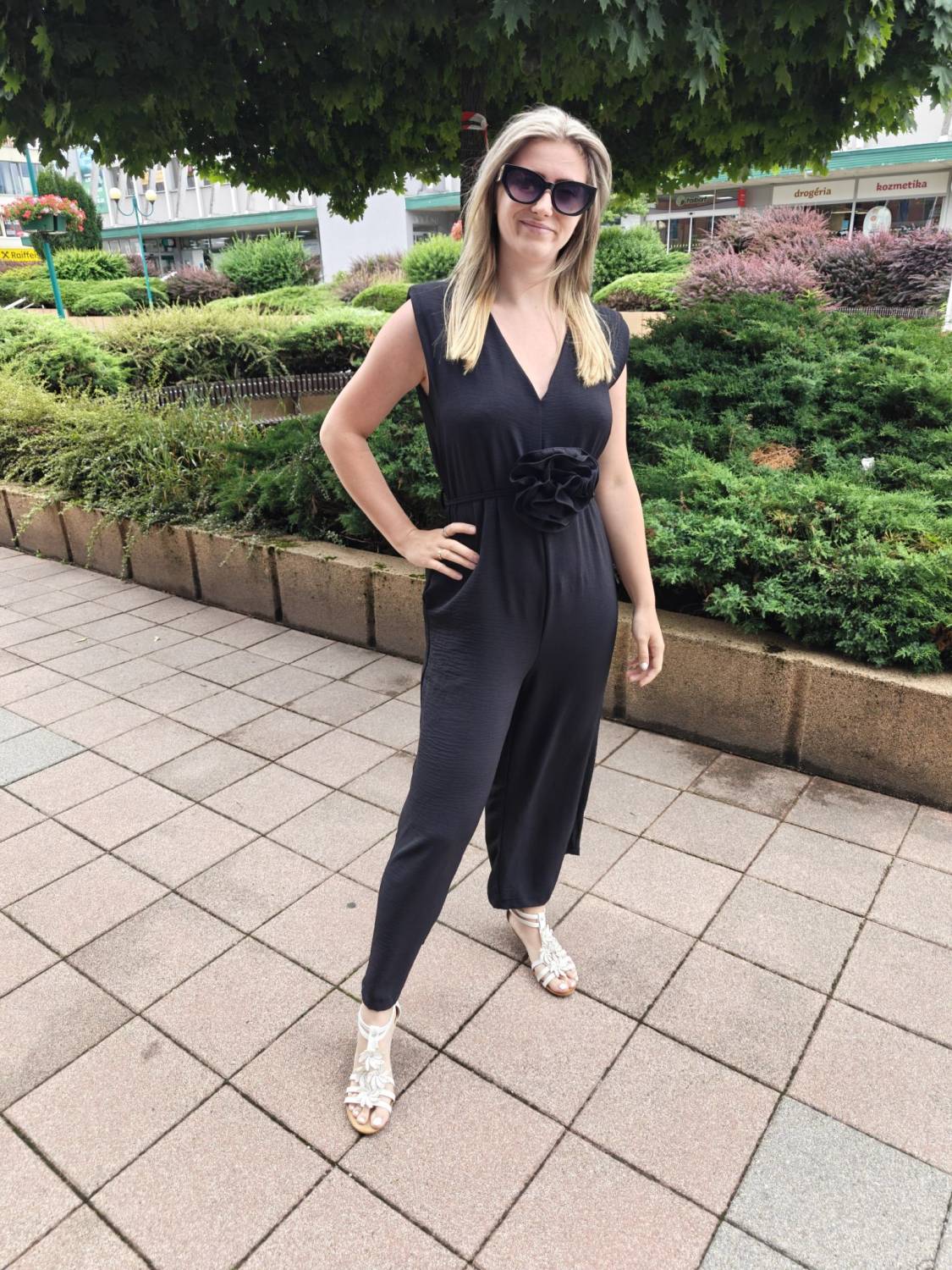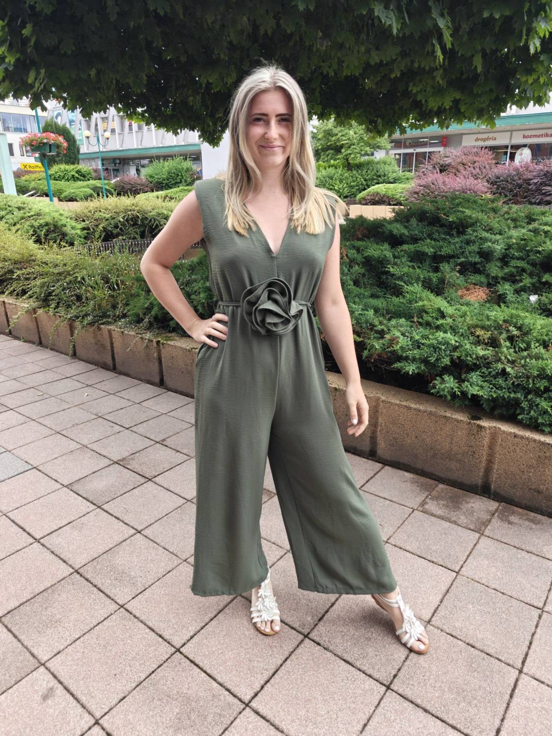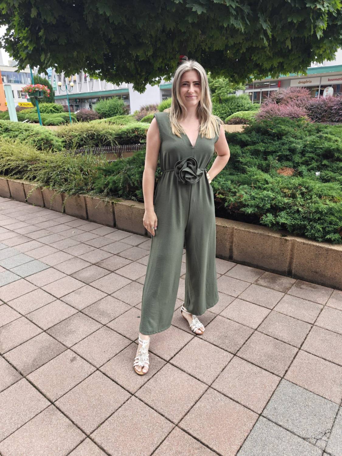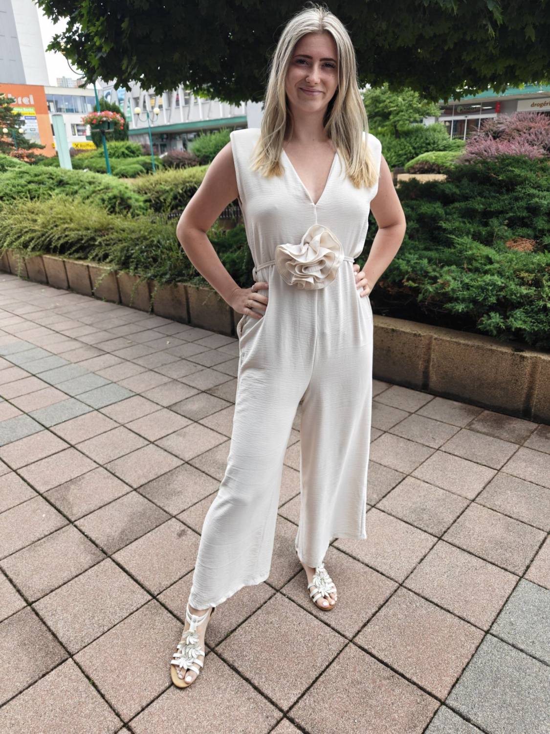 Dlhý jednofarebný overal s opaskom ozdobeným 3D kvetom.
