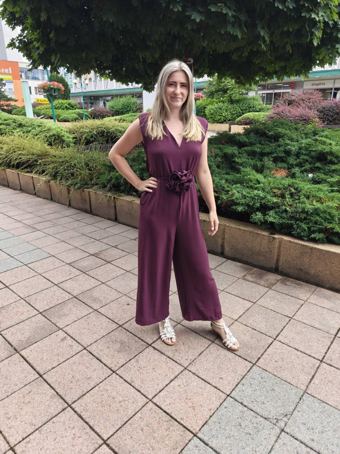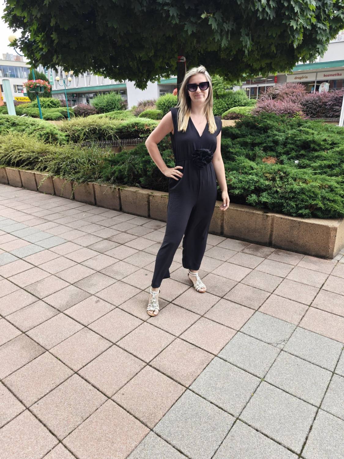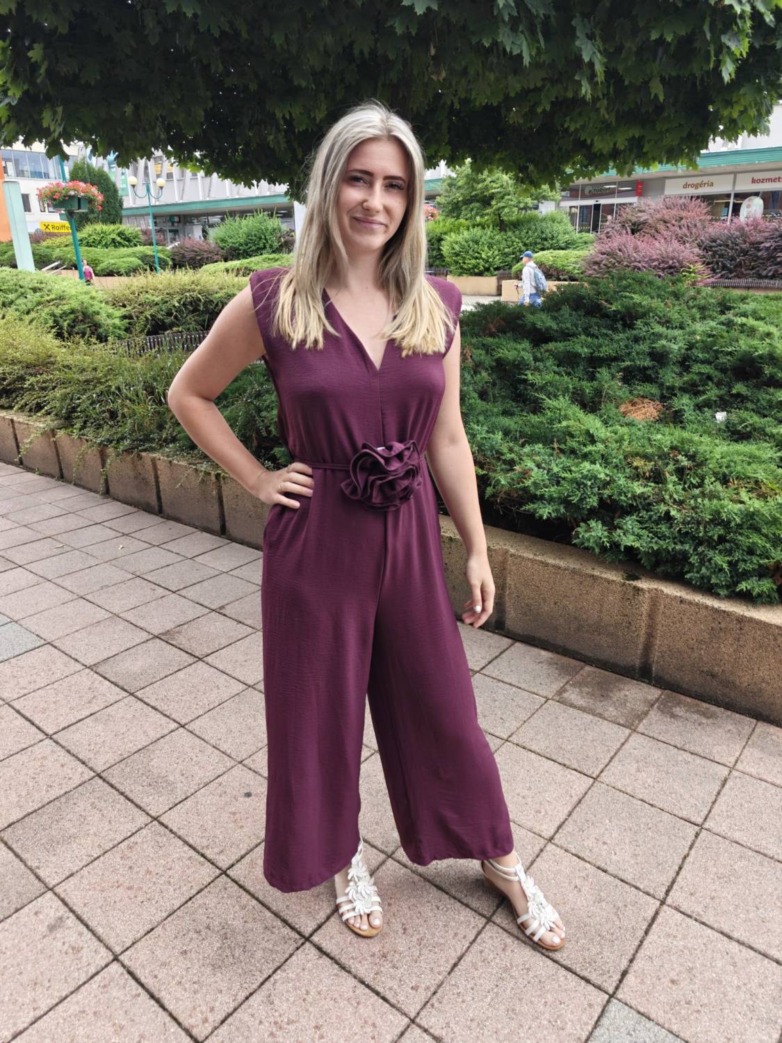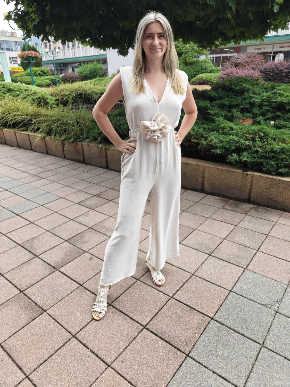 Dlhý jednofarebný overal s opaskom ozdobeným 3D kvetom.