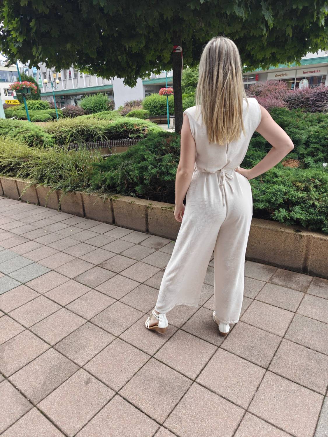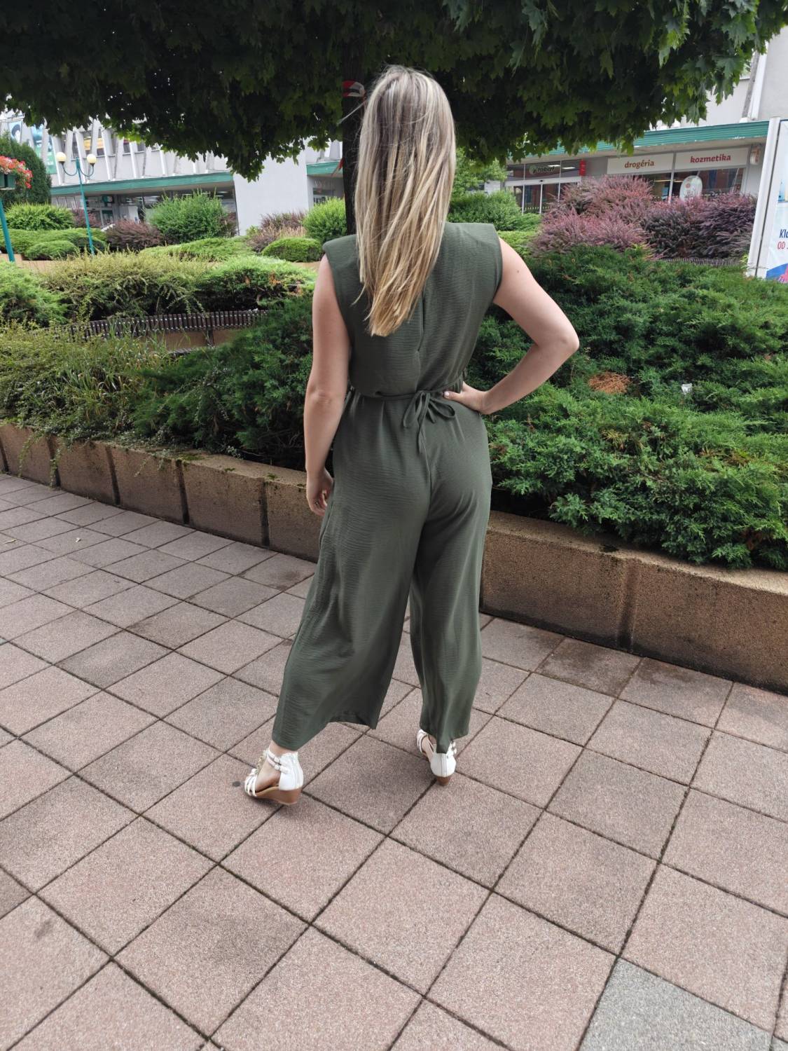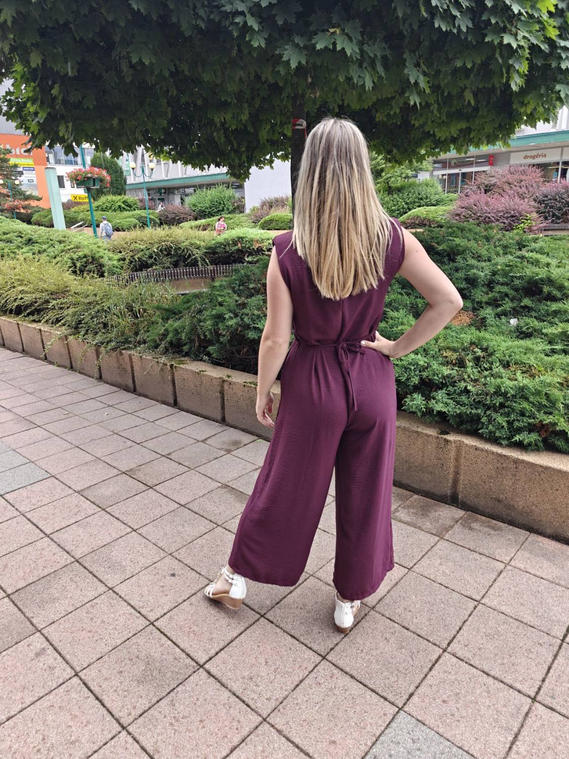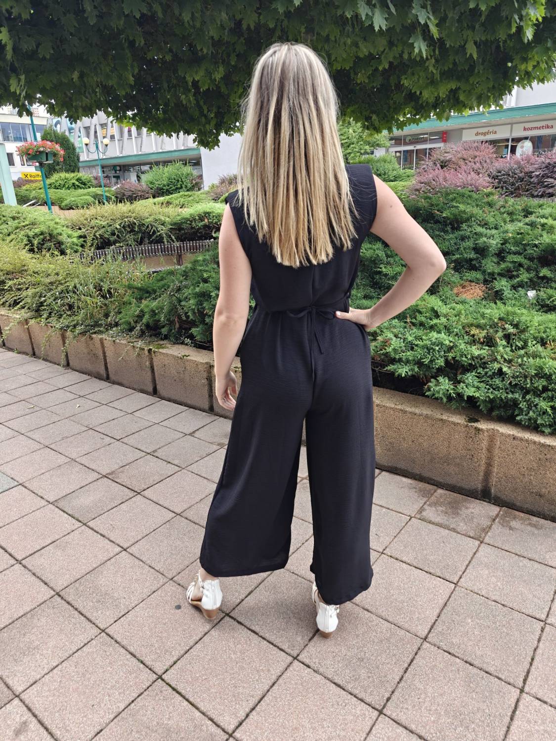 Dlhý jednofarebný overal s opaskom ozdobeným 3D kvetom.