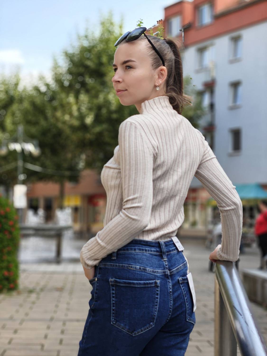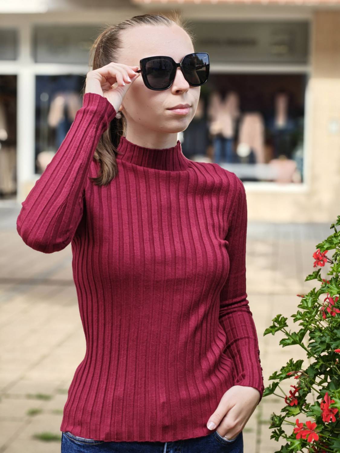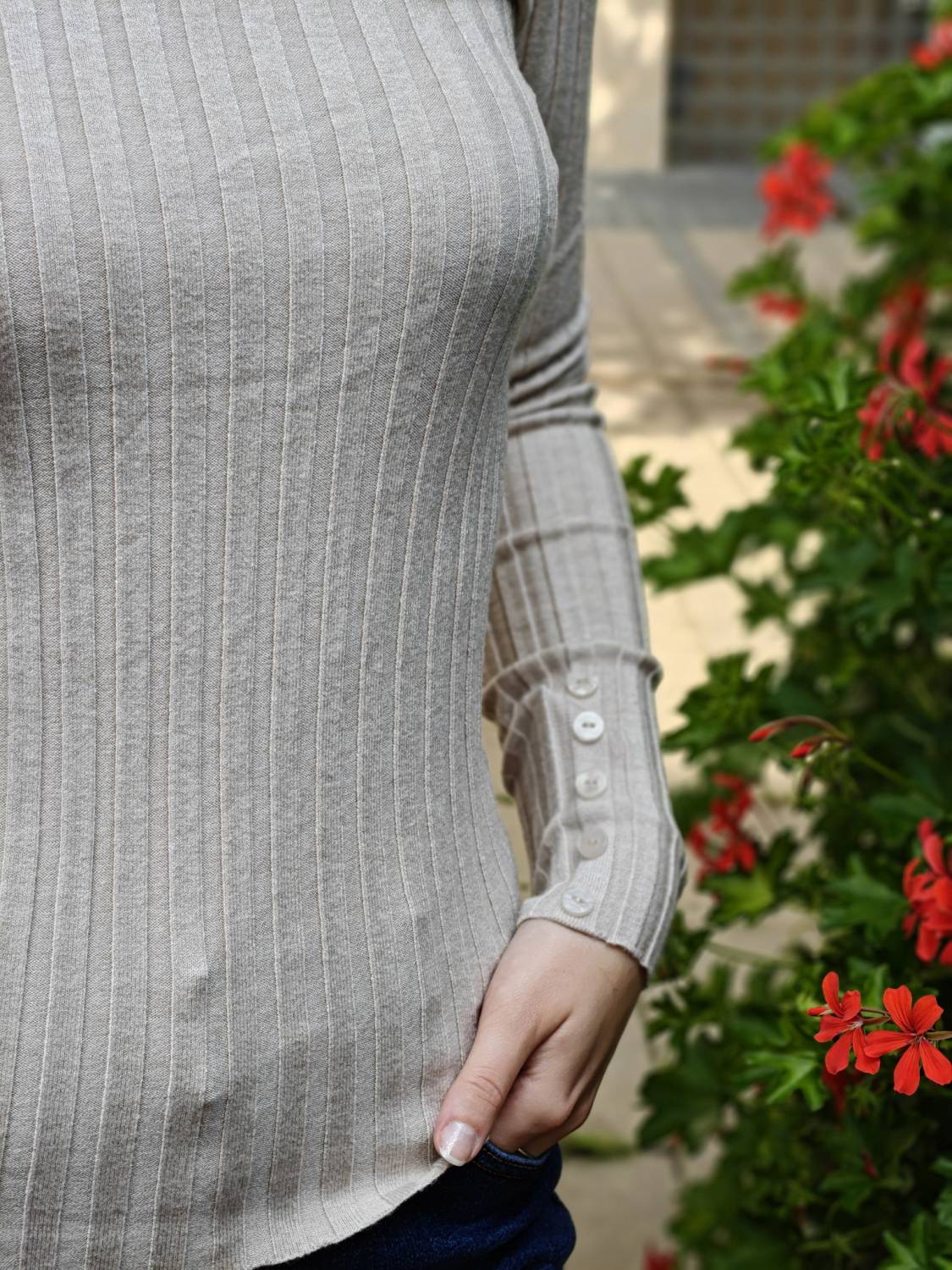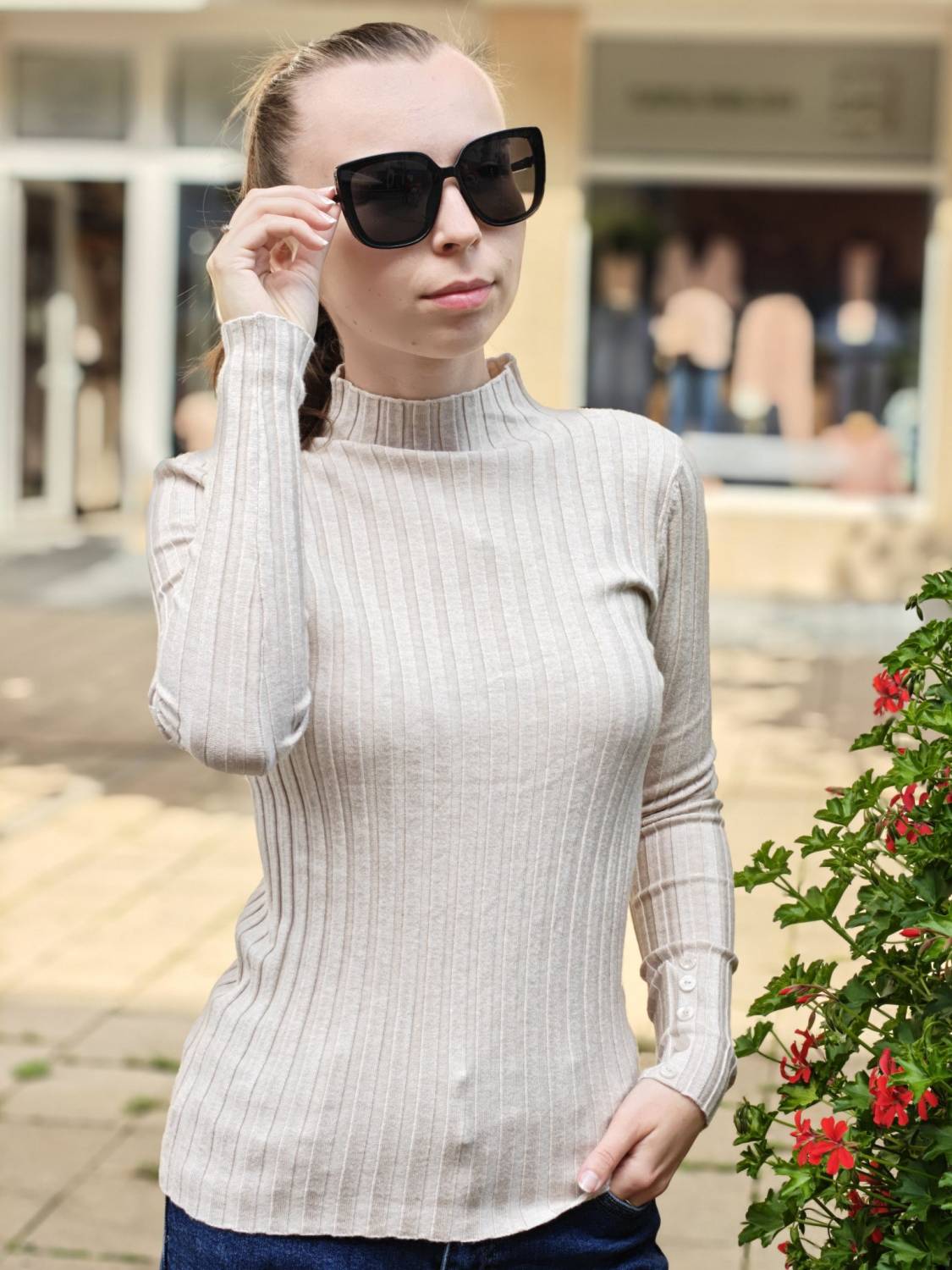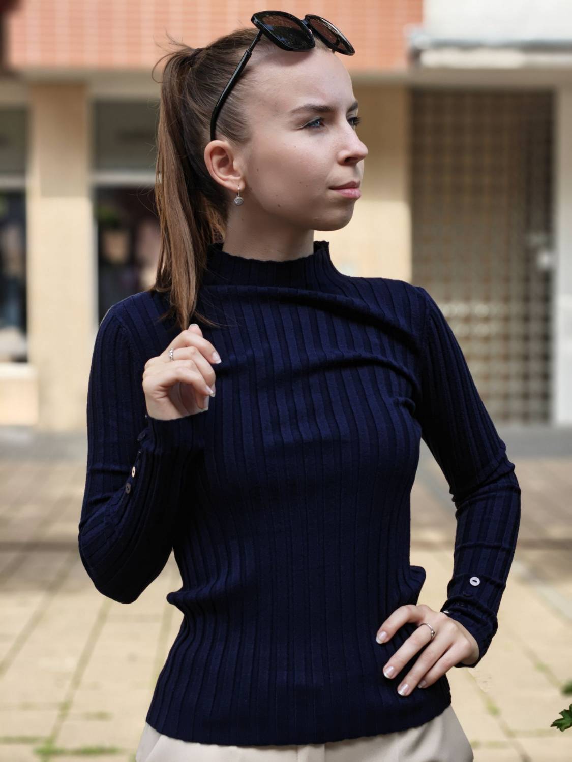 Pulóvrik so stojačikom, na rukáve sú ozdobné gombíky.