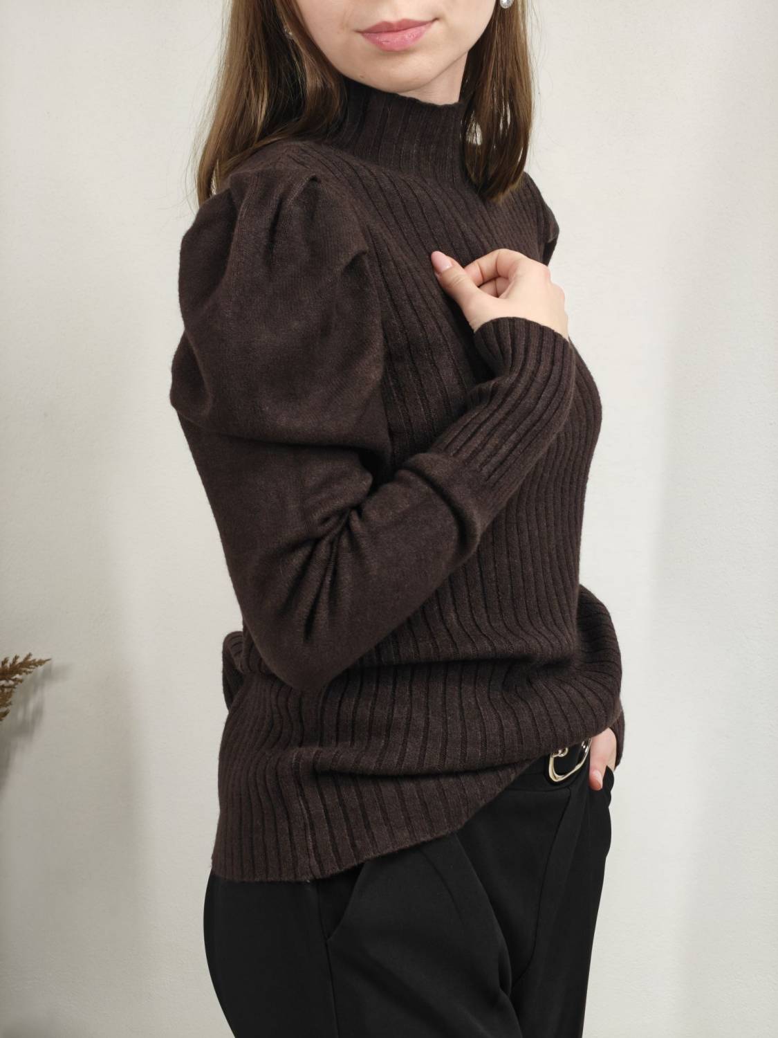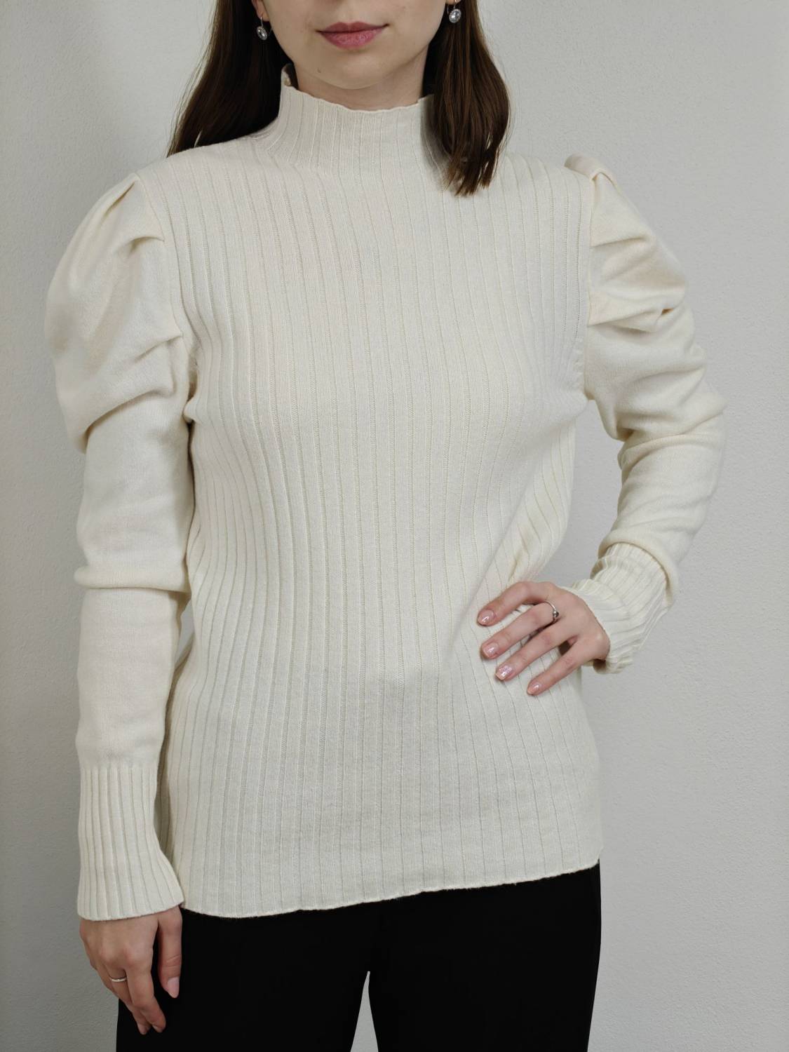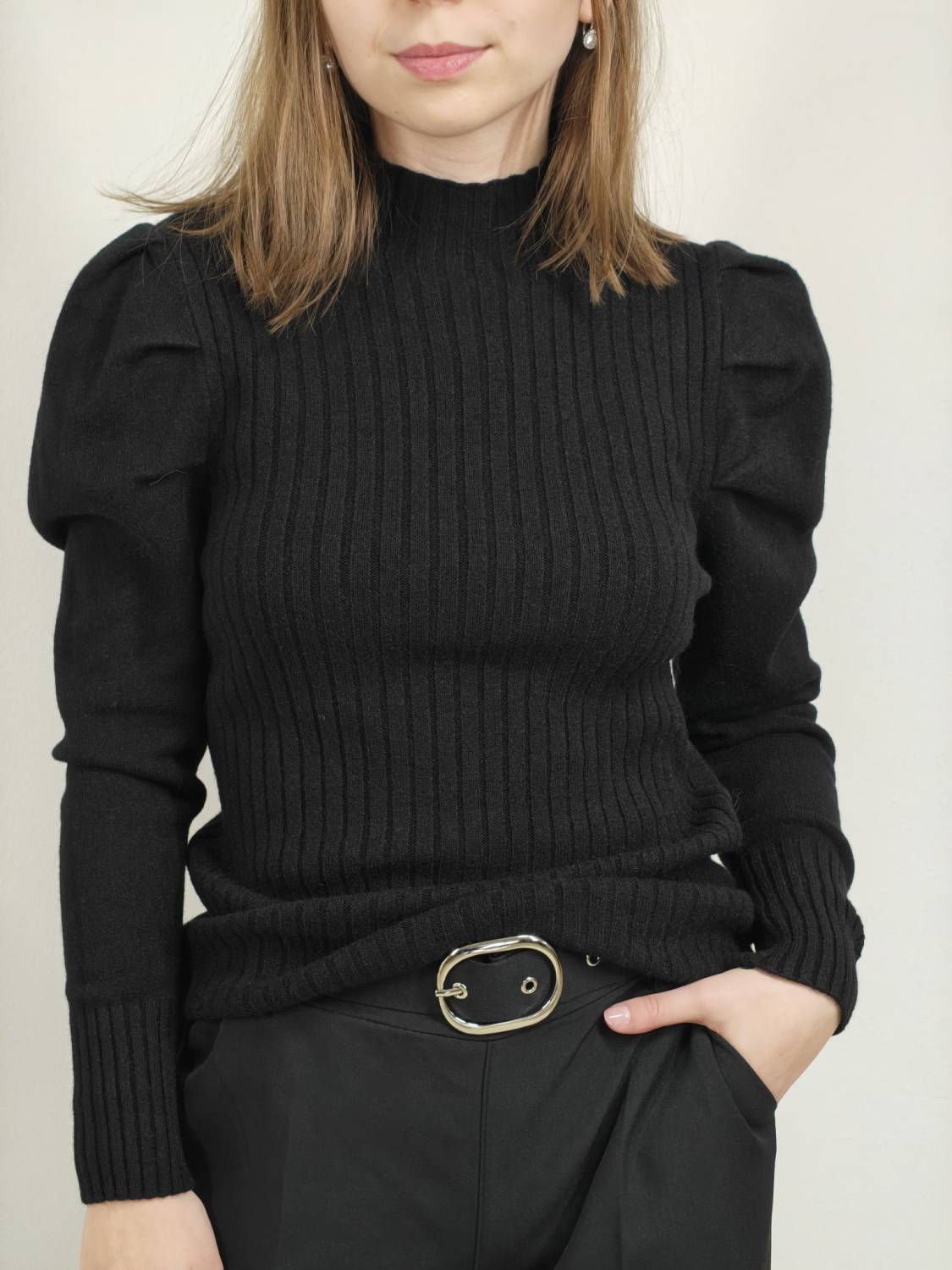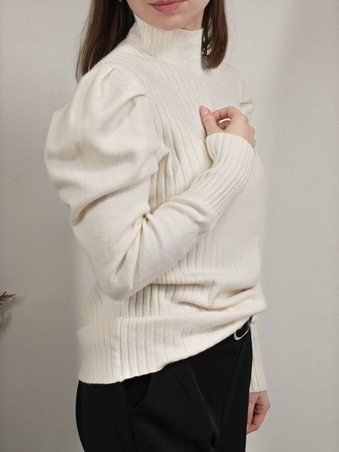 Elastický pulóver ku krku s jemným rebrovaním. Rukáv je nazberaný a zakončený patentom.