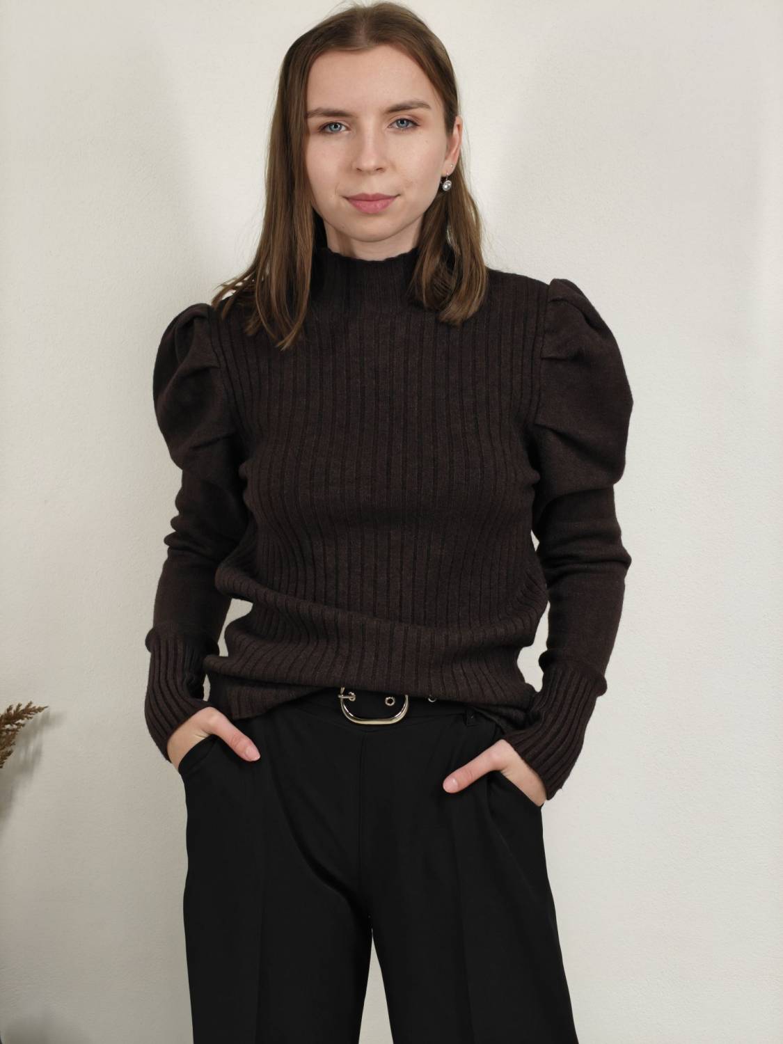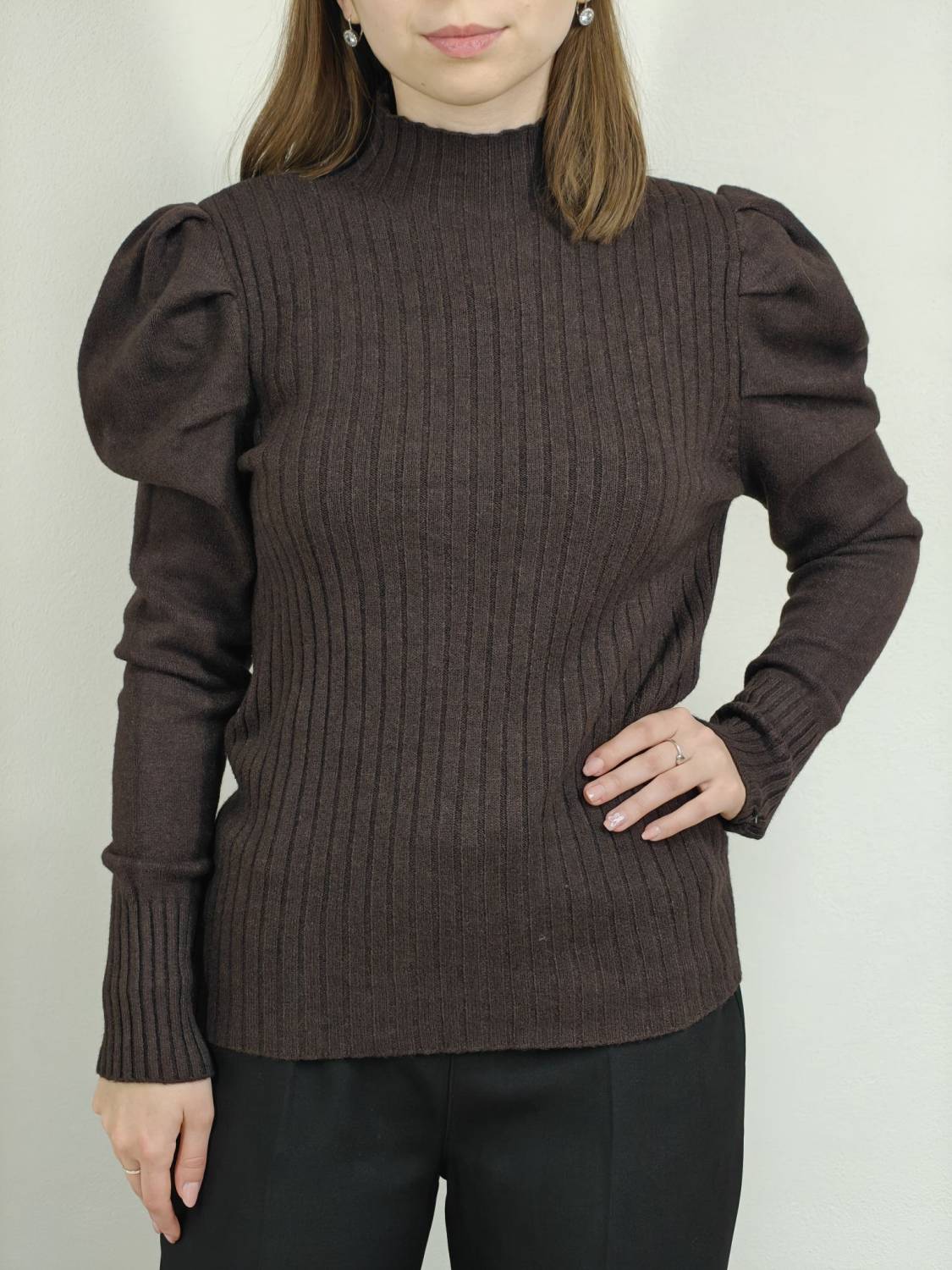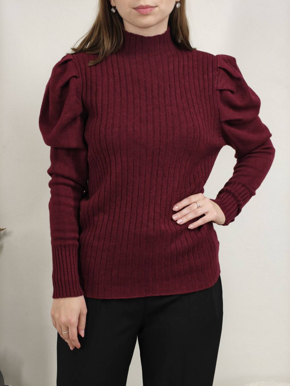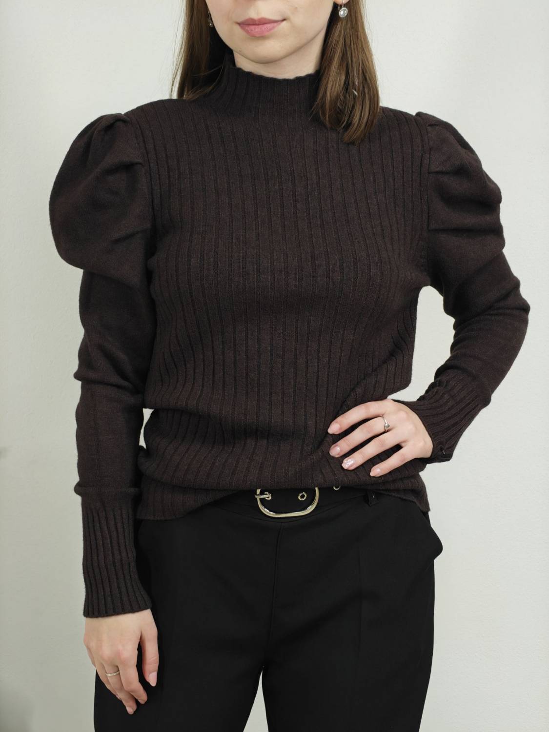 Elastický pulóver ku krku s jemným rebrovaním. Rukáv je nazberaný a zakončený patentom.