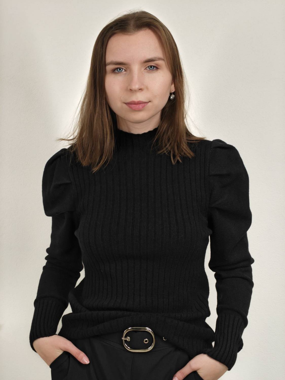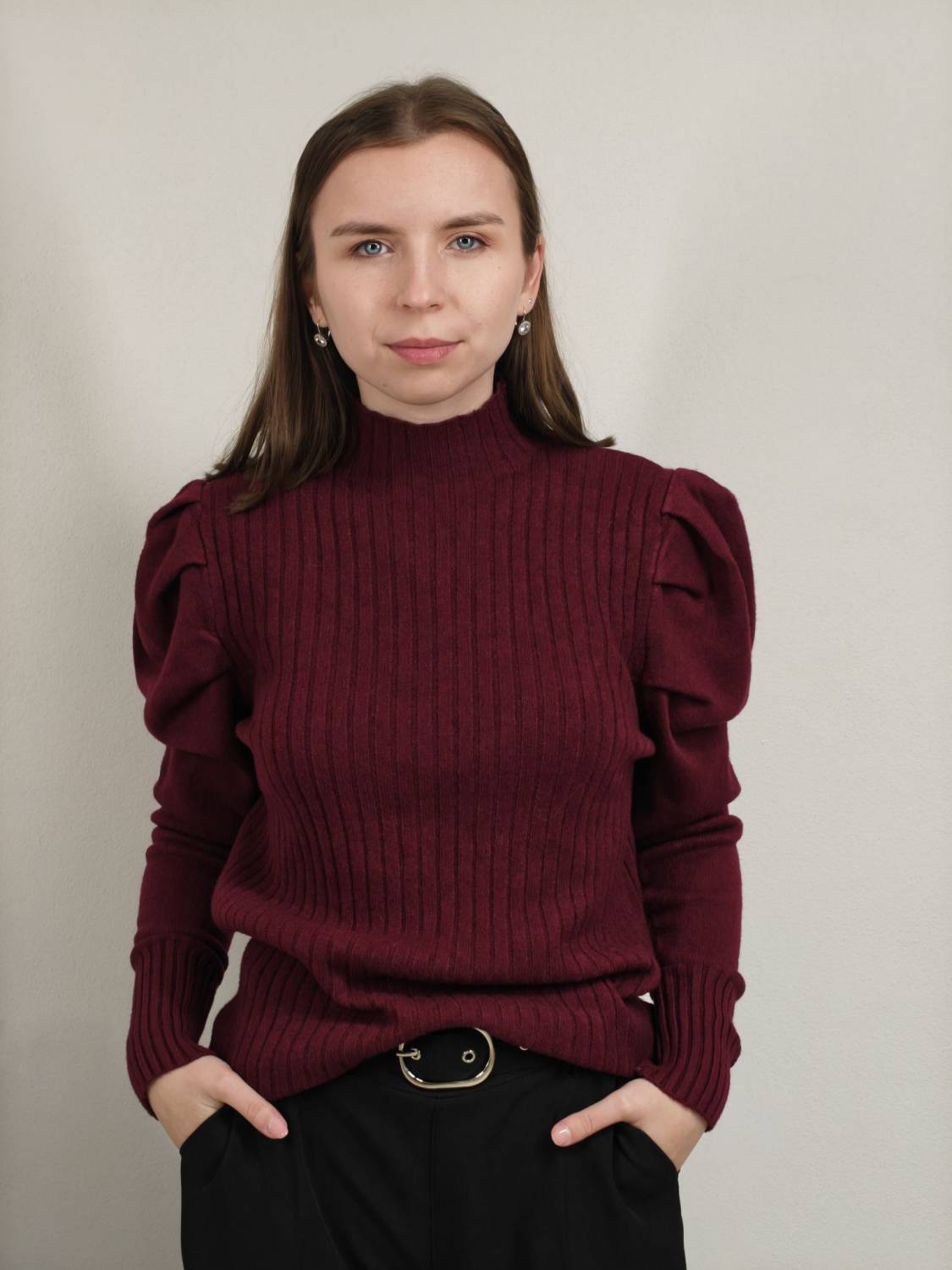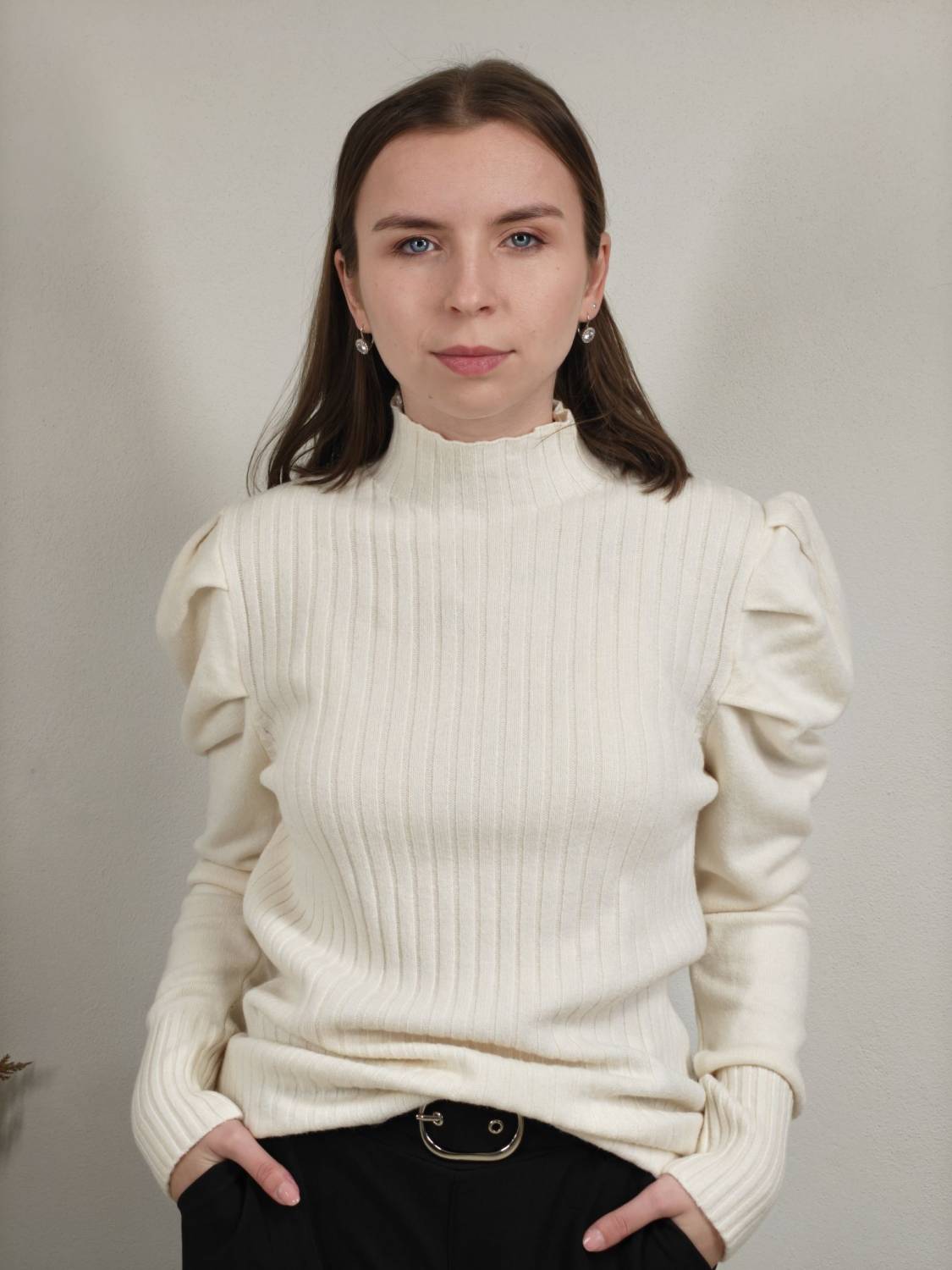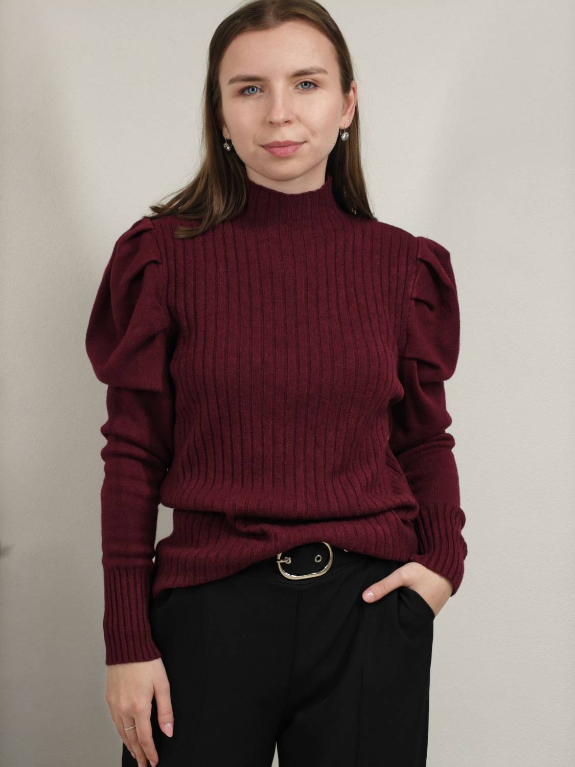 Elastický pulóver ku krku s jemným rebrovaním. Rukáv je nazberaný a zakončený patentom.
