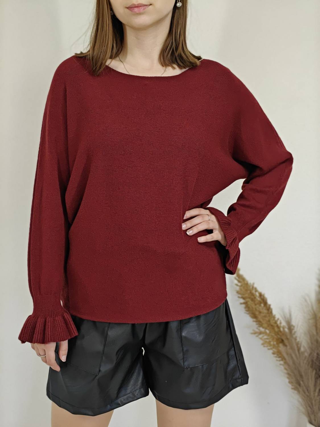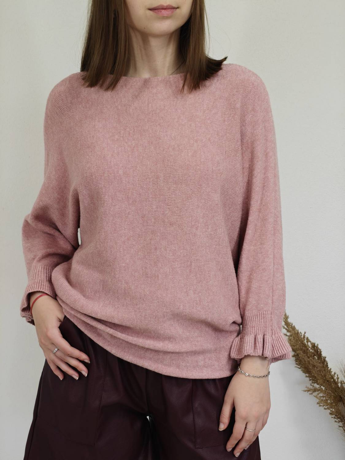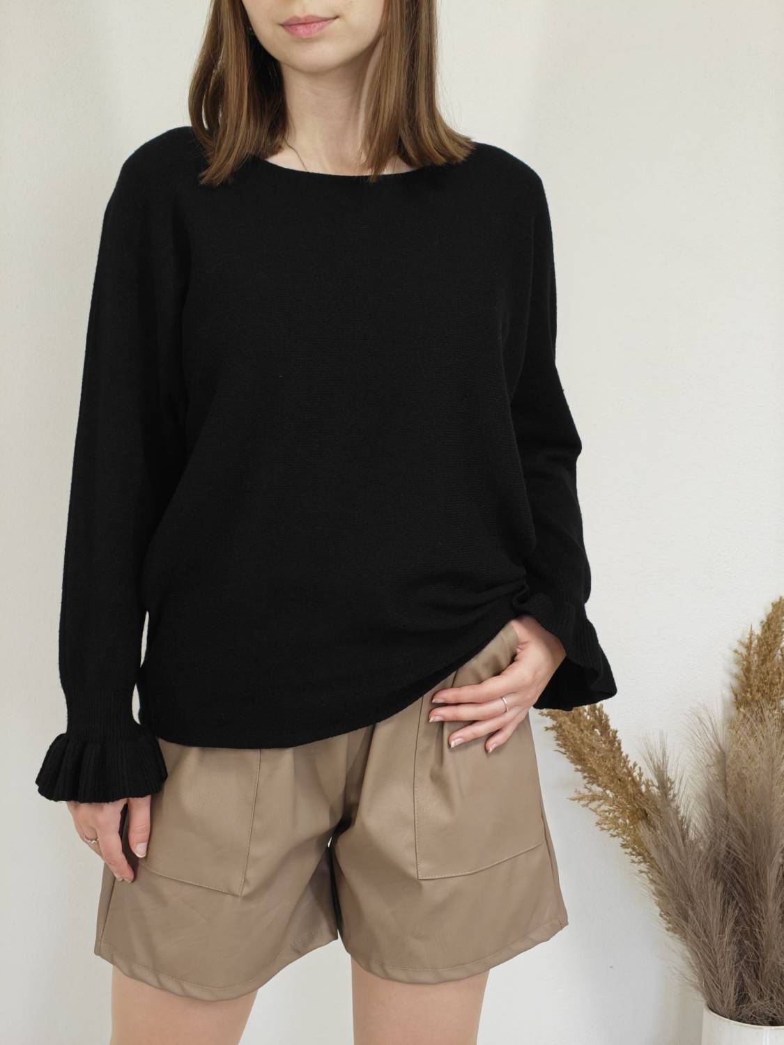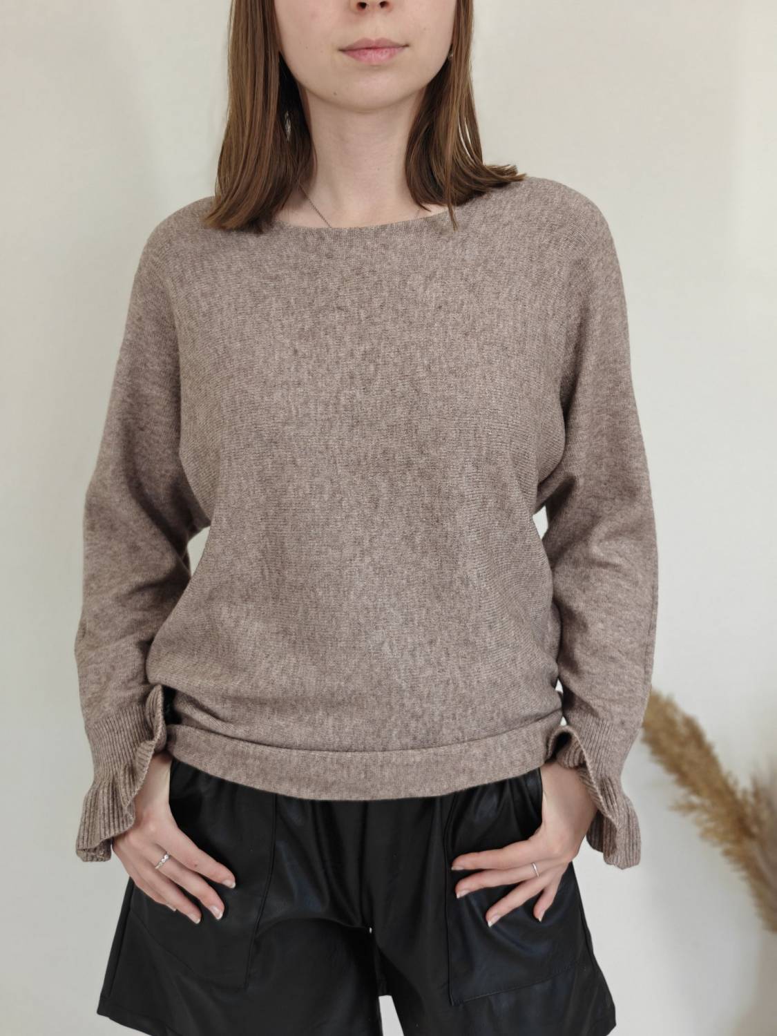 Jednofarebný pulóvrik s okrúhlym výstrihom a s volánom na rukáve.