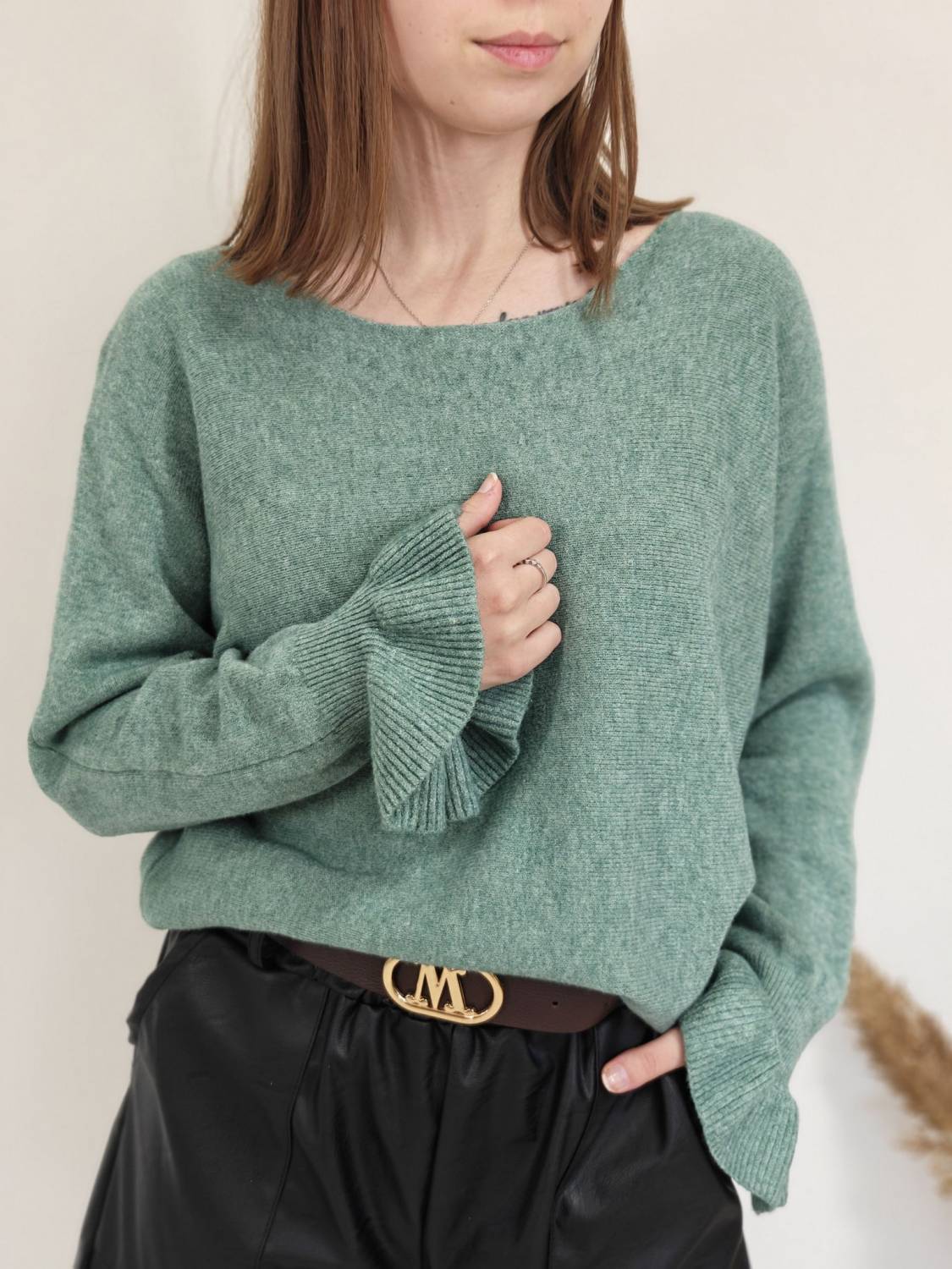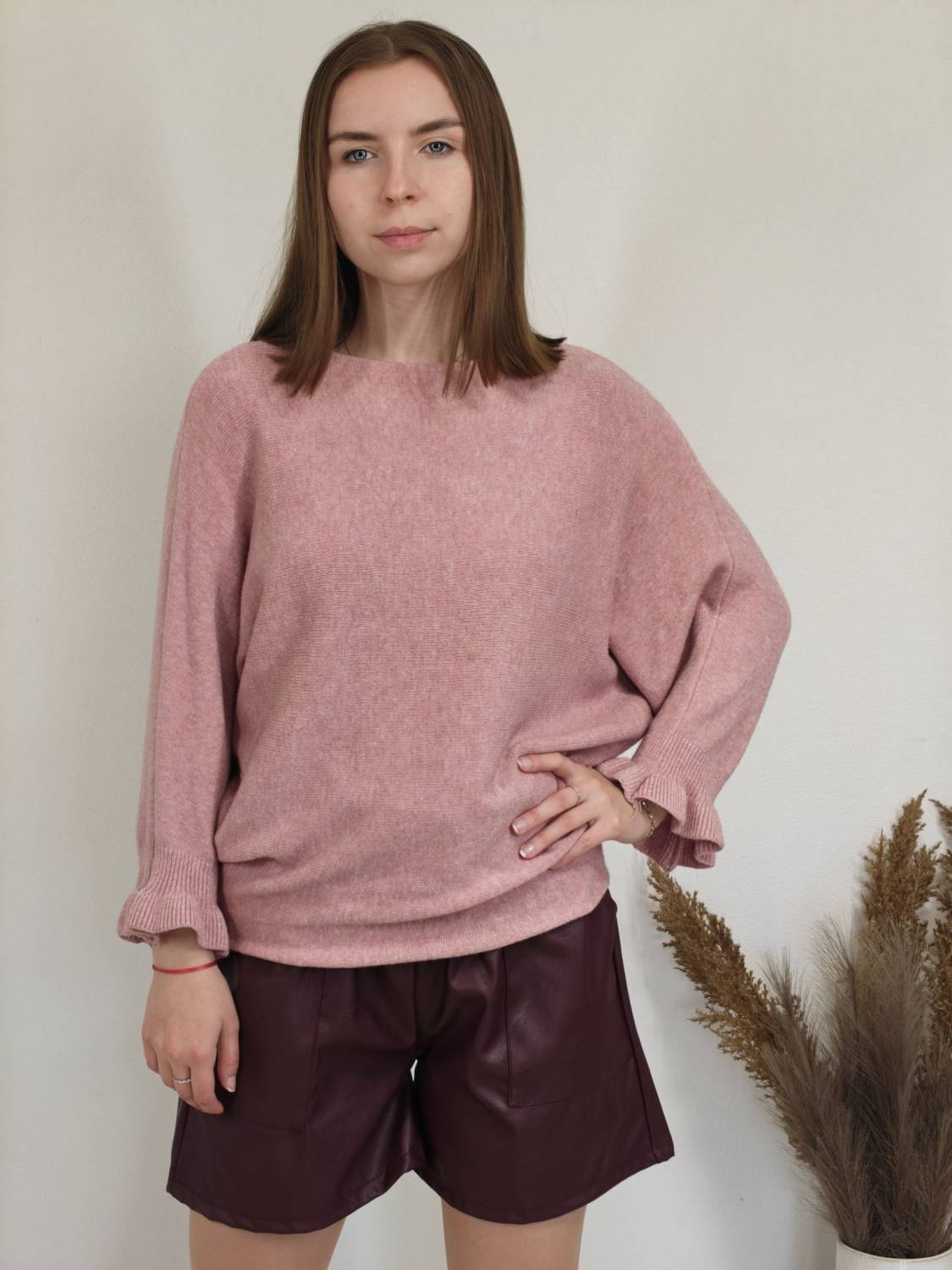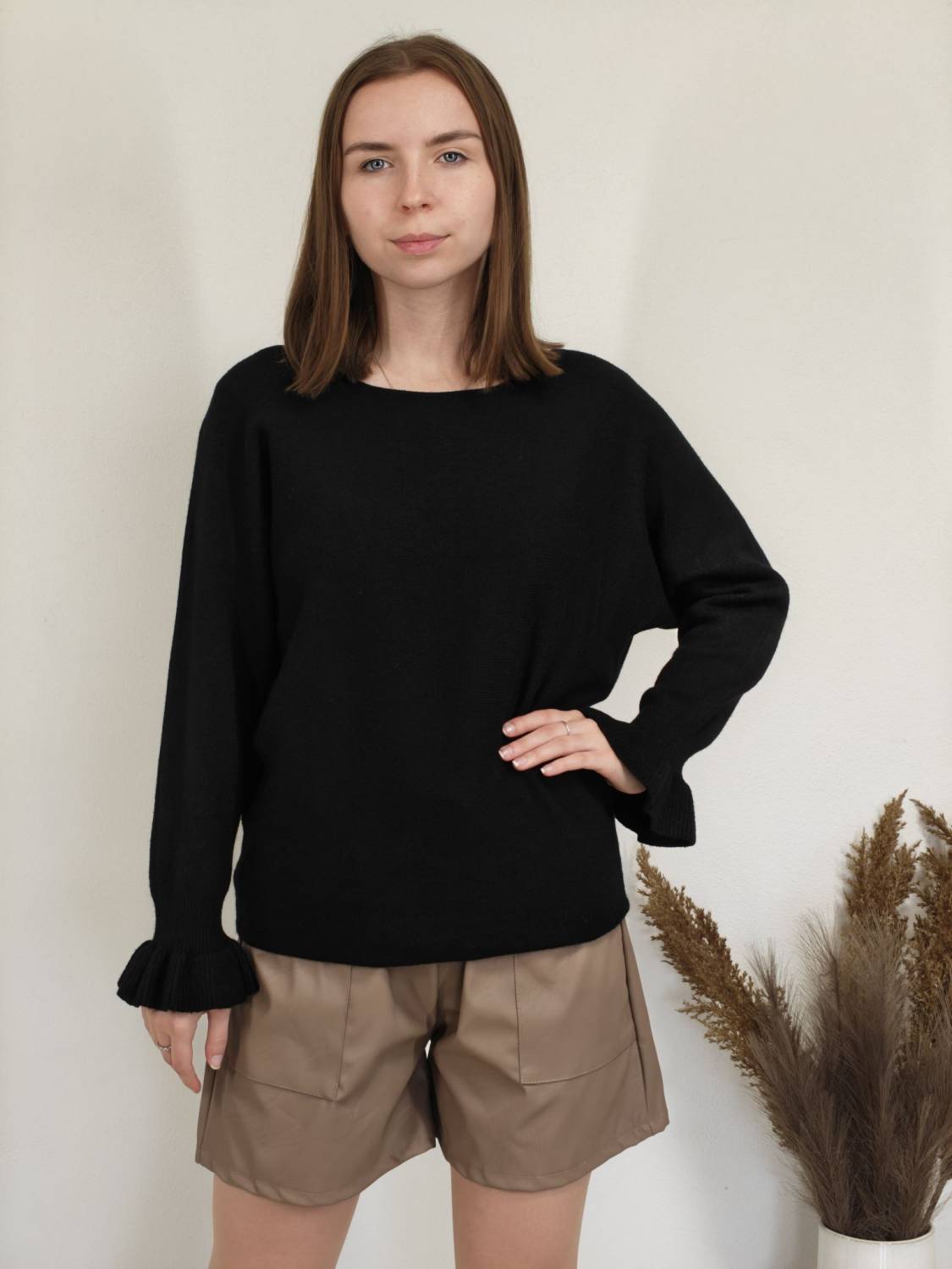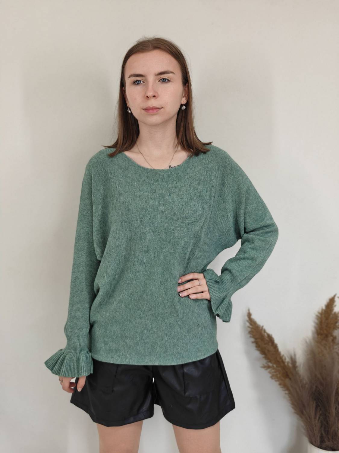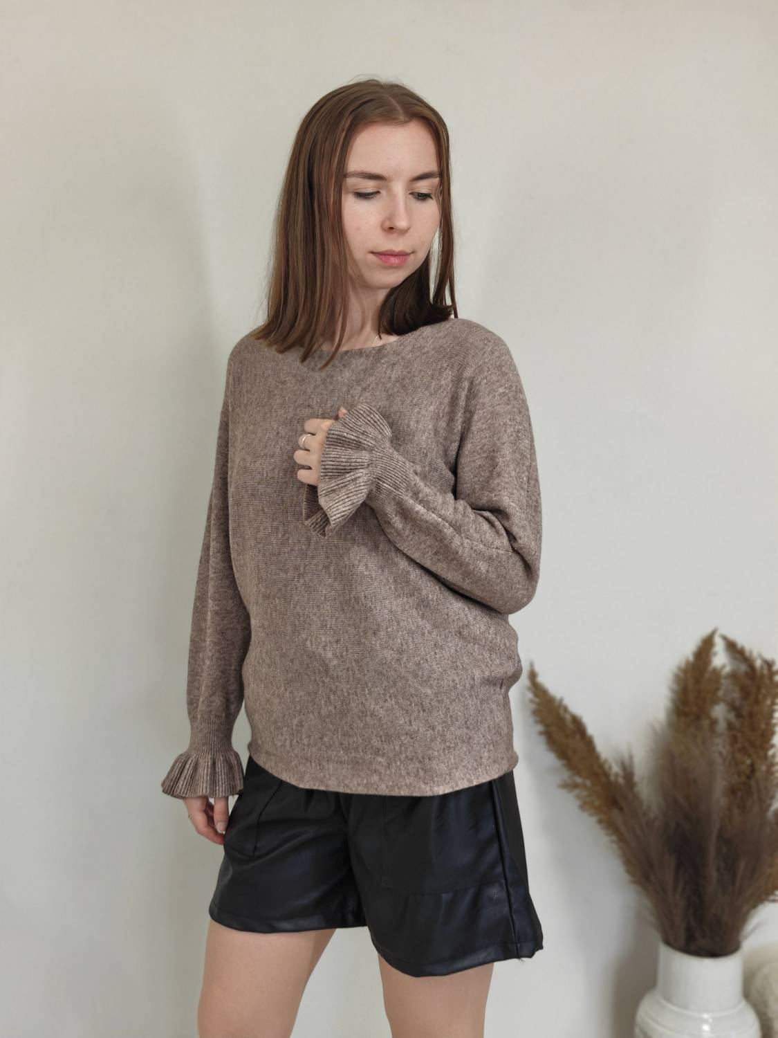 Jednofarebný pulóvrik s okrúhlym výstrihom a s volánom na rukáve.