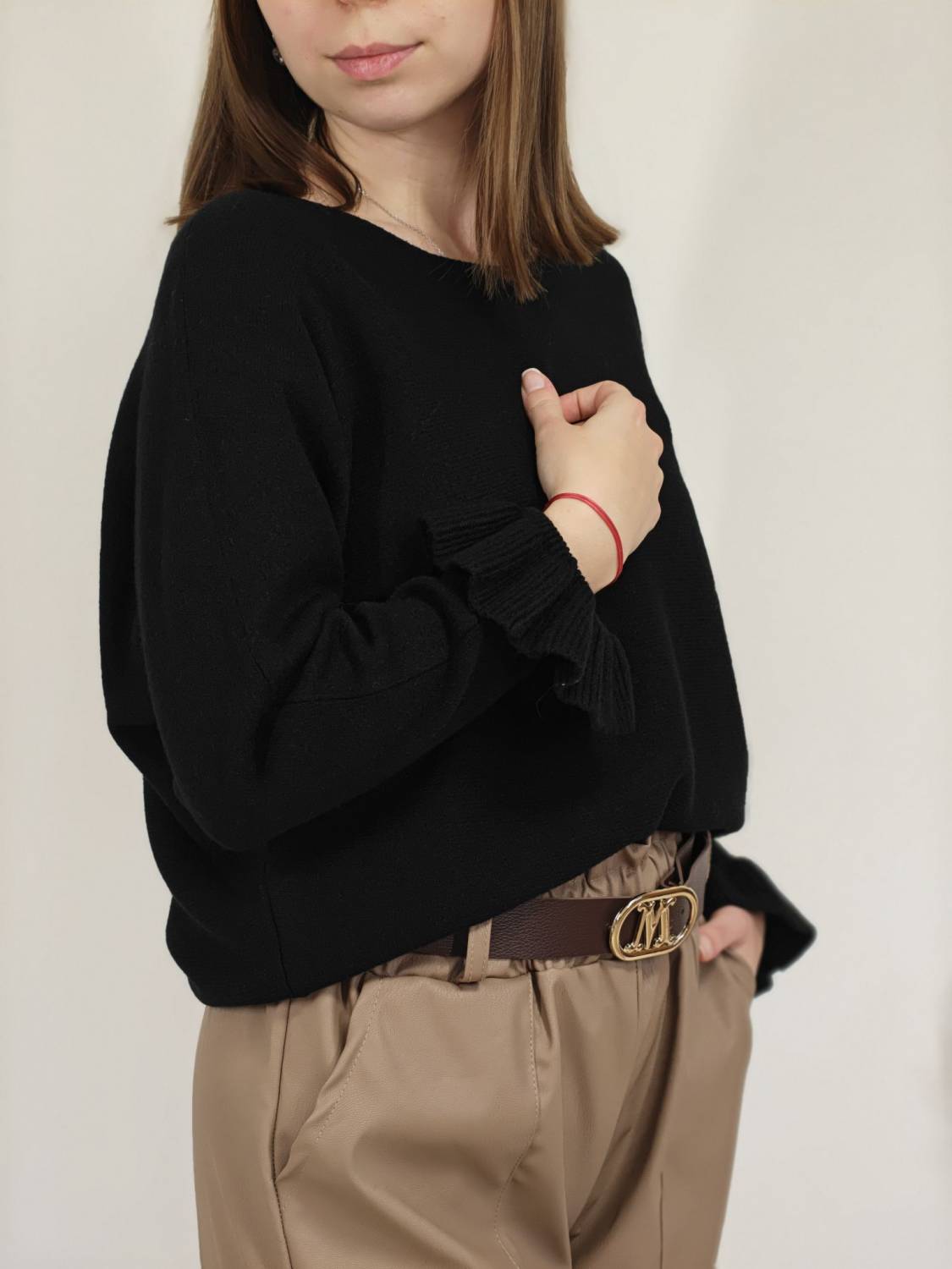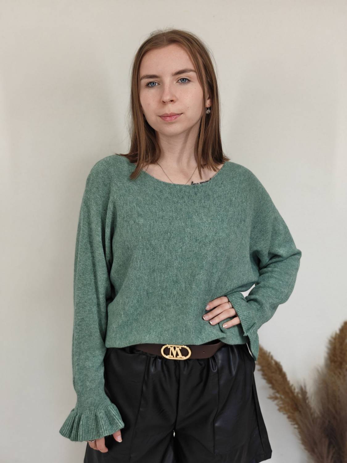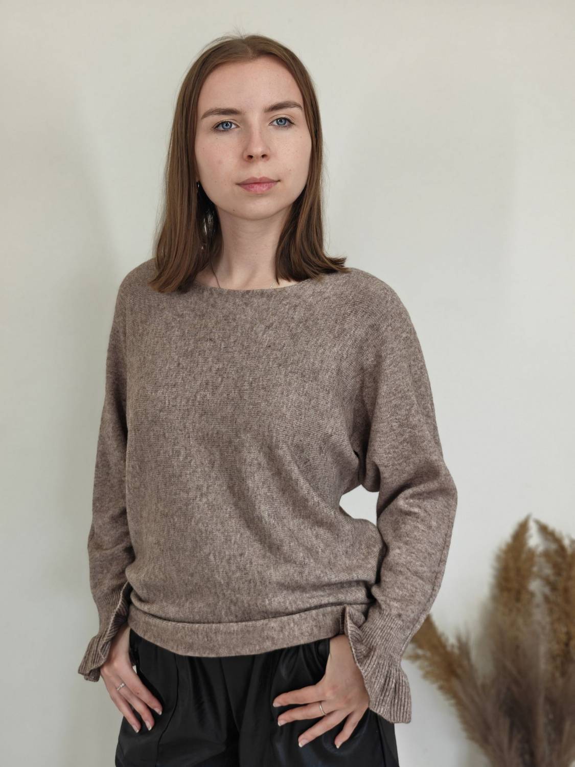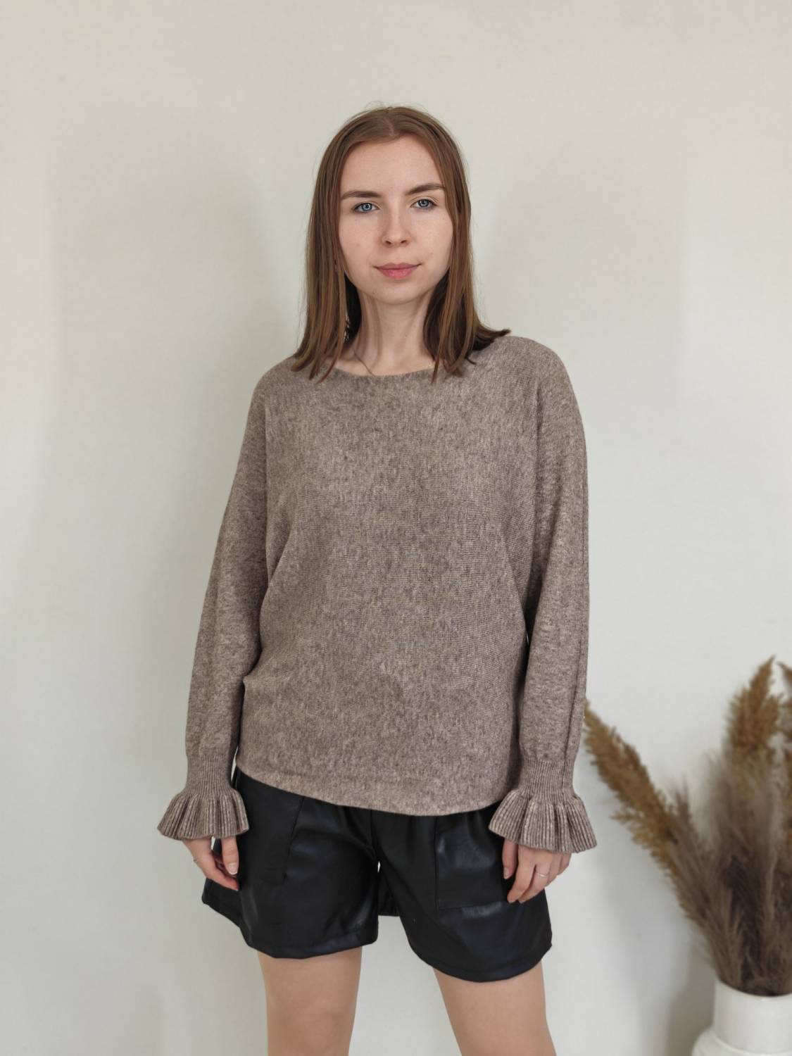 Jednofarebný pulóvrik s okrúhlym výstrihom a s volánom na rukáve.