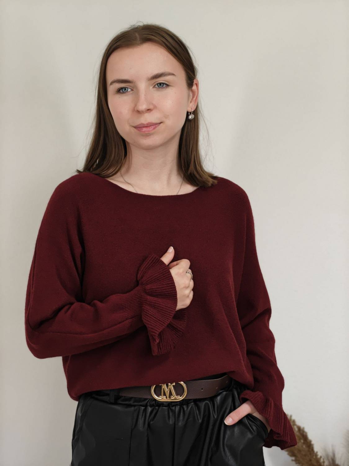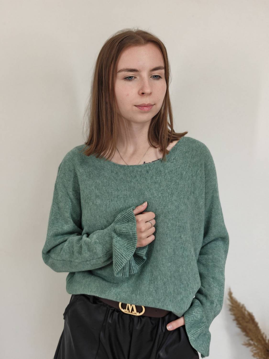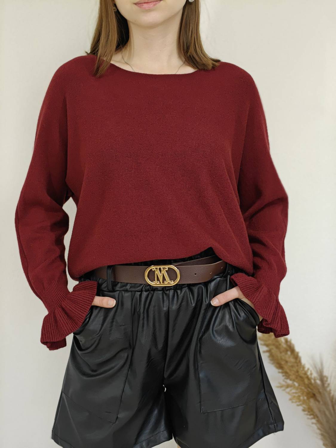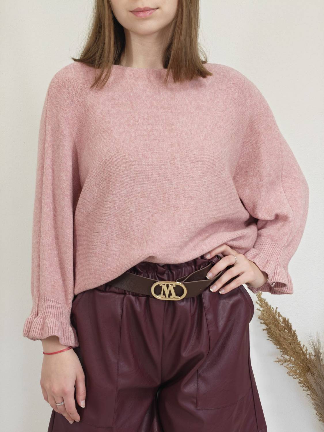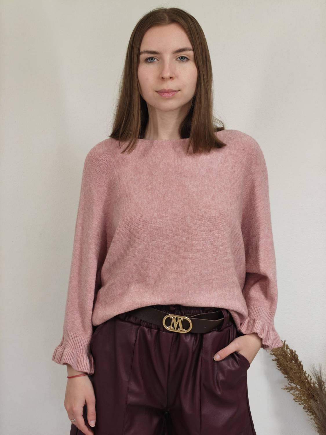 Jednofarebný pulóvrik s okrúhlym výstrihom a s volánom na rukáve.