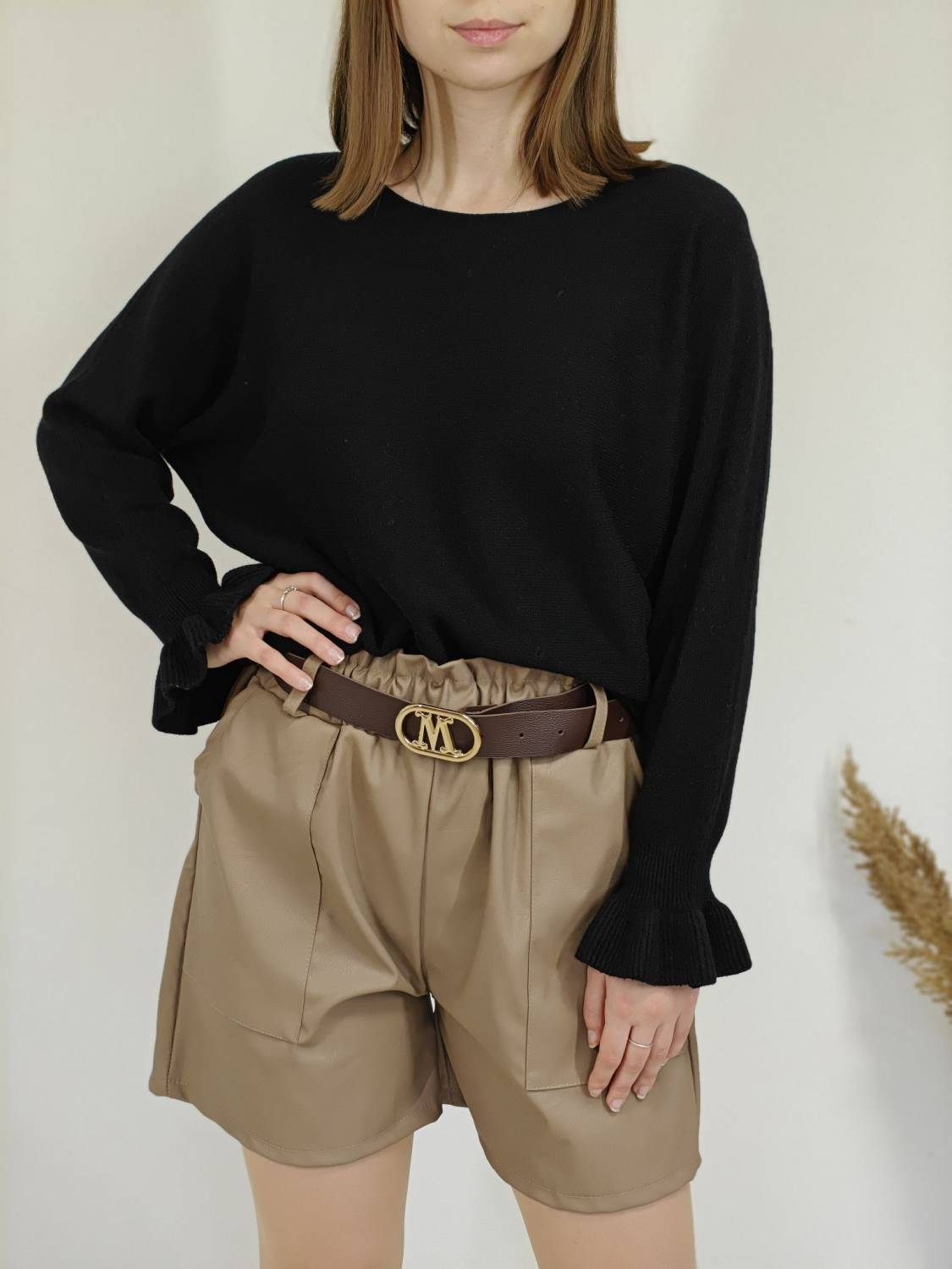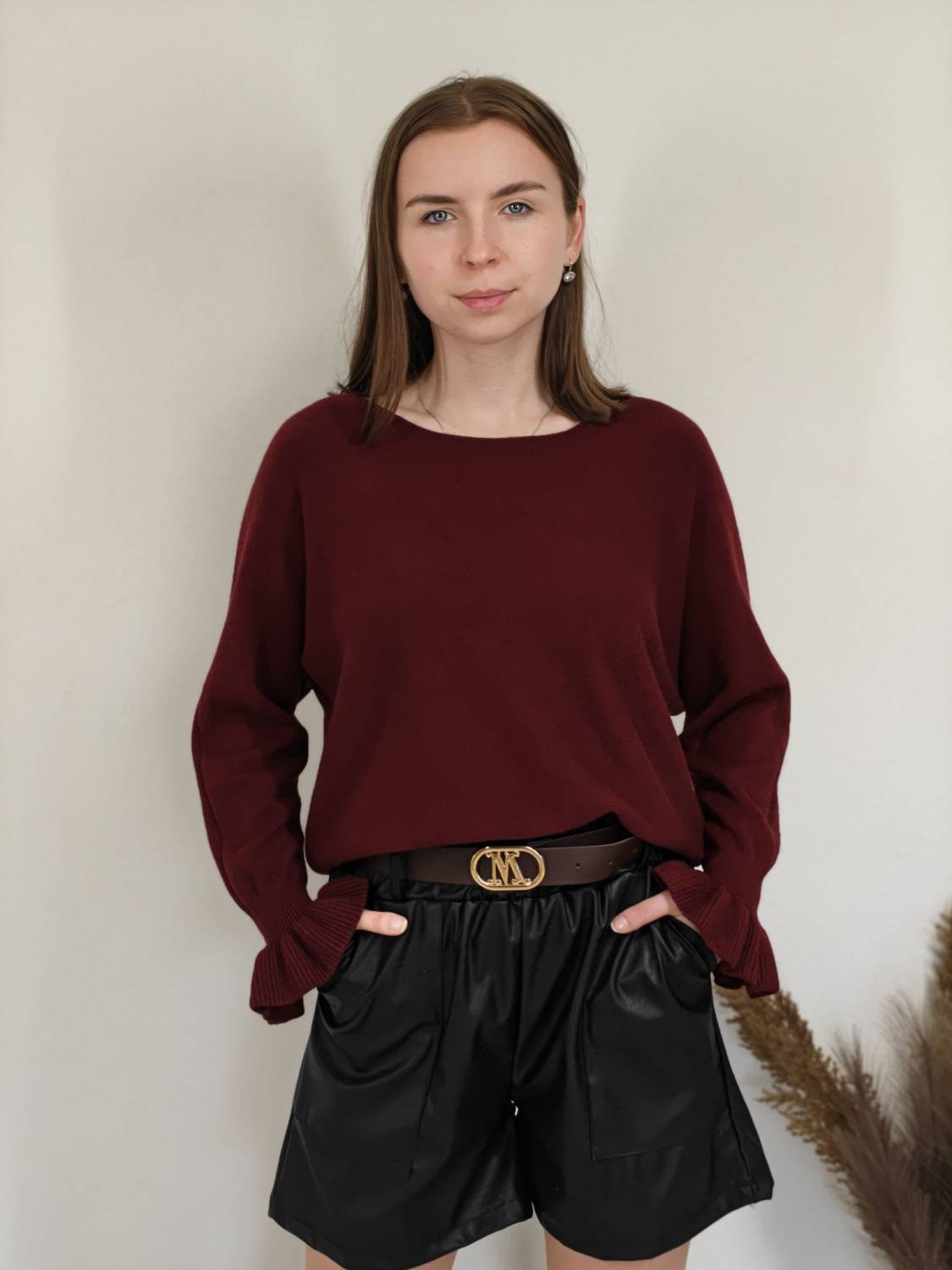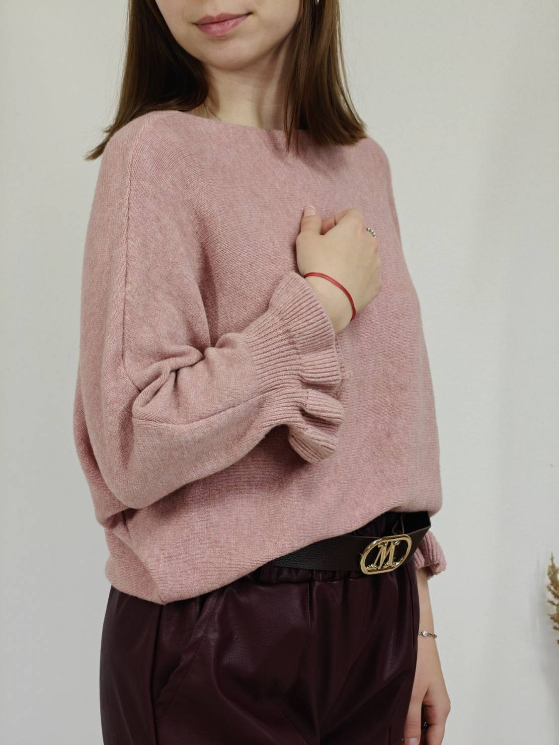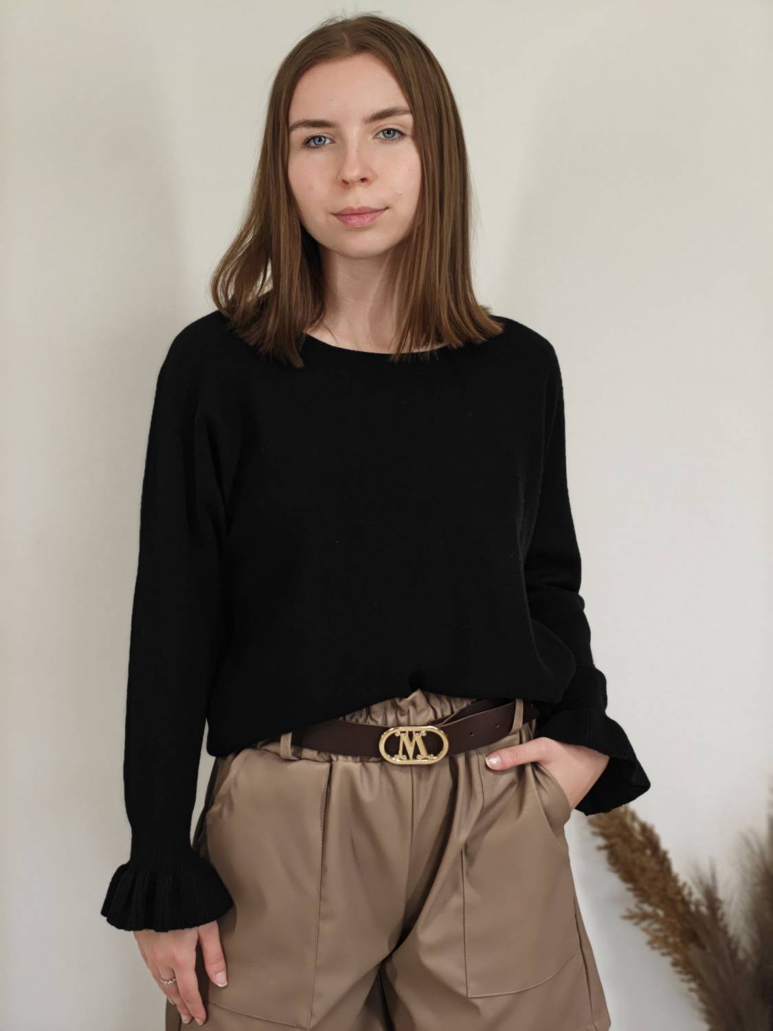 Jednofarebný pulóvrik s okrúhlym výstrihom a s volánom na rukáve.