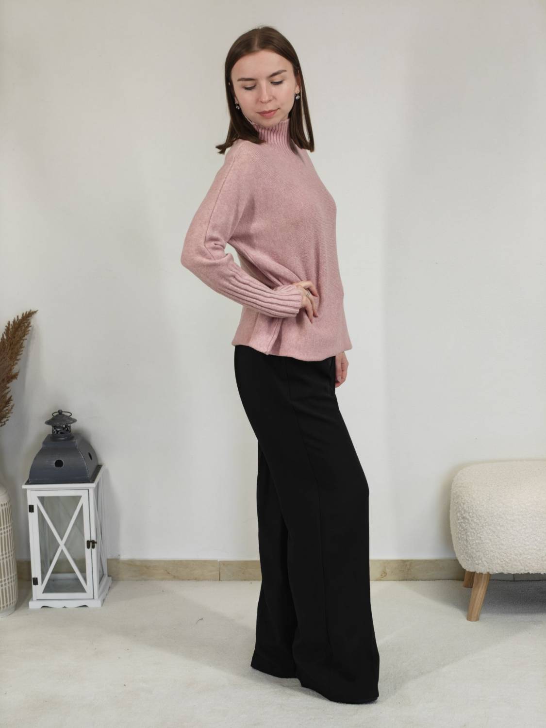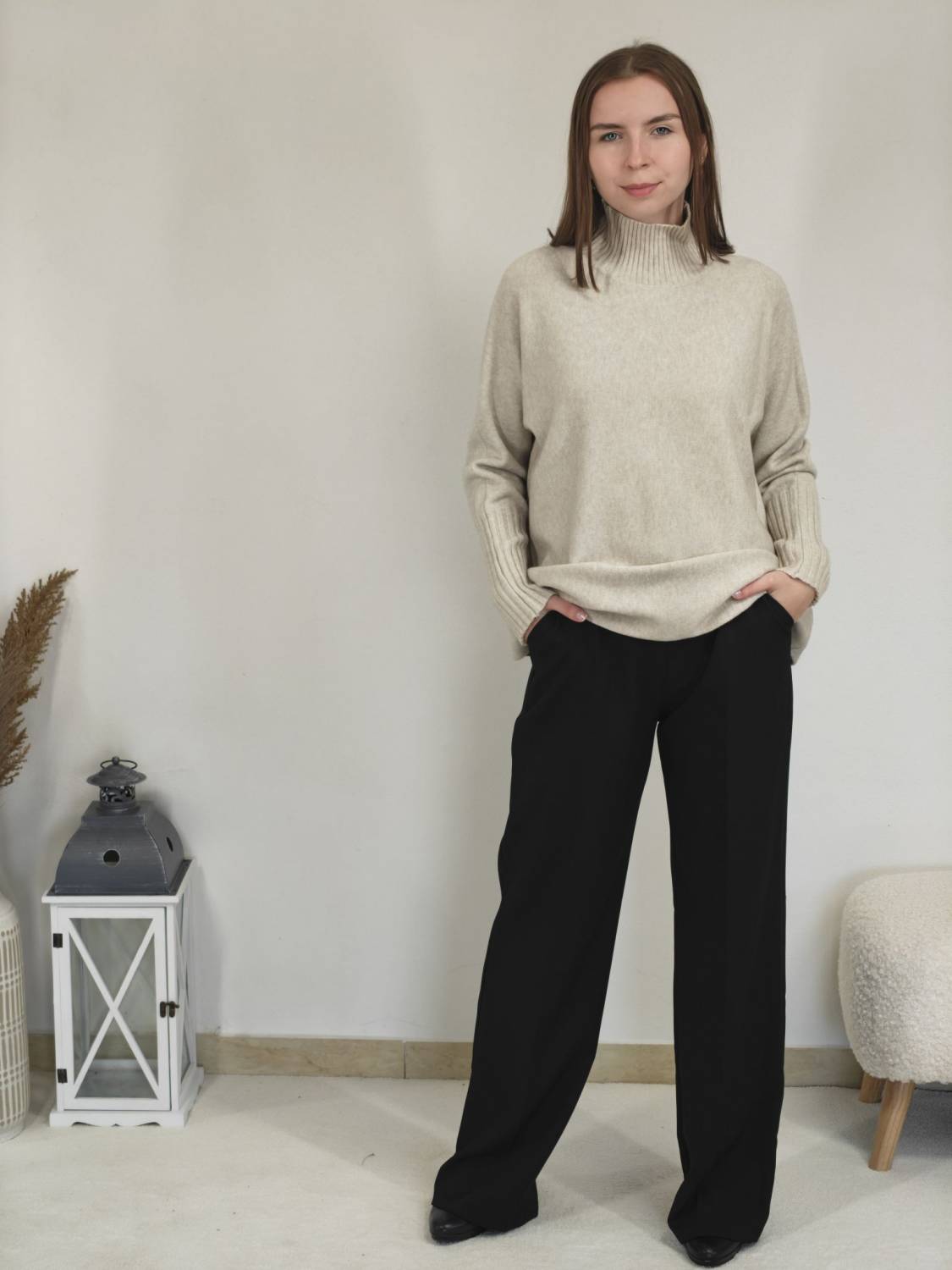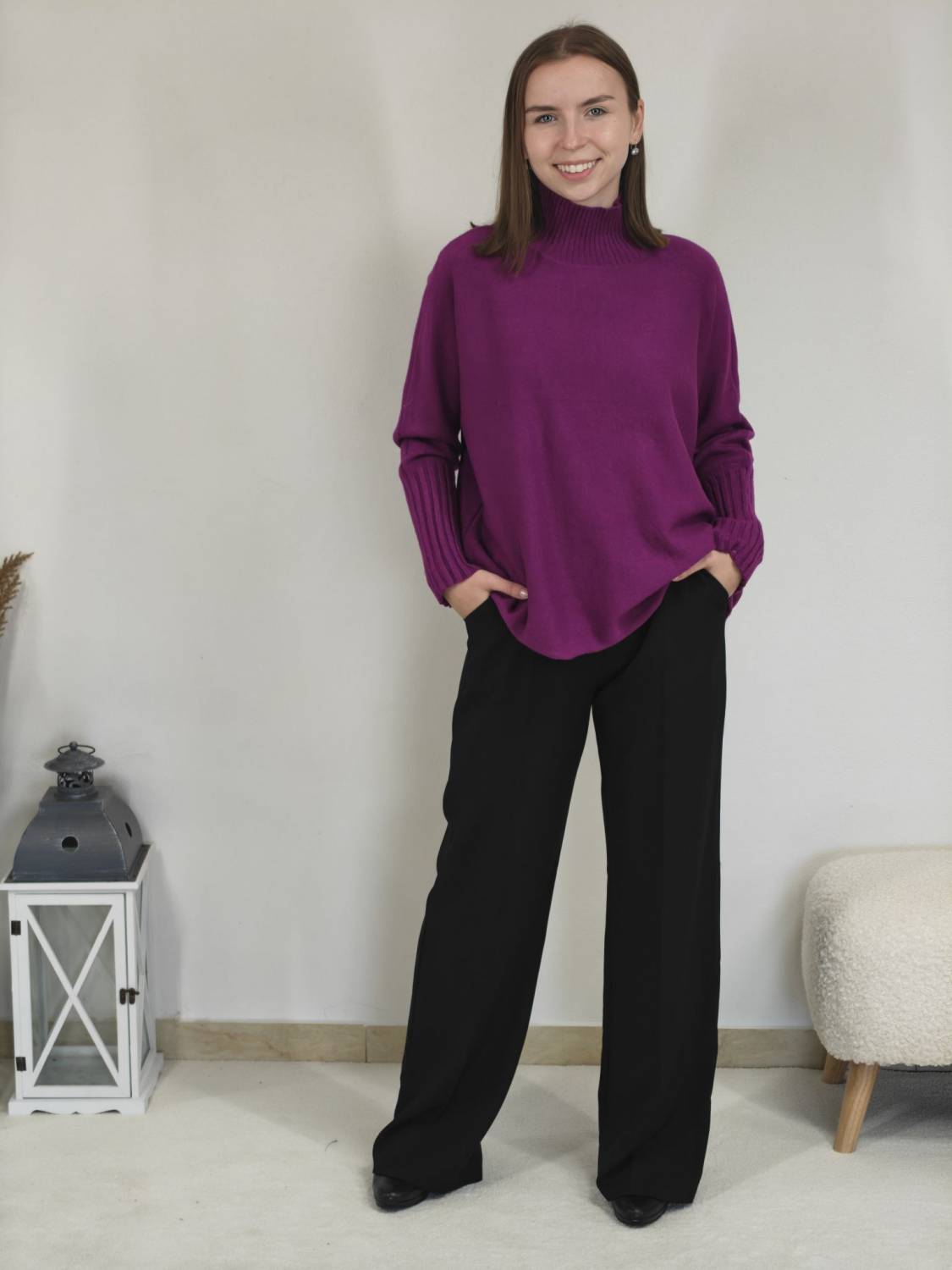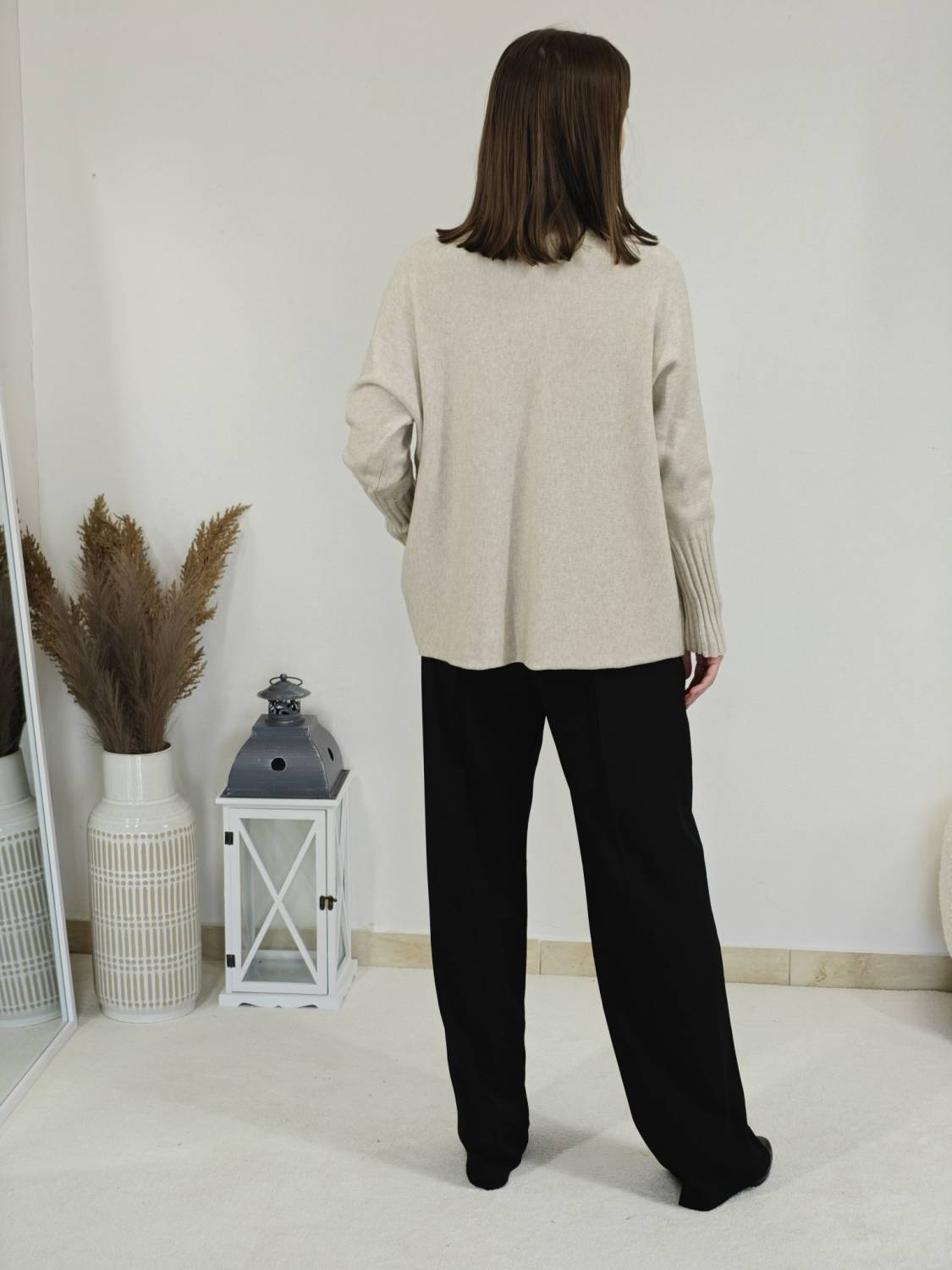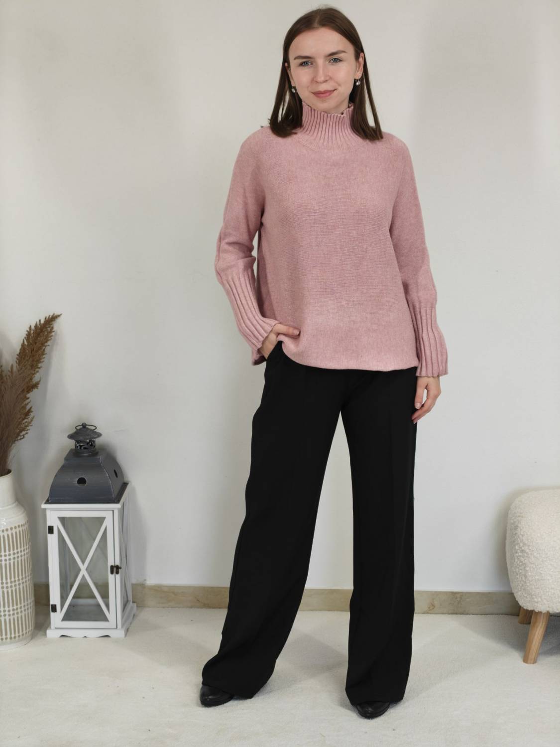 Elastický pulóvrik so stojačikom, voľnejšieho strihu, má zúžené patenty na rukávoch.