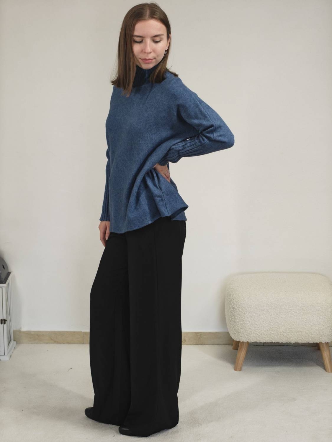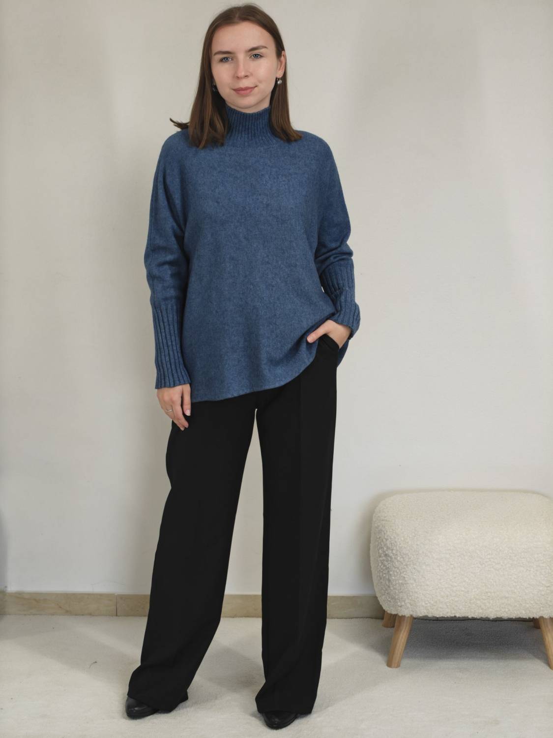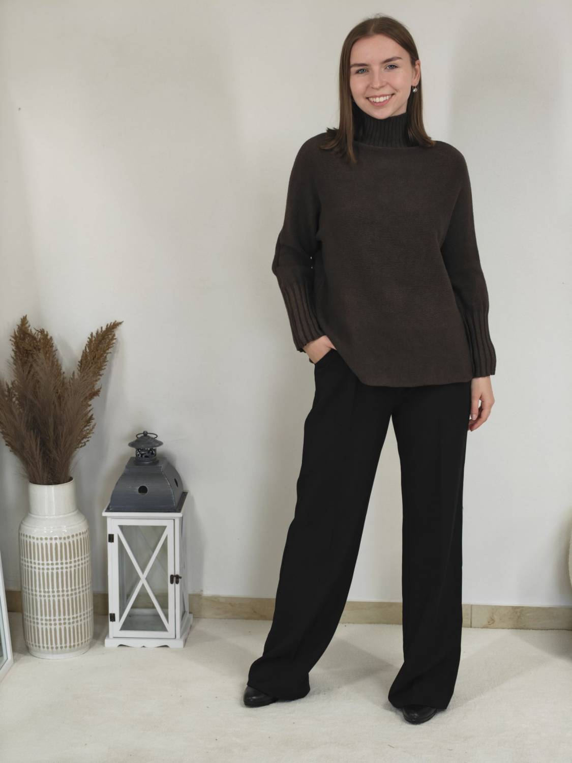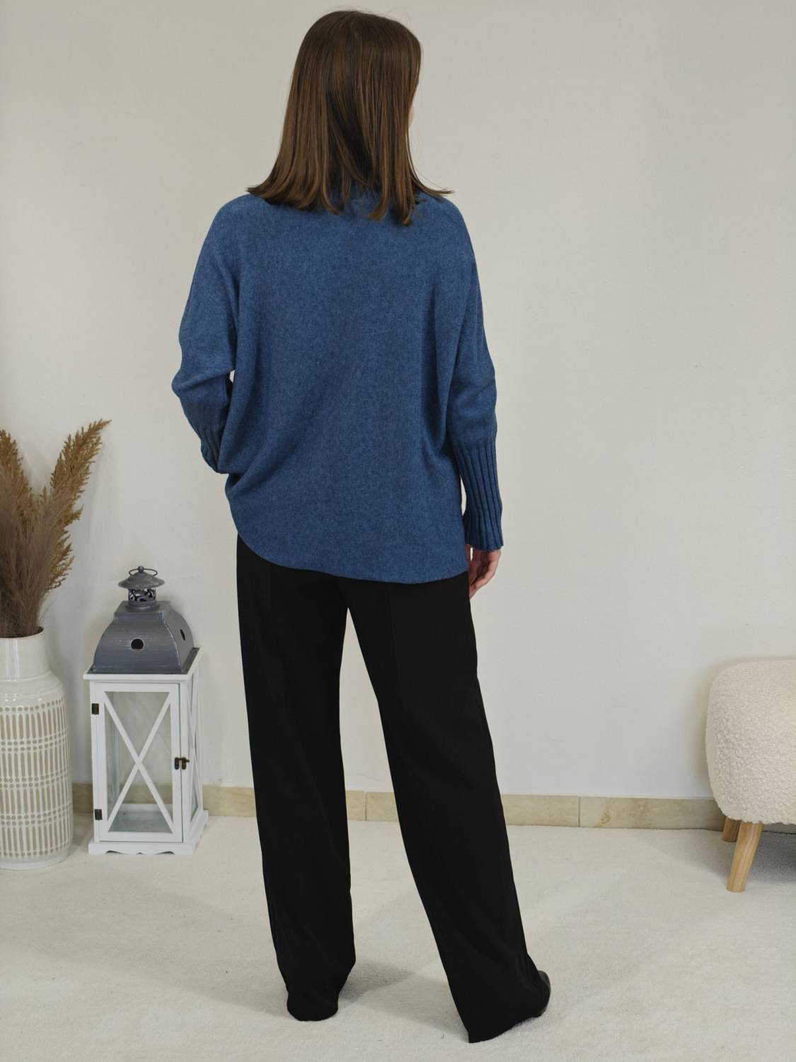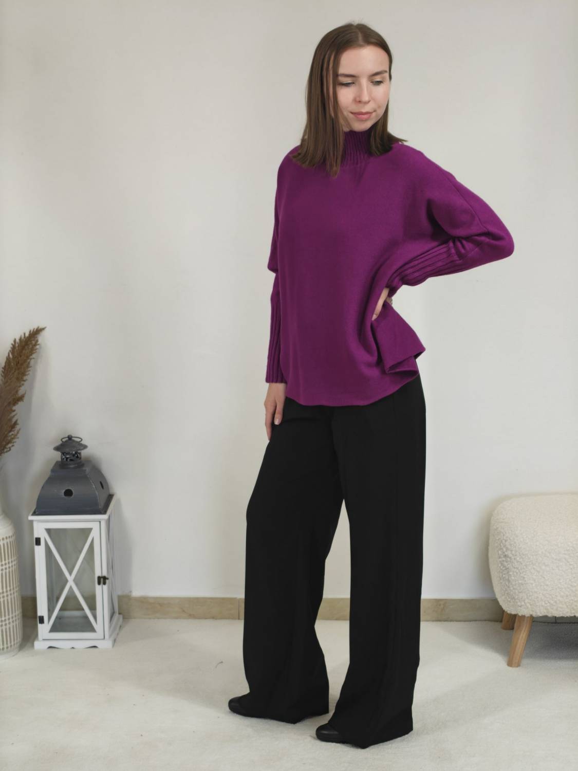 Elastický pulóvrik so stojačikom, voľnejšieho strihu, má zúžené patenty na rukávoch.