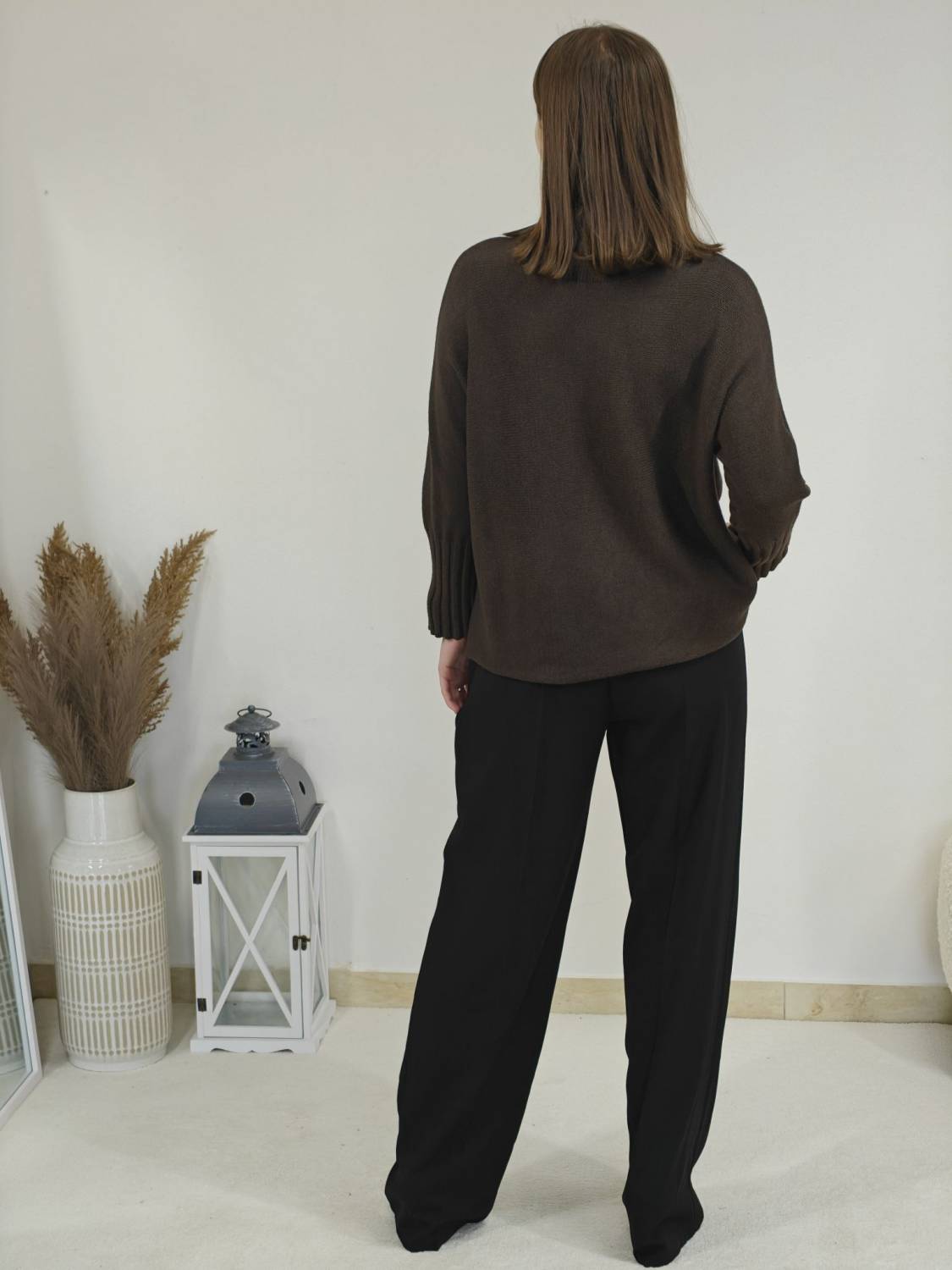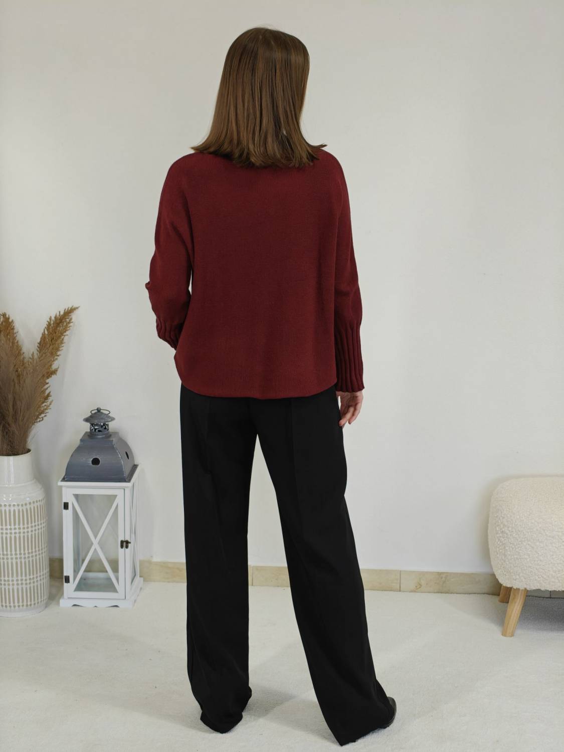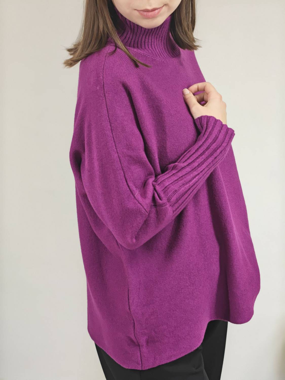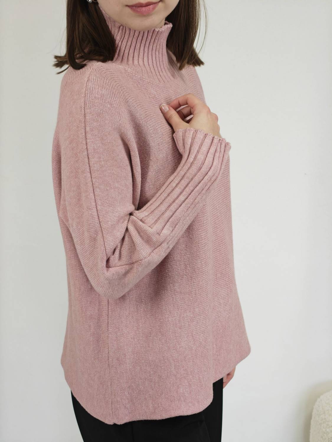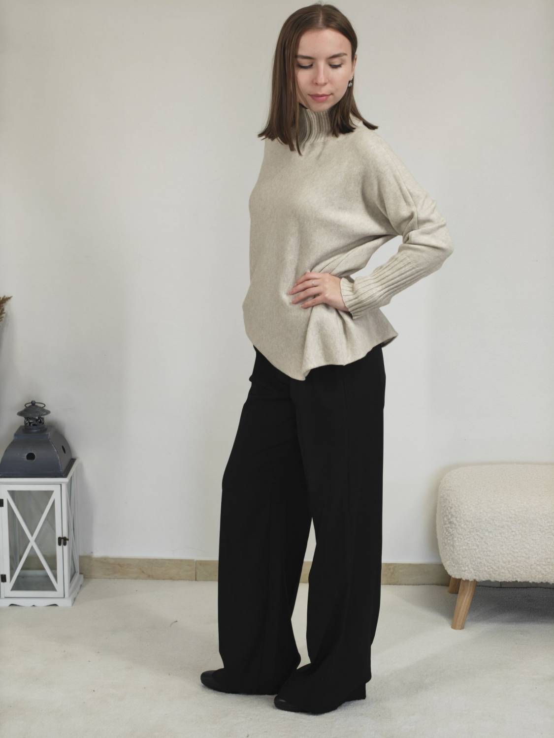 Elastický pulóvrik so stojačikom, voľnejšieho strihu, má zúžené patenty na rukávoch.