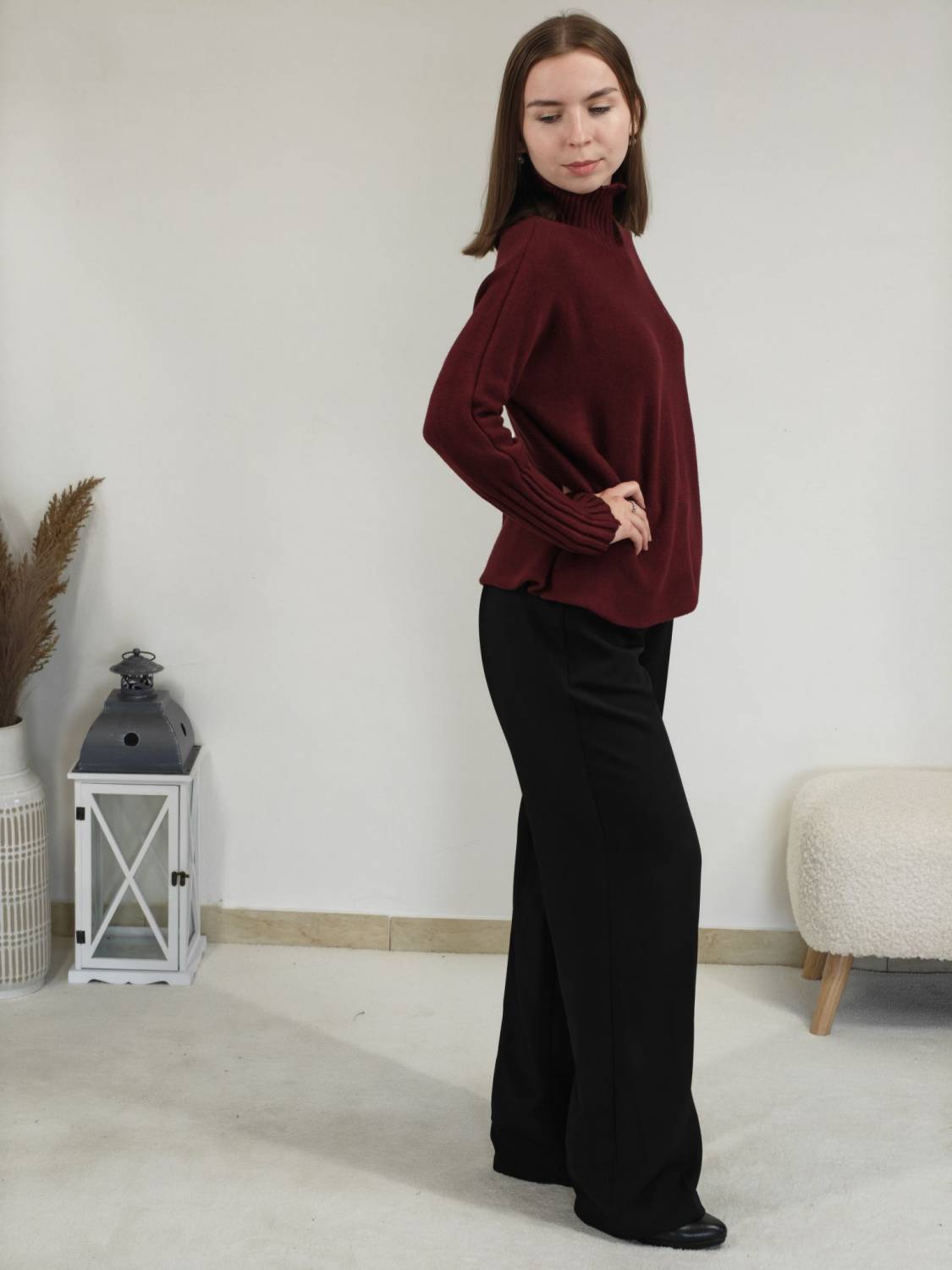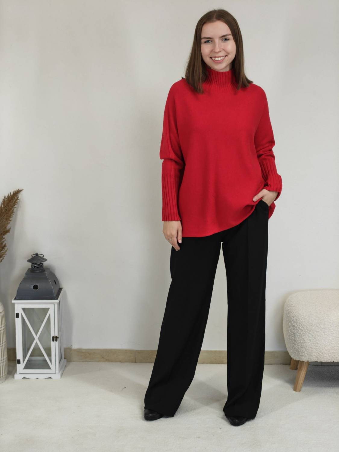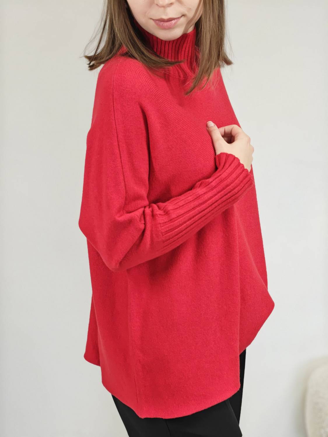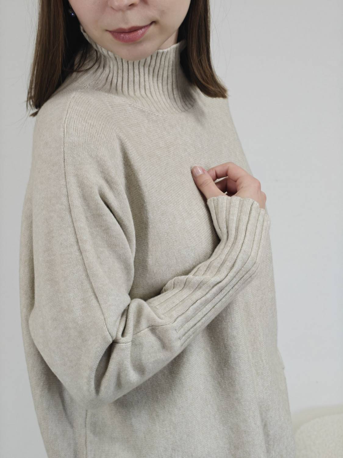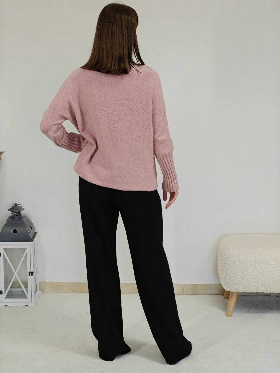 Elastický pulóvrik so stojačikom, voľnejšieho strihu, má zúžené patenty na rukávoch.
