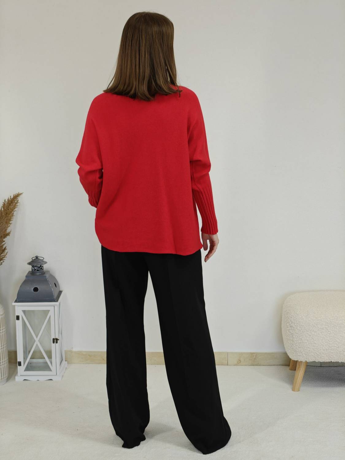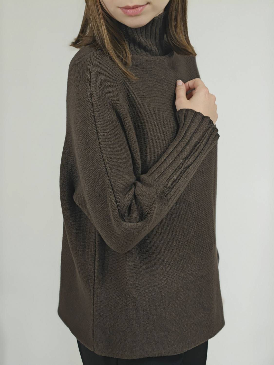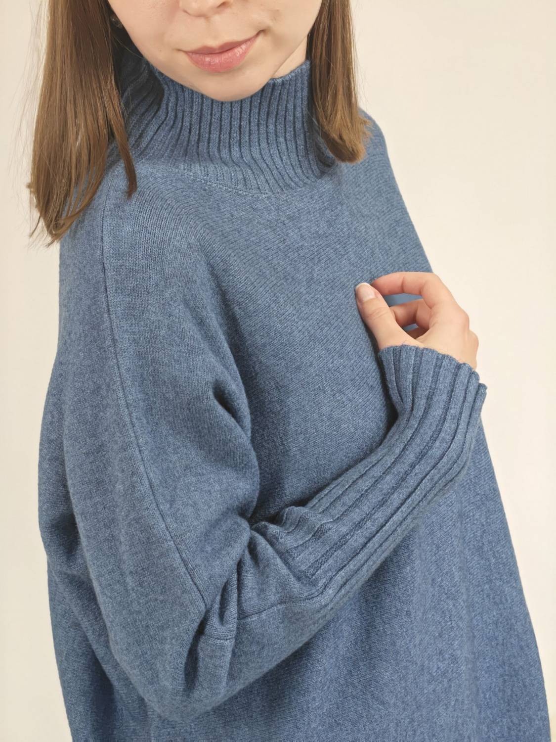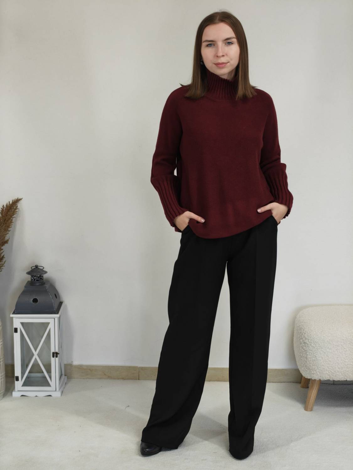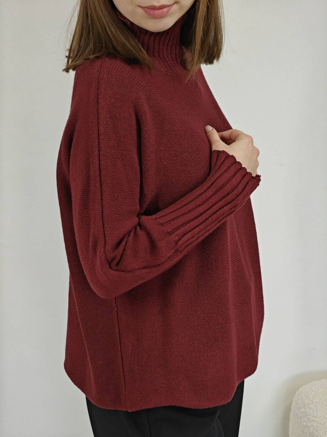 Elastický pulóvrik so stojačikom, voľnejšieho strihu, má zúžené patenty na rukávoch.