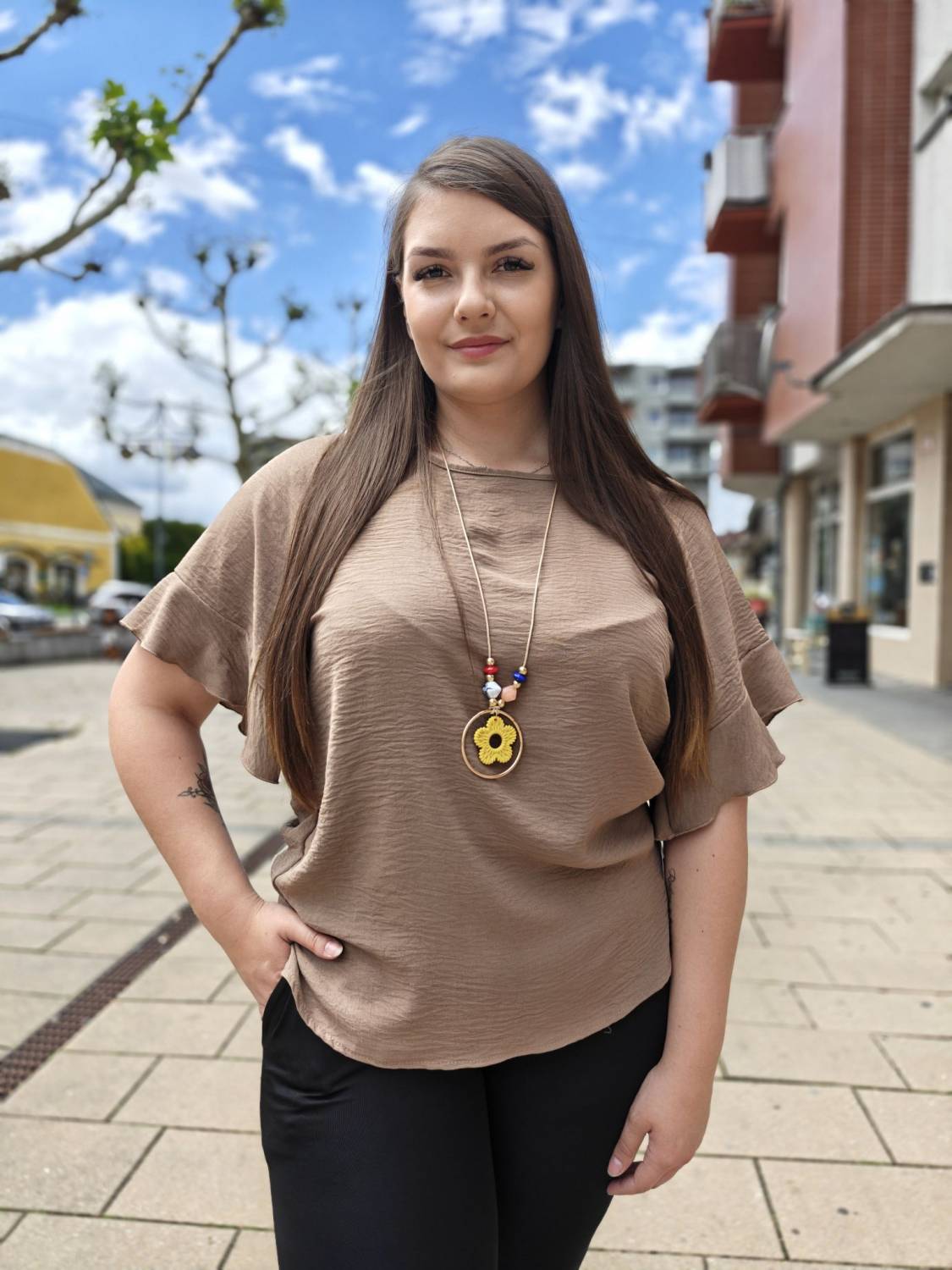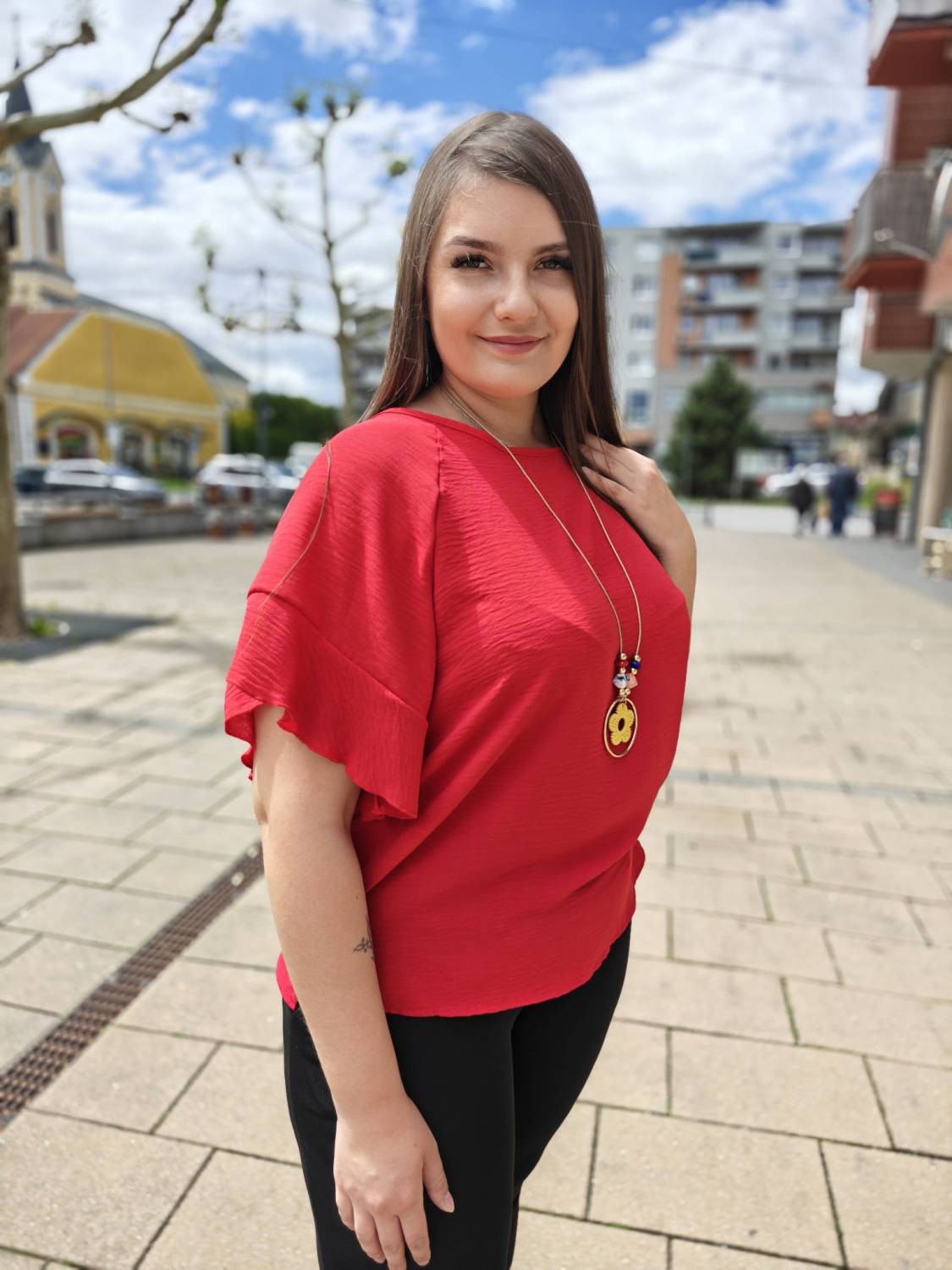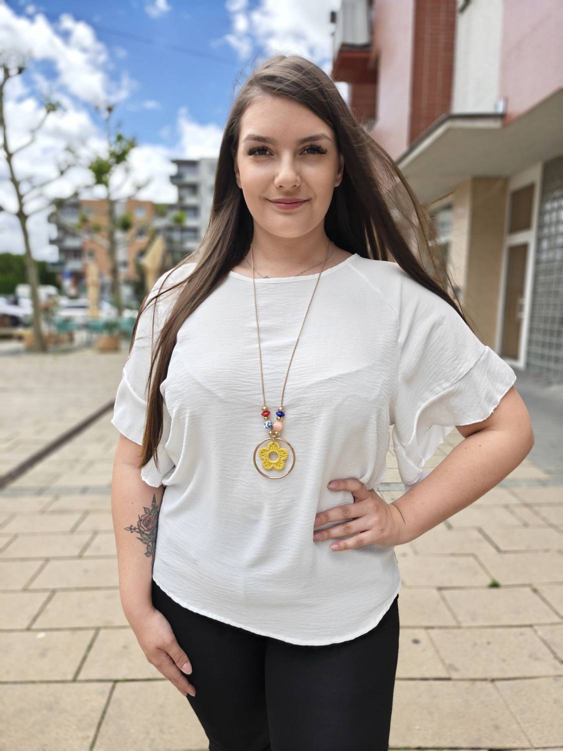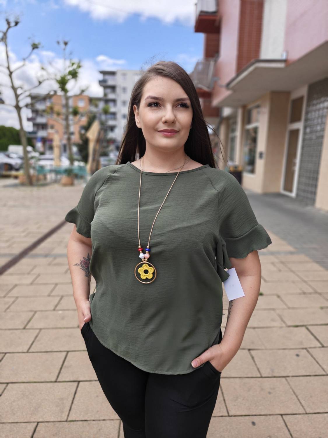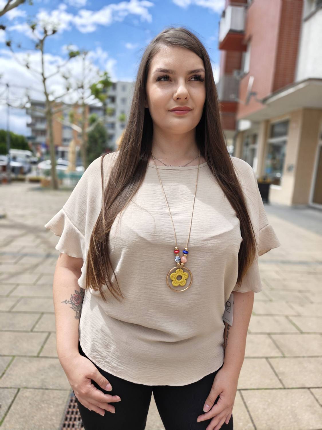 Jednofarebné tričko s volánom na rukáve. Súčasťou je aj bižutéria.