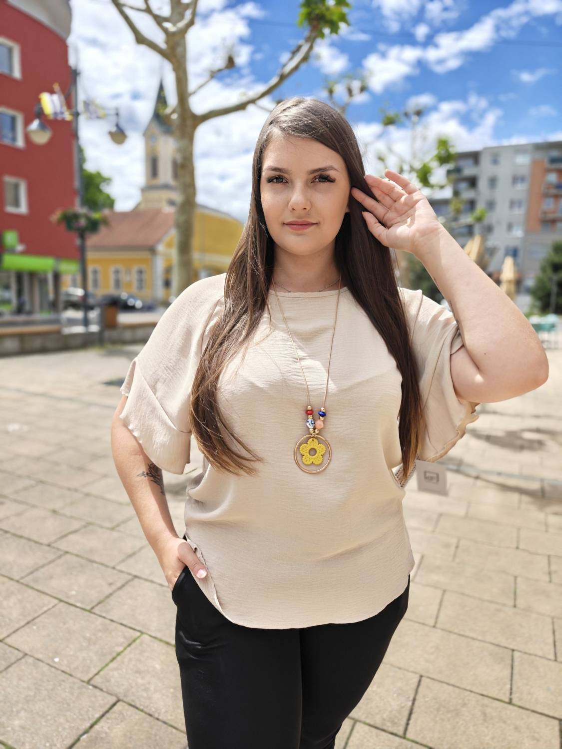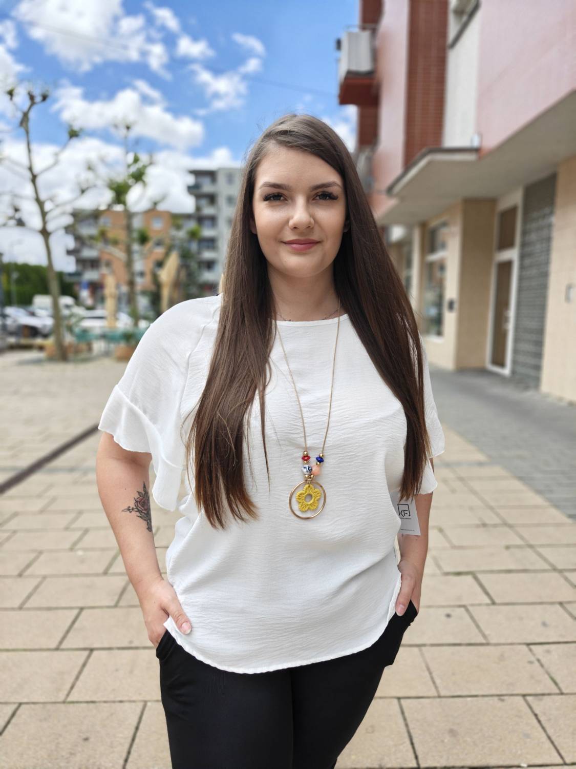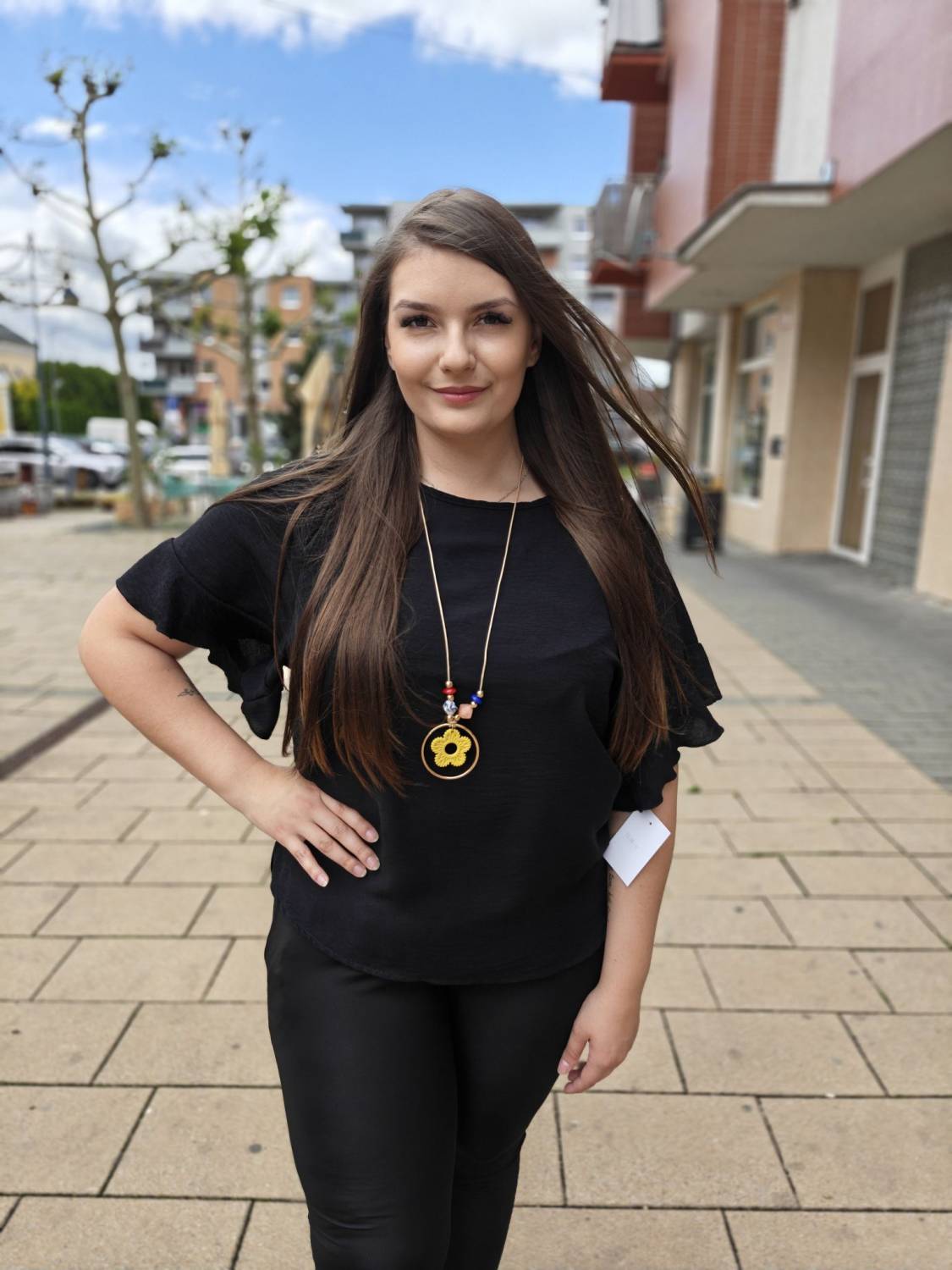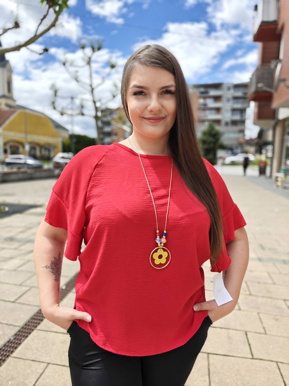 Jednofarebné tričko s volánom na rukáve. Súčasťou je aj bižutéria.