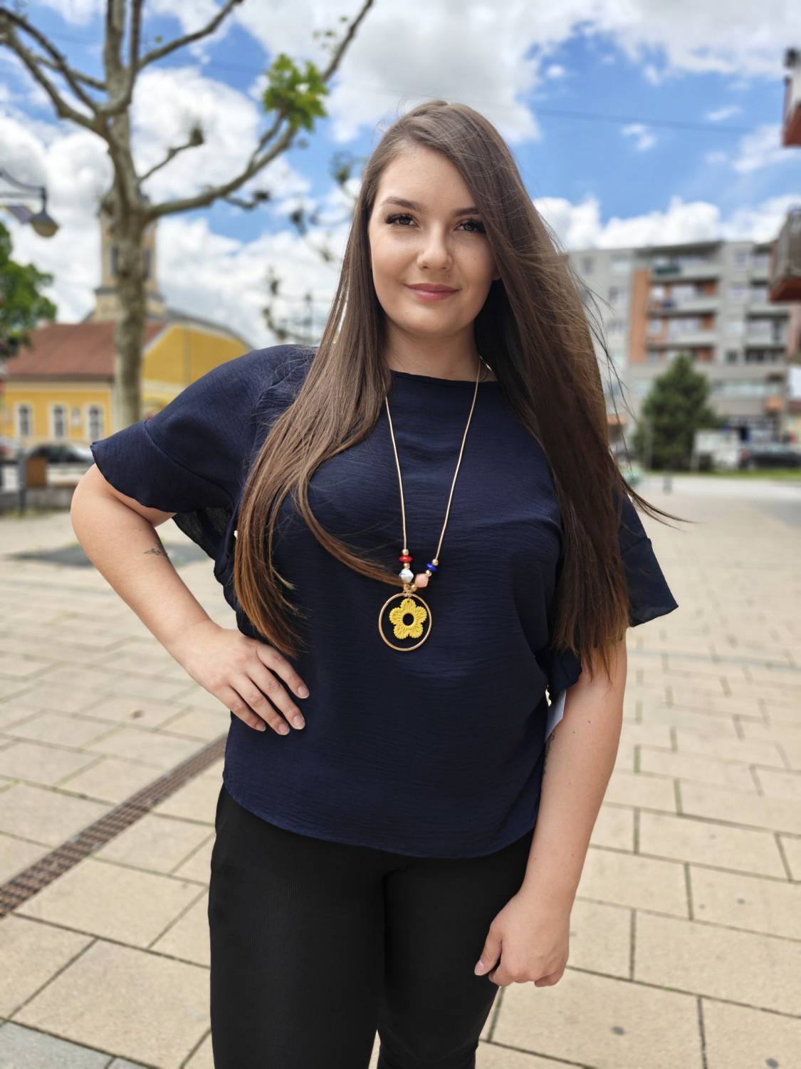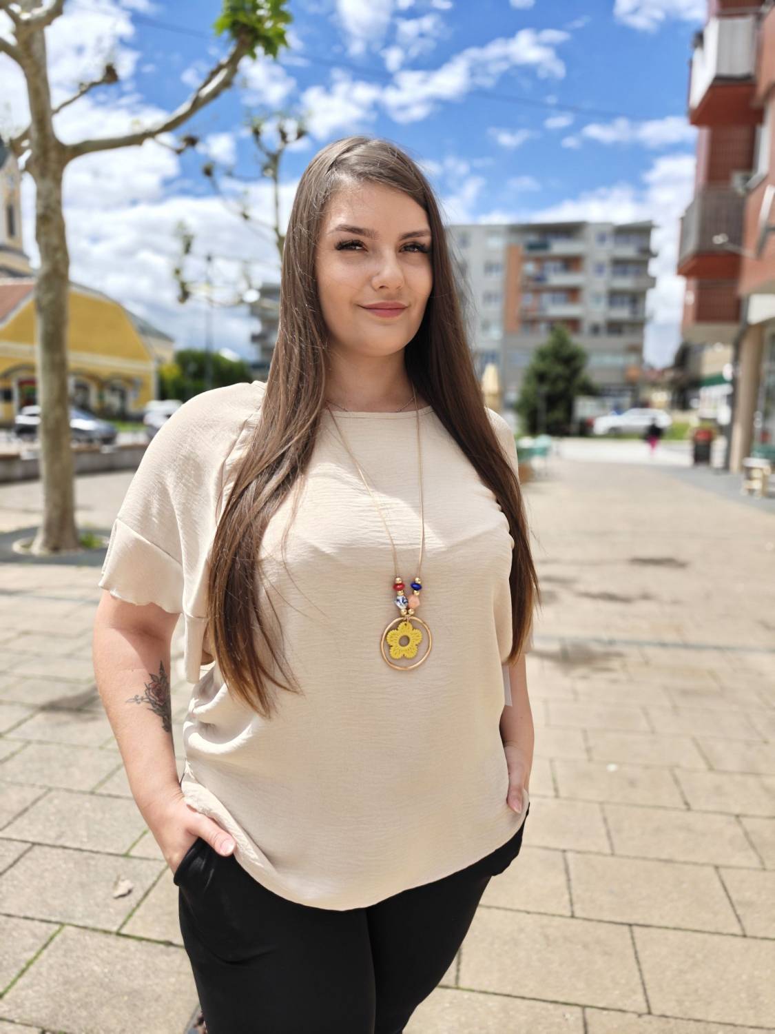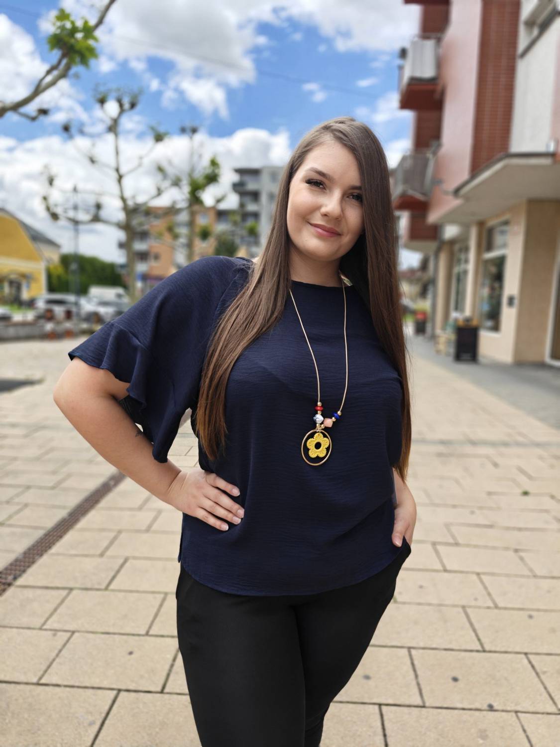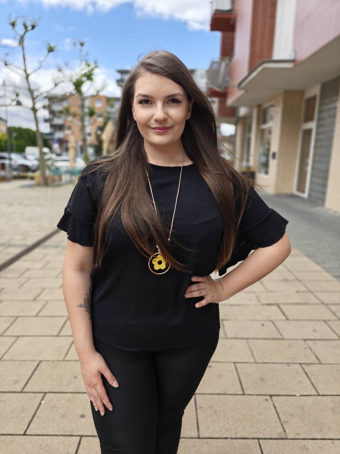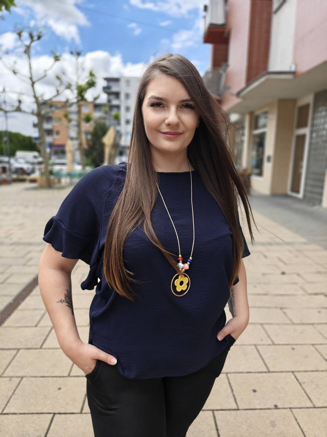 Jednofarebné tričko s volánom na rukáve. Súčasťou je aj bižutéria.
