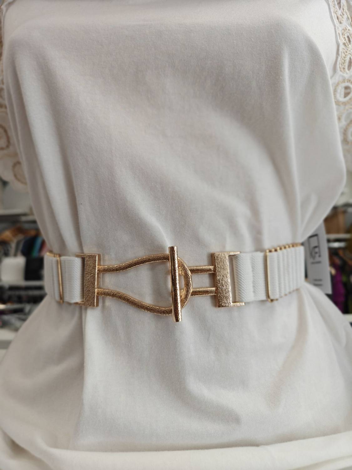 Tenký elastický opasok so zlatou prackou.